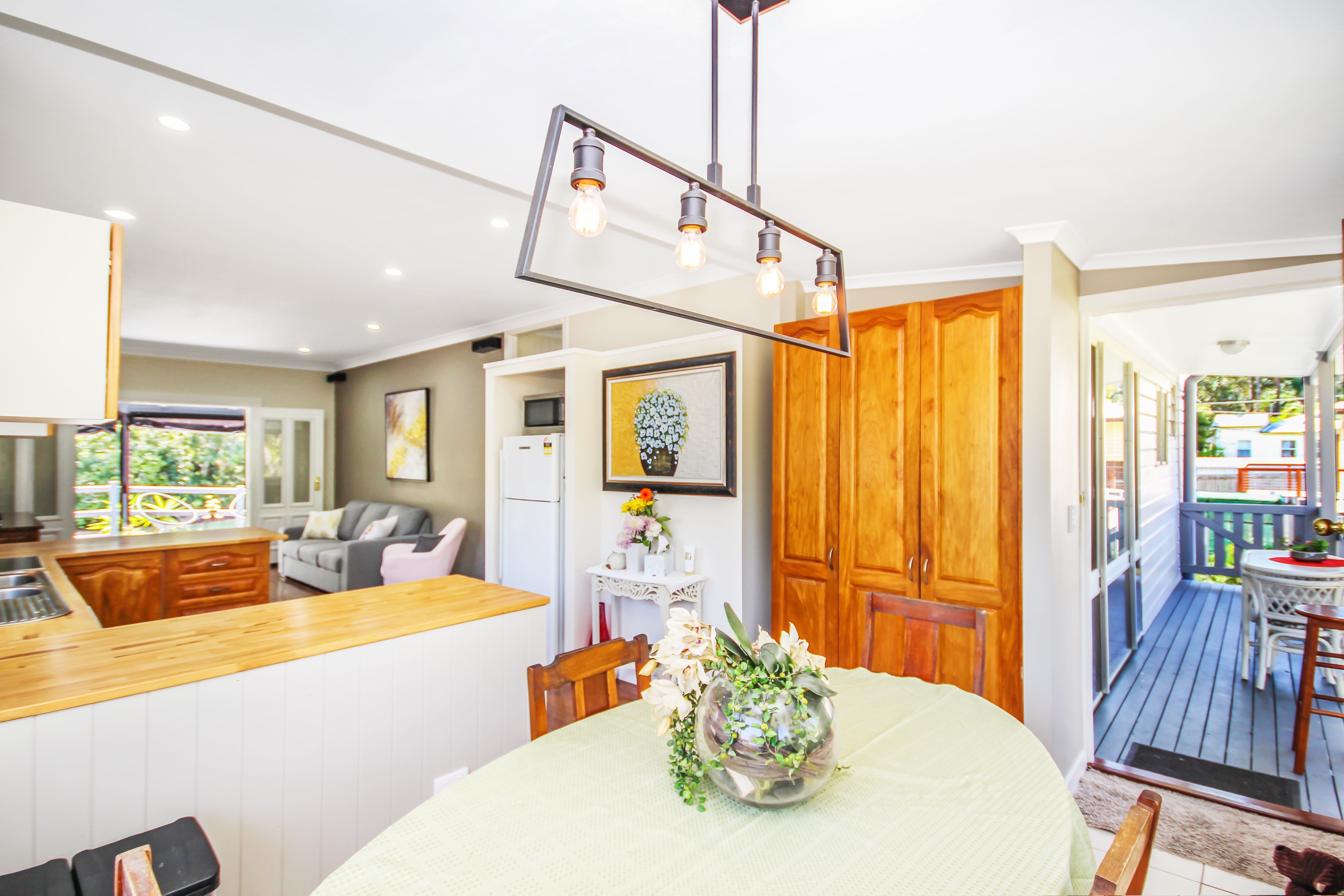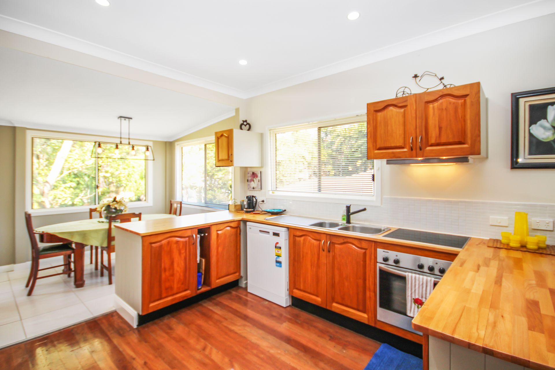 > Family friendly kitchen with timber bench tops and modern appliances