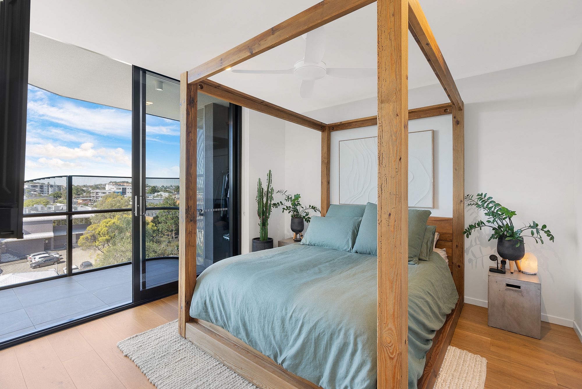 Once inside the palatial master bedroom, you are in another dimension. So much space to enjoy and revel in, with the splendour of the views provided by the floor to ceiling glass doors opening directly onto a separate private corner of the balcony. You enter the elegant ensuite through a large walk-in wardrobe. The chic bathroom has modern black tones in the tap wear over the vanity and shower and the built in shelving adds style and storage convenience.