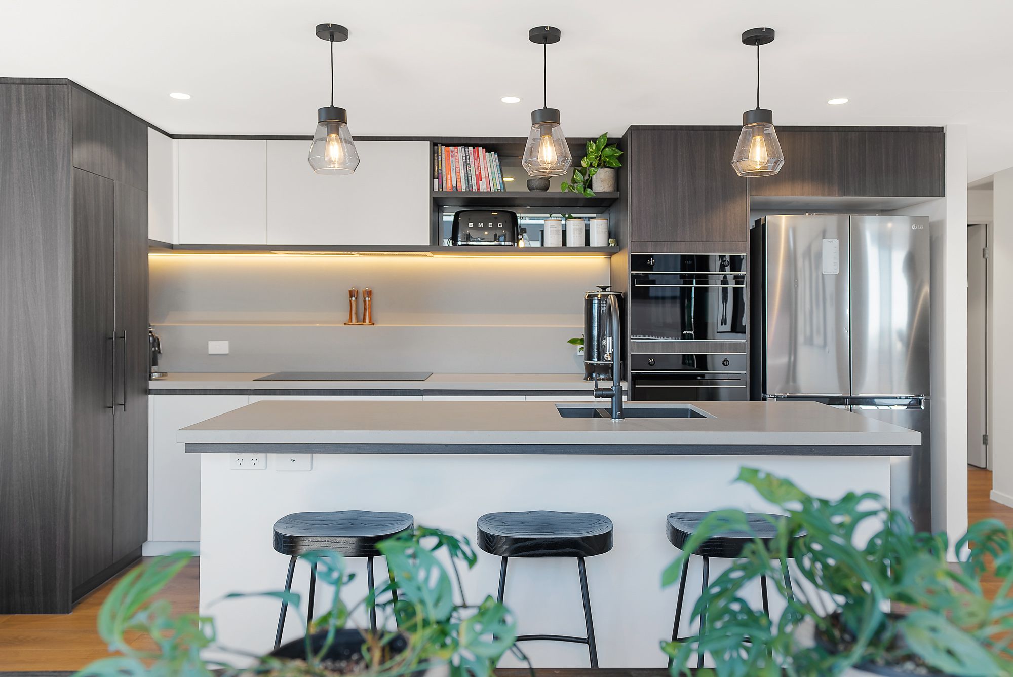 The designer kitchen features stylish down lights over the large kitchen bench and breakfast bar with striking black tapware. It boasts expansive storage and overhead cupboards as well as high quality European appliances, including a SMEG bench top stove and double wall oven.