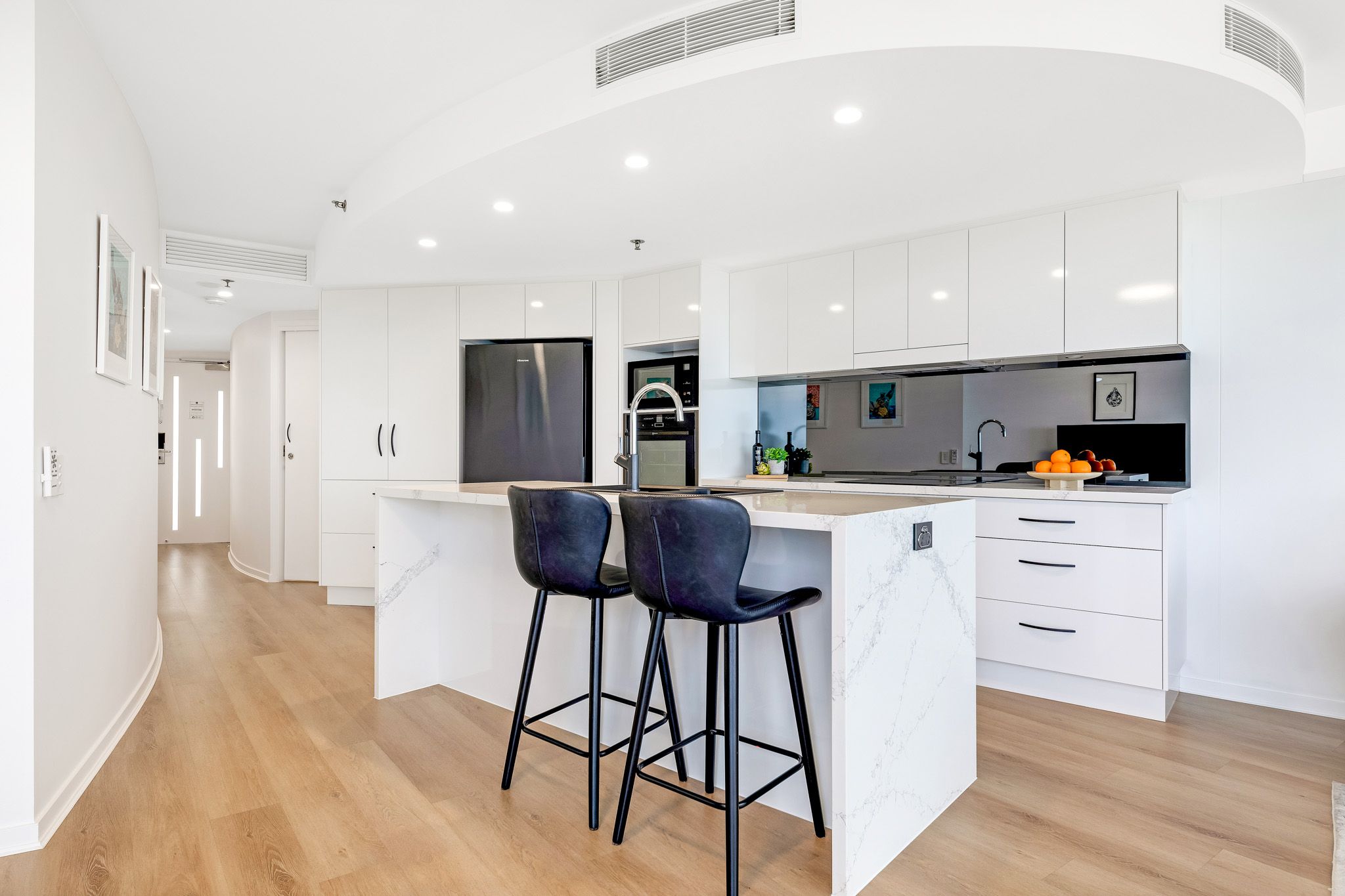 The two-bedroom, two-bathroom unit has been designed with the backdrop in mind, showcasing a wall of glass and sliding doors to ensure the ocean vistas can be enjoyed from every aspect of the open-plan living, dining and kitchen areas.