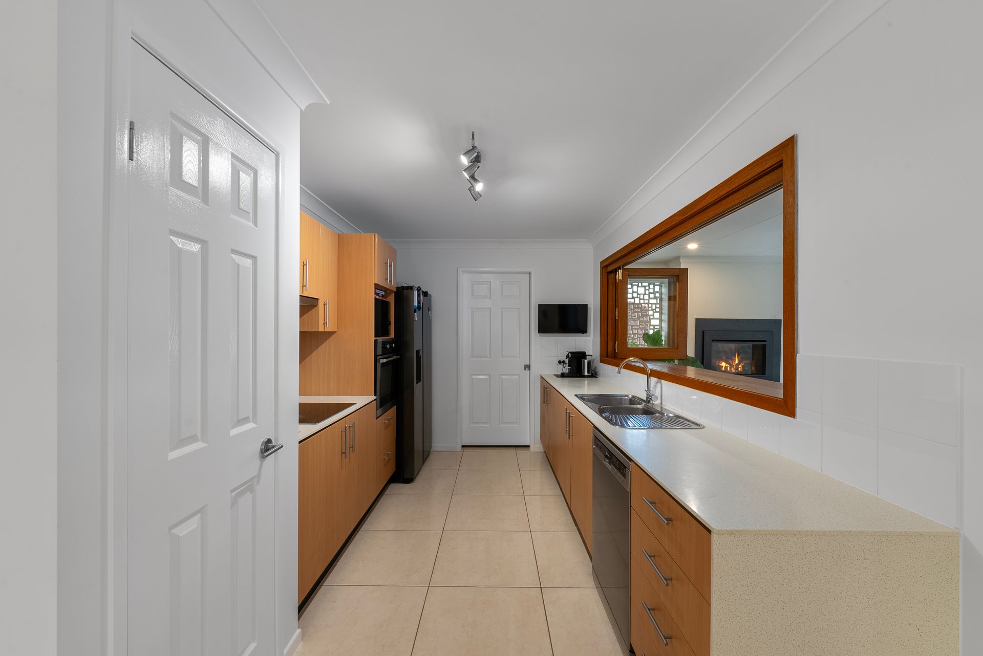 • Spacious Kitchen with a white speckled benchtop and wooden cupboards, a walk In pantry and a second pantry for plenty of storage. A bifolding wooden window opens up to a stunning breakfast bar overlooking the outdoor entertaining area
