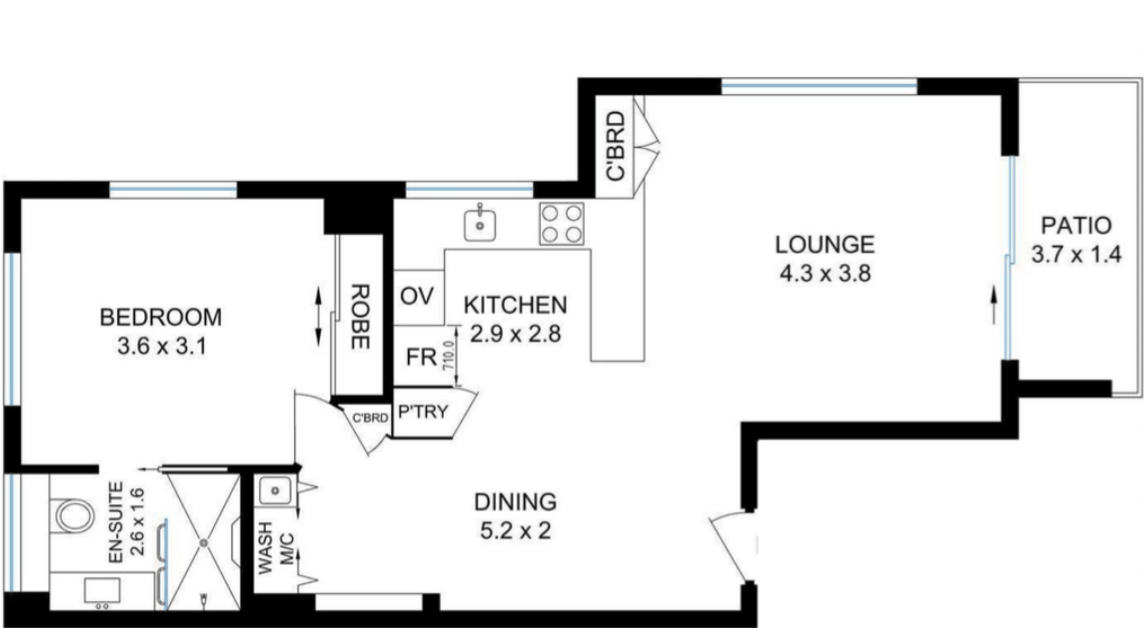 • 1 generously sized bedroom with built-in wardrobes
