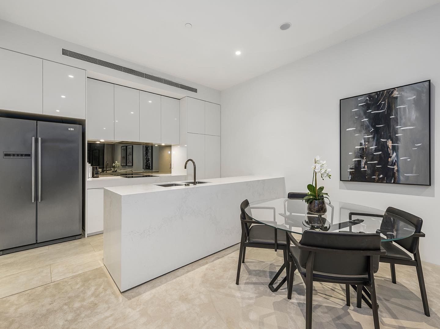 Internal features include: • Exuding character with a theater-designed entrance and arched doorway • Ducted air-conditioning throughout with individually zoned controls • Commodious open plan living with ambient natural lighting • Highly sought-after travertine tiles throughout the kitchen, bathroom, and laundry • Contemporary-styled kitchen with stone benchtops, matte finishes, high-gloss cabinetry, and mirrored splashbacks • Smeg European appliances, including dishwasher, conventional oven, and induction cooktop • All bedrooms equipped with day-to-night block-out curtains and luxurious durable plush carpeting, plus walk-in robes and ensuites • Bathrooms feature floating stone vanities, glass-encased rainfall showers, and floor-to-ceiling tiles • Separate laundry room with plentiful cabinetry and bench space, ensuring no shortage of storage • Downlights, intercom, premium fixtures and finishings, plus an abundance of space and attributes • In priority placement are one basement car space plus storage cage with direct access via lift
