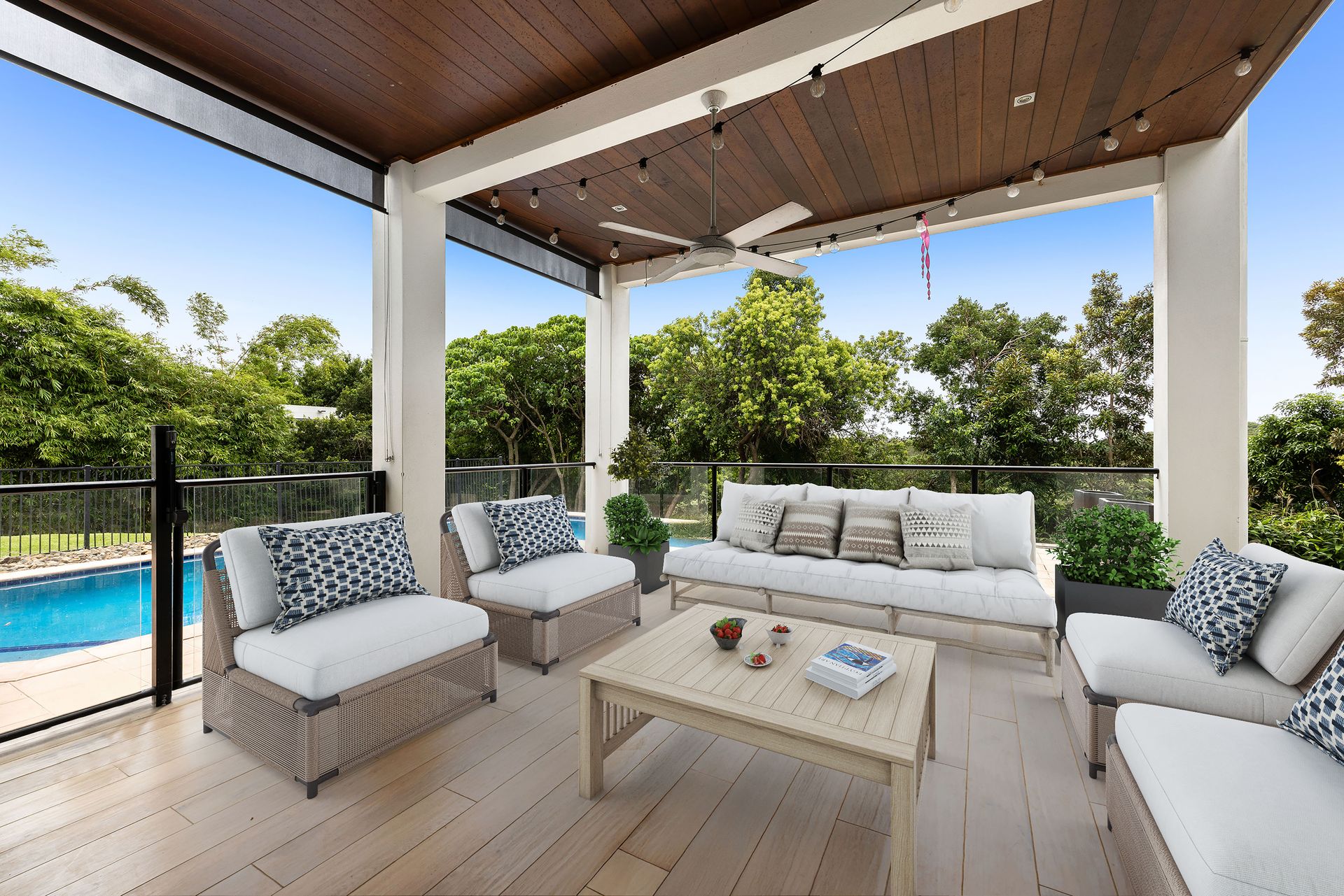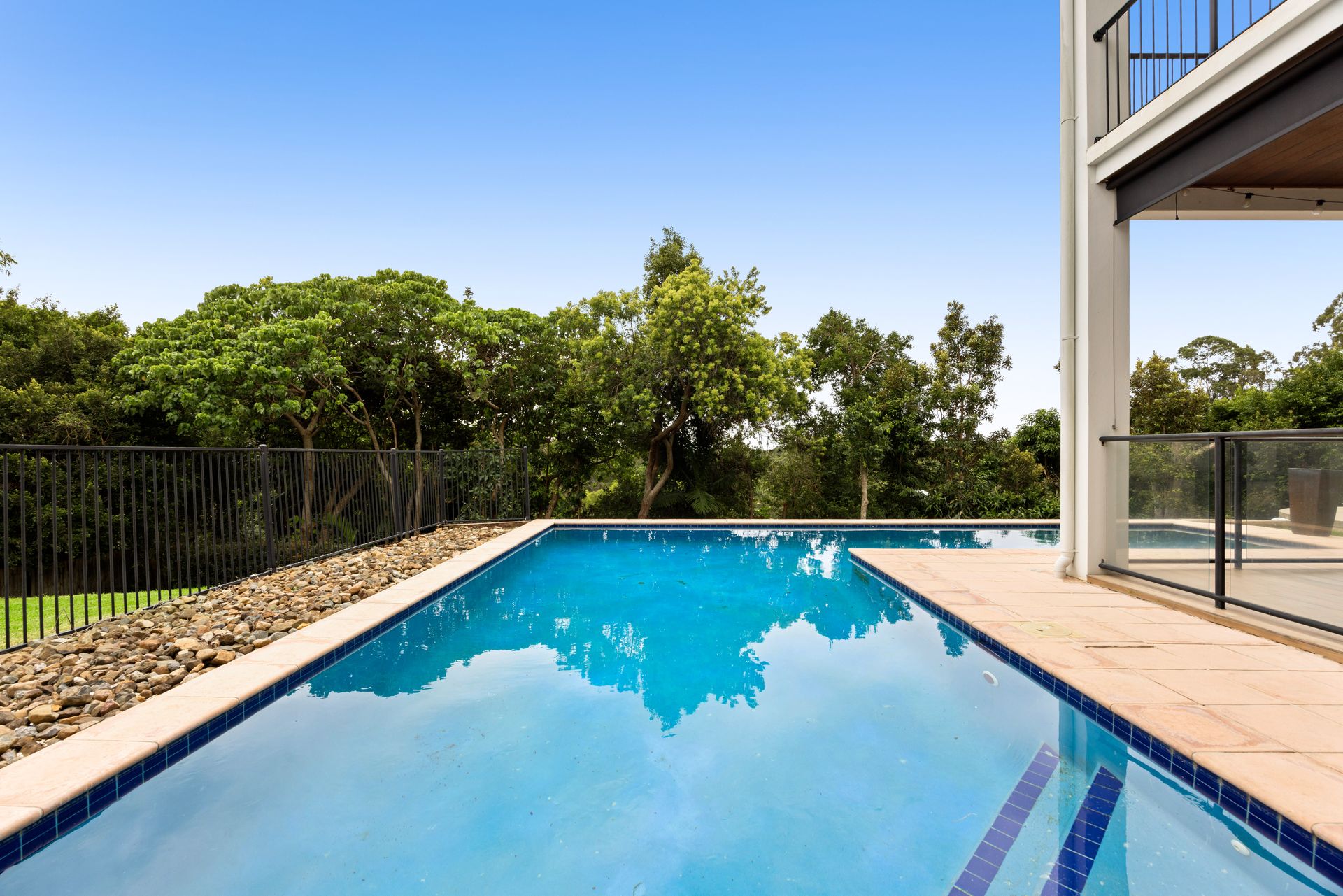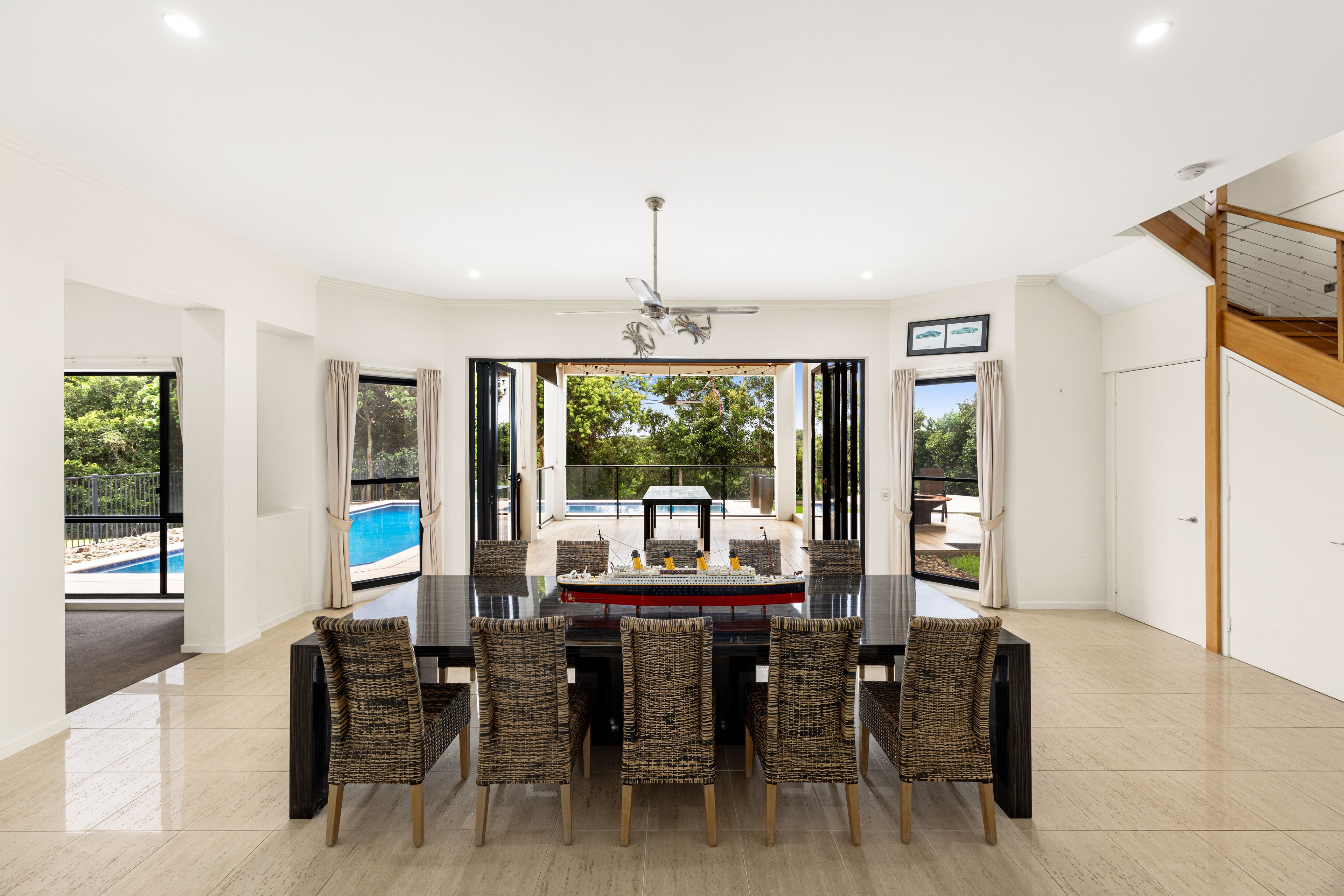 The m travertine flooring and striking stone feature wall set the stage for a home designed to impress. Expansive floor-to-ceiling windows in the media, living, and dining areas capture breathtaking views of the outdoor oasis and infinity pool, bringing the natural beauty of this north facing 2,000sqm block inside.