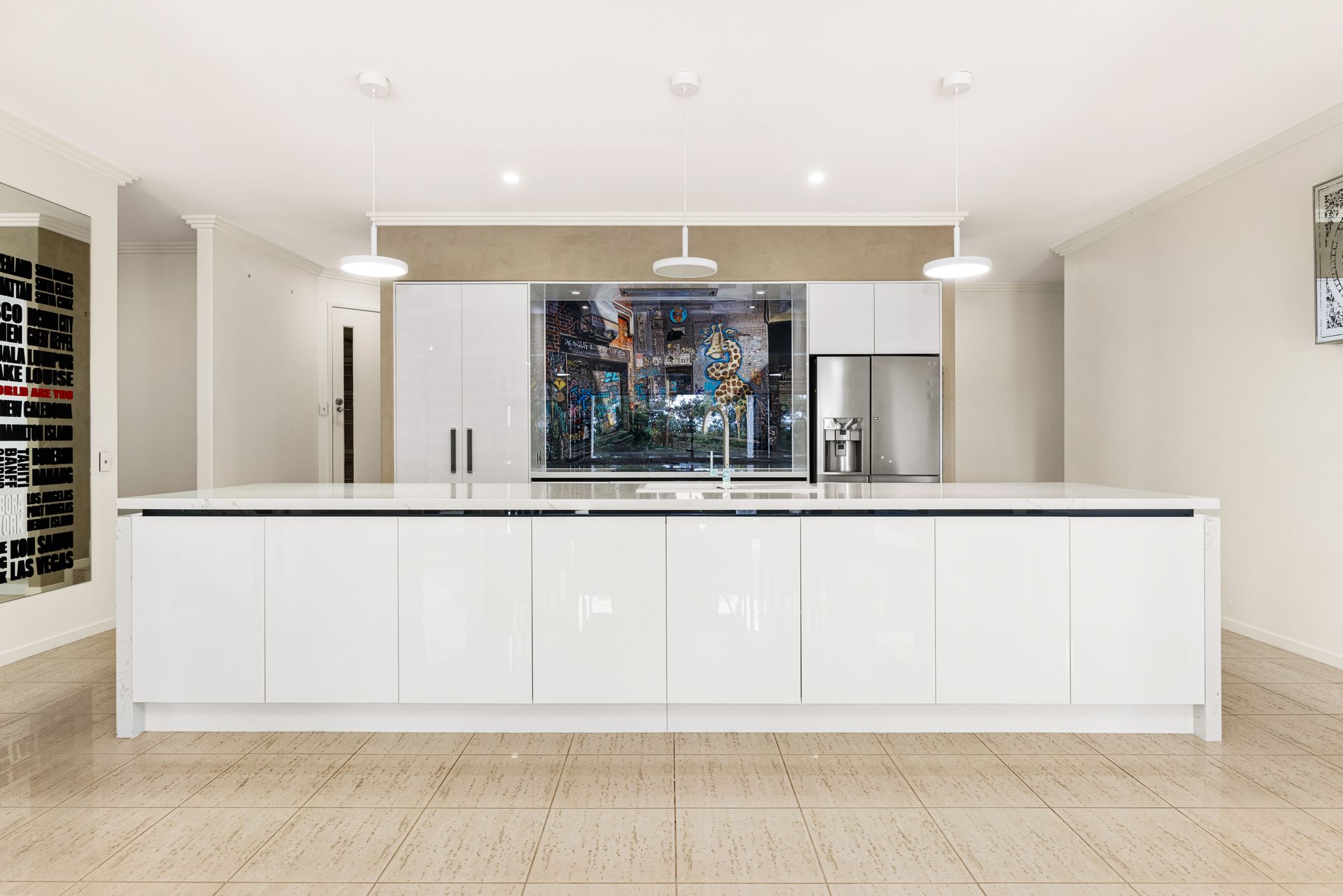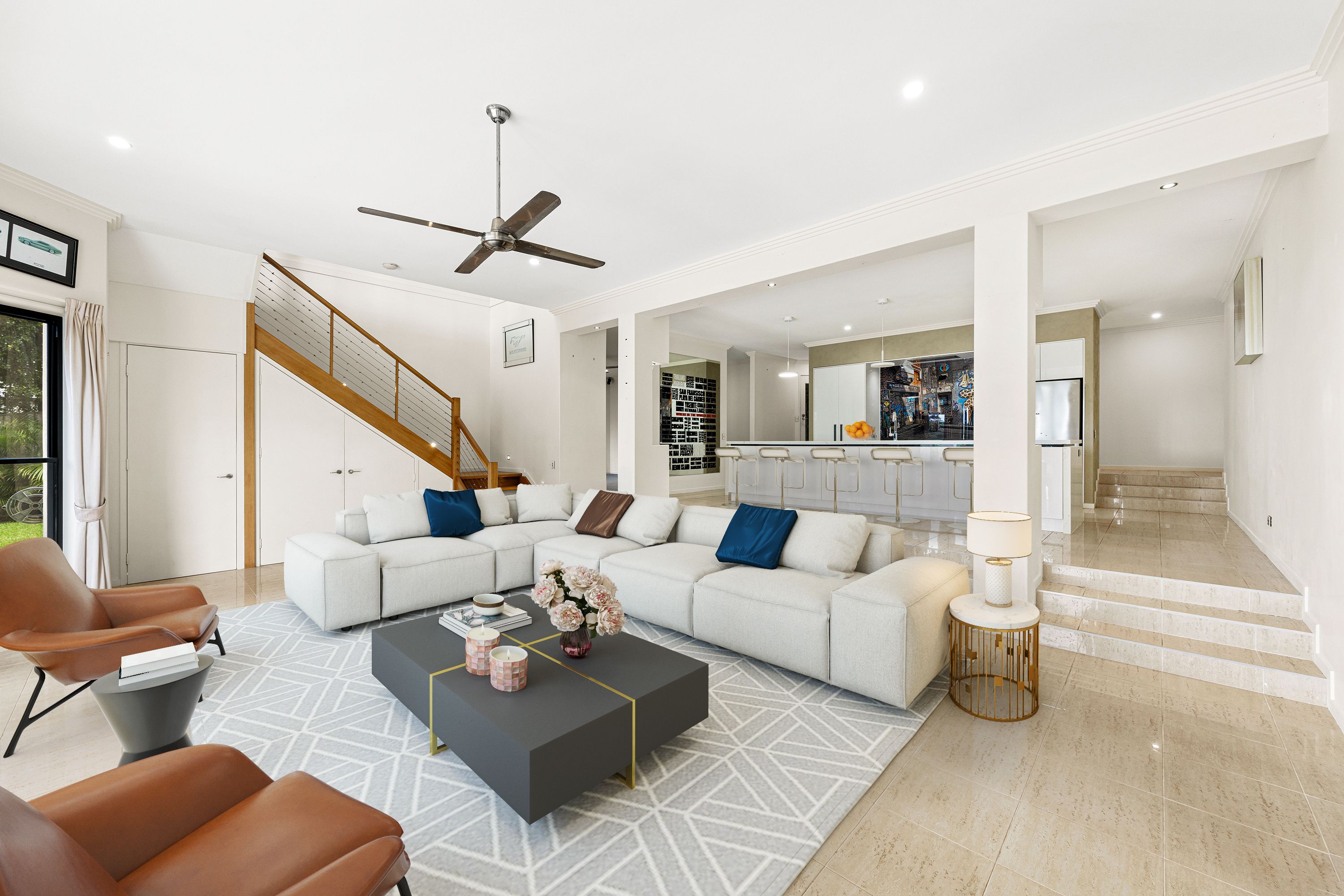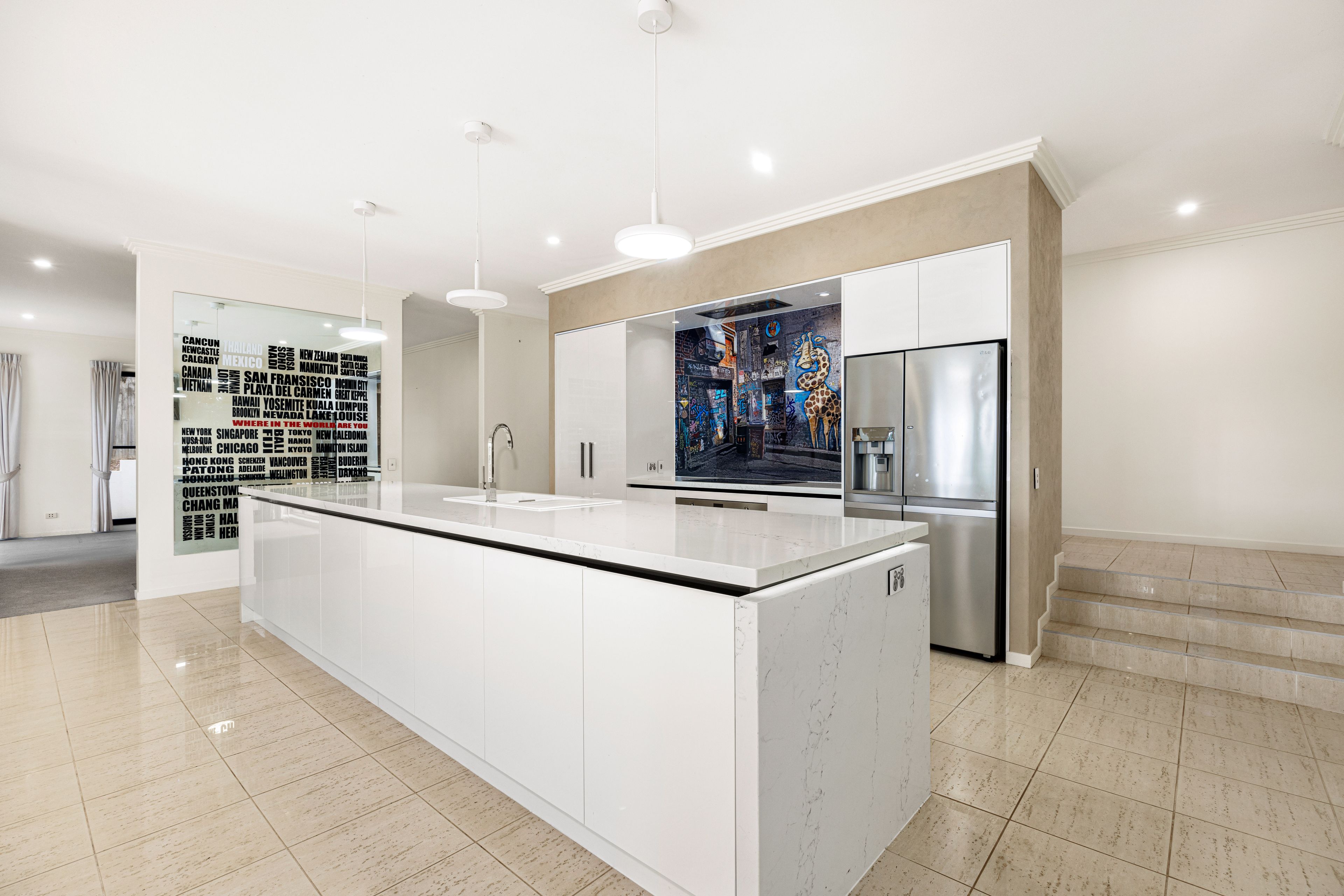 A sunken living and dining area creates a dynamic, multi-level space perfect for entertaining, while the modern kitchen, featuring ample storage, LED striplighting, unique artistic splashback, and premium SMEG appliances sits atop it, giving you optics whether the kids are playing inside, outside, or splashing around in the pool.