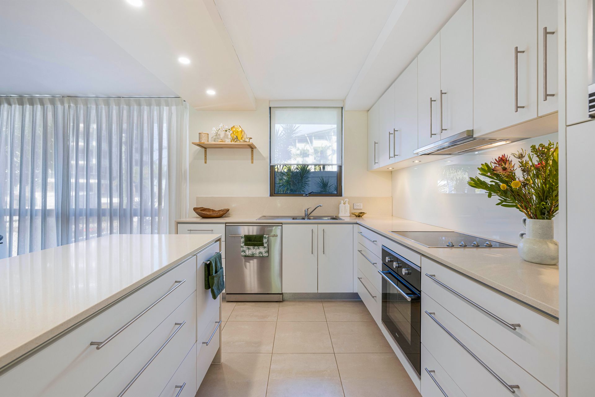 • Attractively appointed, large kitchen with white cabinetry, stone benchtops and stainless steel appliances