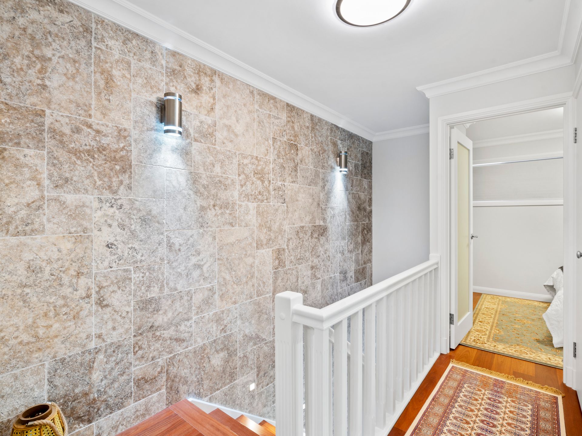 Upstairs is located up the polished Sydney Blue Gum stairs and take the time to admire the feature side wall walking up them, which has been done in natural Travertine stone in a lovely french pattern. Upstairs the Blue Gum floors continue into both generous sized bedrooms with the master bedroom having a full length robe and balcony overlooking the leafy rear patio. The bathroom has been fully renovated and has a marble surround. In addition to the large shower the bathroom contains a special light function mirror over the vanity and additional storage cabinet. Externally the property has a private fully fenced rear patio with the stone tiled area the perfect place to relax with a drink or two.