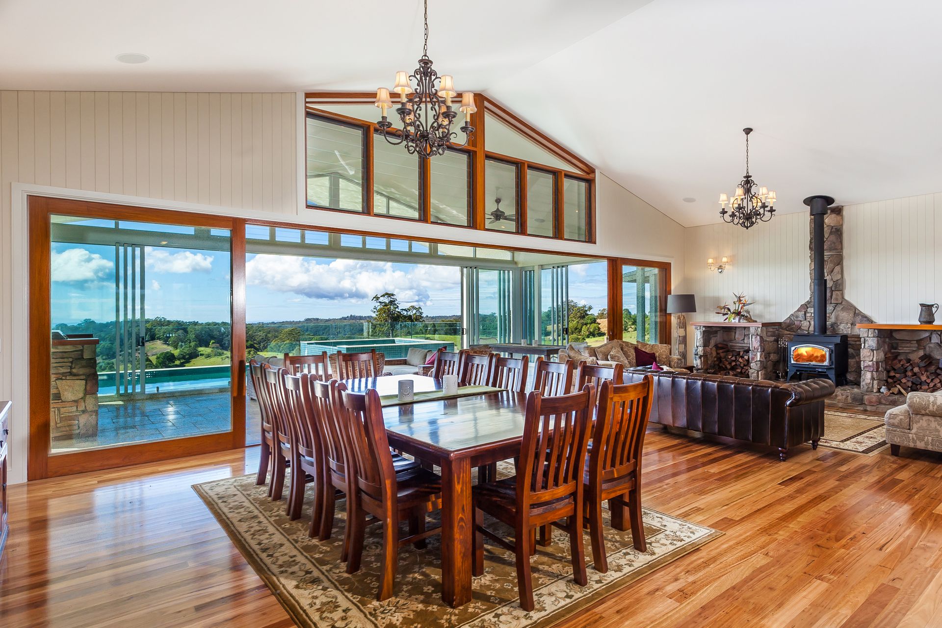 • The single level Queenslander home was built just 5 years ago in 2013 • Sits on a large level plateau on top of the hill, and commands views in all directions. These stunning views of Moreton Bay and the surrounding mountains, farmland, creeks and valleys inspired the dream to design and build a special home that would both encapsulate the magnificent views but also to share with a large extended family & their many guests • The wrap around verandah provides multiple sites to sit and soak in the ever-changing views, and the large open plan living area with the striking wood burning fireplace is the hub of the home • There are two separate bedroom wings and the 6 bedrooms, all with their own ensuite, were designed to accommodate up to 4 people • The beautiful kitchen is fitted with quality European appliances • The polished hardwood timber flooring throughout is especially noteworthy.