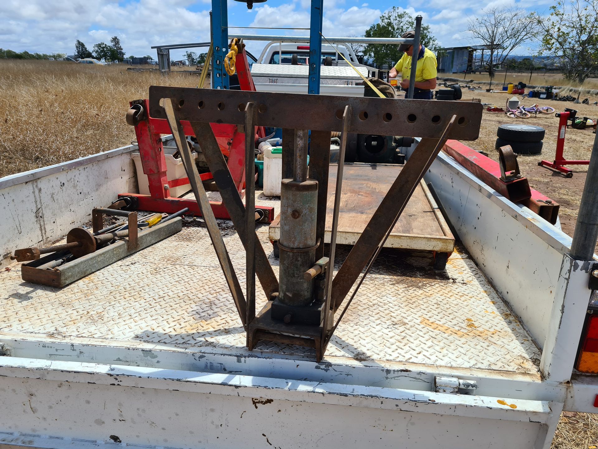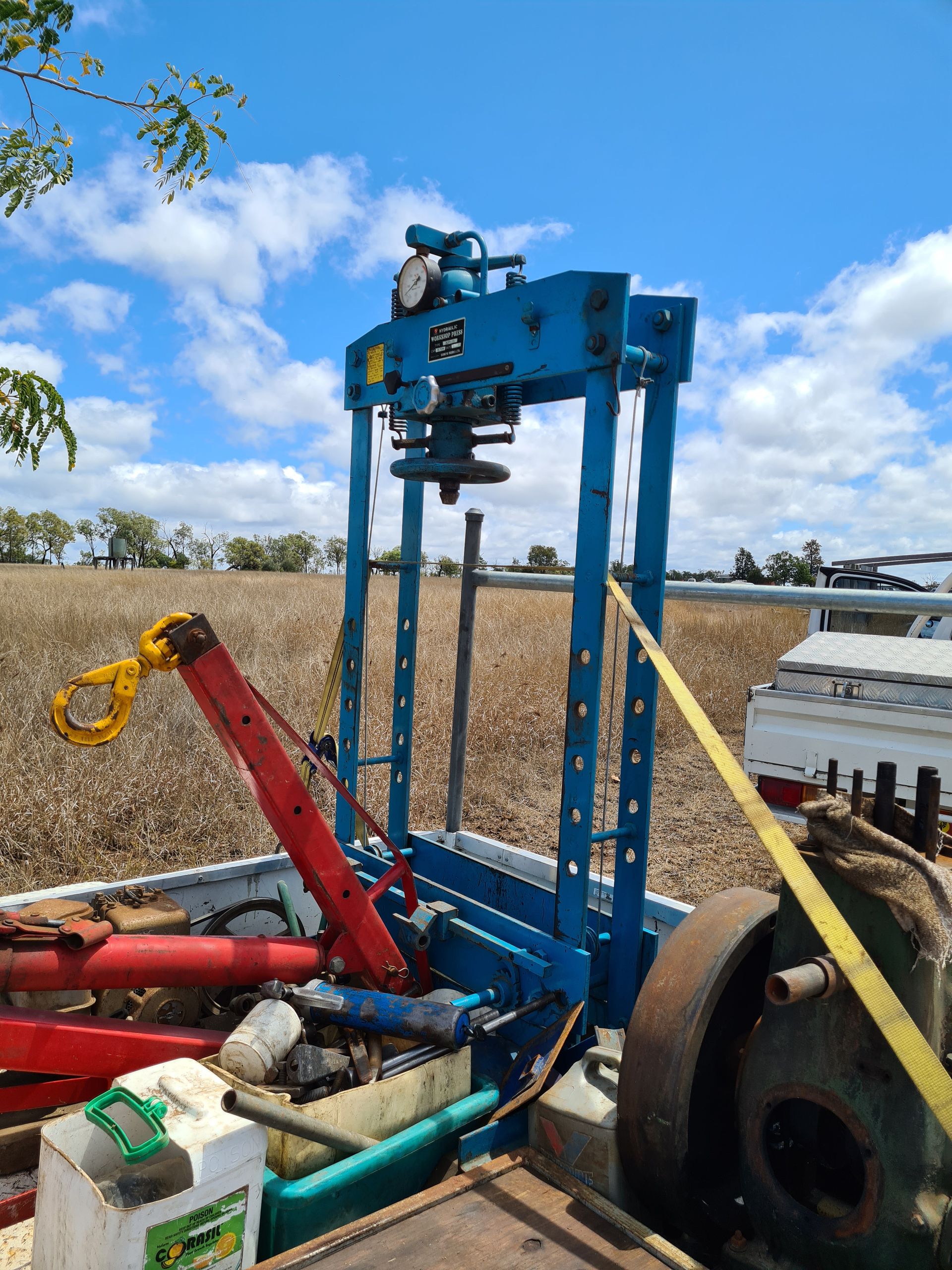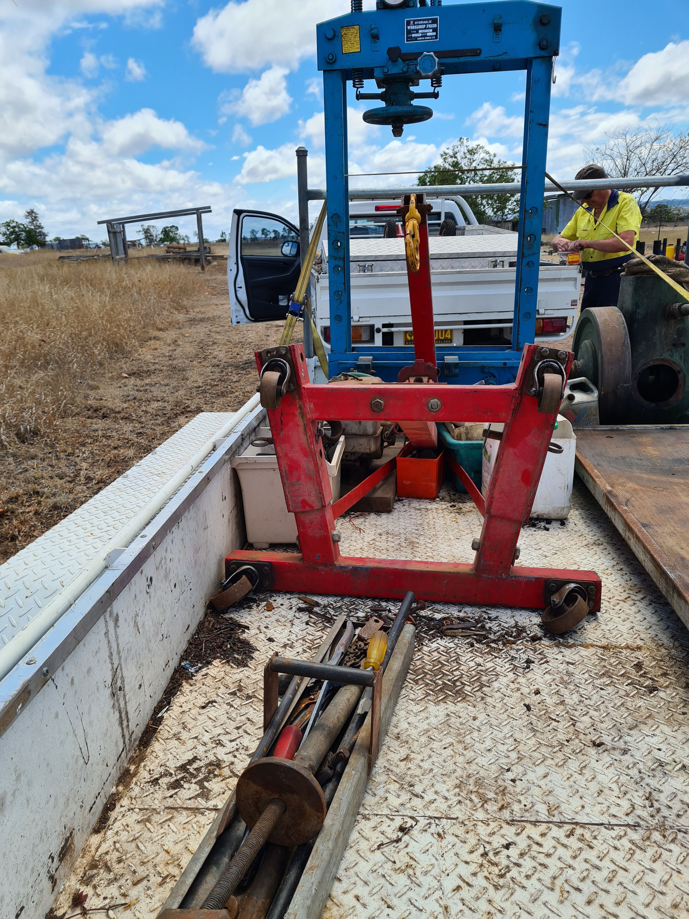Newly Added Items - 2 x pipe thread cutters, 2 x 20lt drum pumps, 15T Sankyo Press, Quanity tools & pullers, 2 x 6 stud hubs, Boat winch, 3 x load binders, 2 Chains, Threaded rod, Pipe bender, Clutch aligning tool, 2 x 16" 6 stud rims, Tractor muffler, Cooling system tester kit, Engine Stand, Engine crane 2T, 2 x car stands, 20T hydraulic puller kit, 2 x tool boxes on frame (fit on tray of ute), Nuts & botls metric, SAE, NC, new & used
