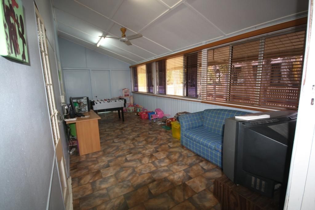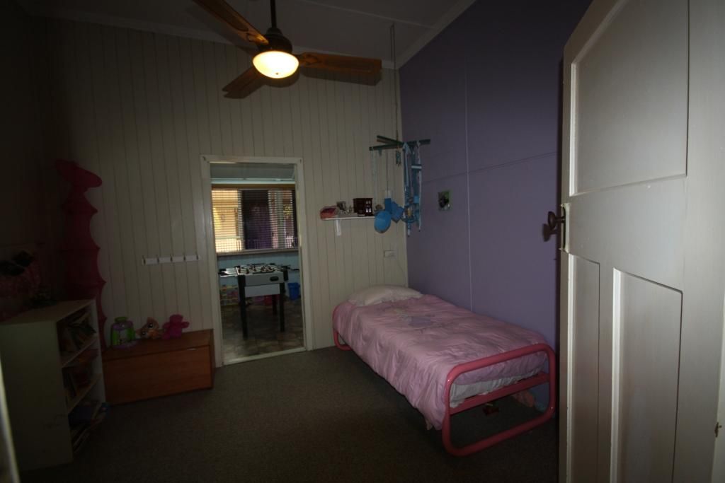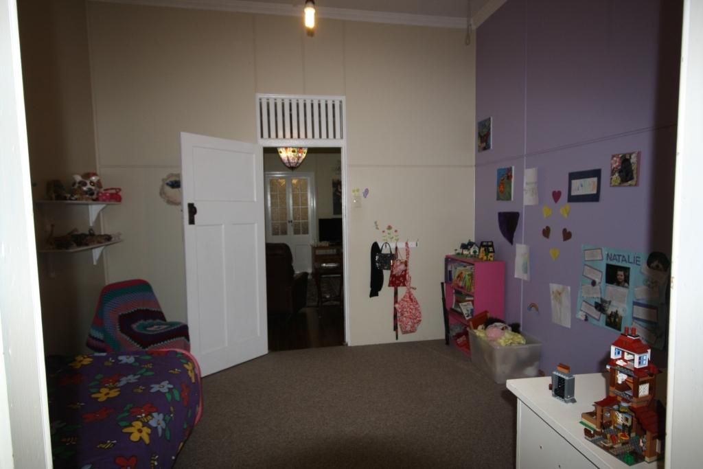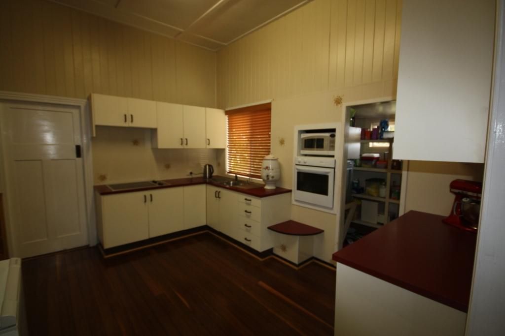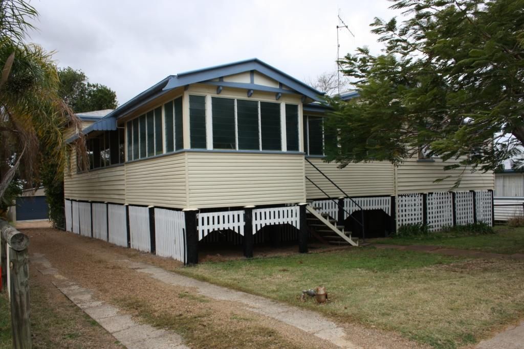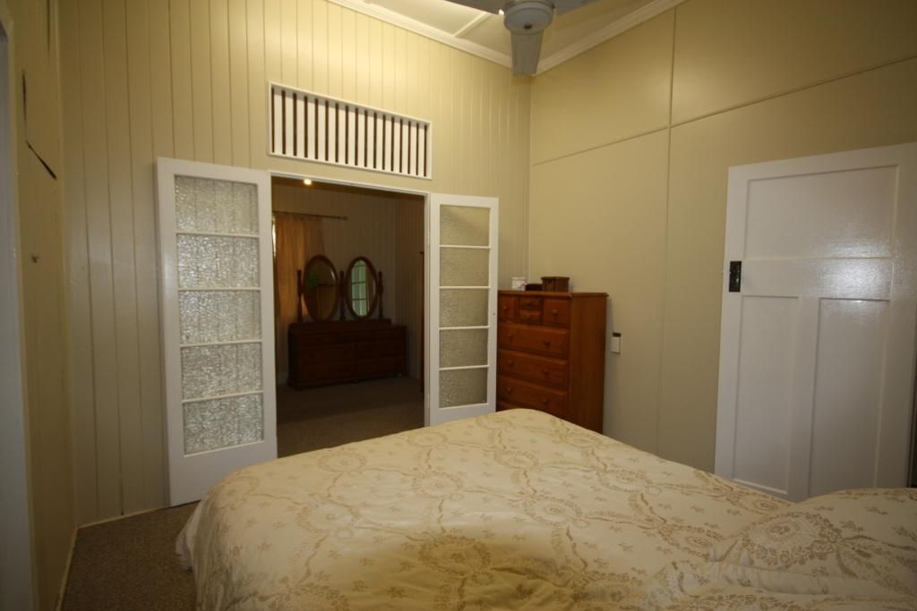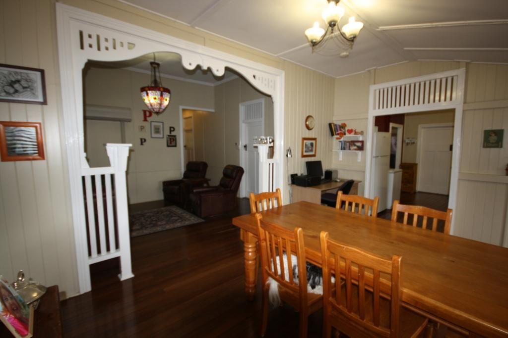 This freshly painted high-set Queenslander has 2 sleepouts besides the 5 bedrooms. * Short walk to shops from quiet end of main street * Beaut ornate archway + lead-light pendant light enhances lounge-room * Polished timber hard-wood floors in main living areas * Carpeted bedrooms and main has connecting dressing room and a/con * Split-system a/con in lounge/dining + ceiling fans * Walk-in pantry, wall-oven, and glass-top cook top in modern kitchen * 2 large sleepouts - could be an office/kids playroom or craft room * Double garage on a large 1012 m2 block