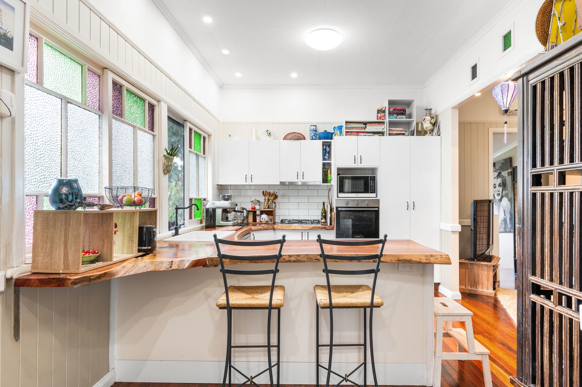 Step inside and be greeted by the warmth of timber floors, striking timber slab benchtops, and stunning leadlight windows that fill the home with natural light and timeless charm. The generous floorplan offers flexibility for modern living, with multiple living spaces and room to spread out.