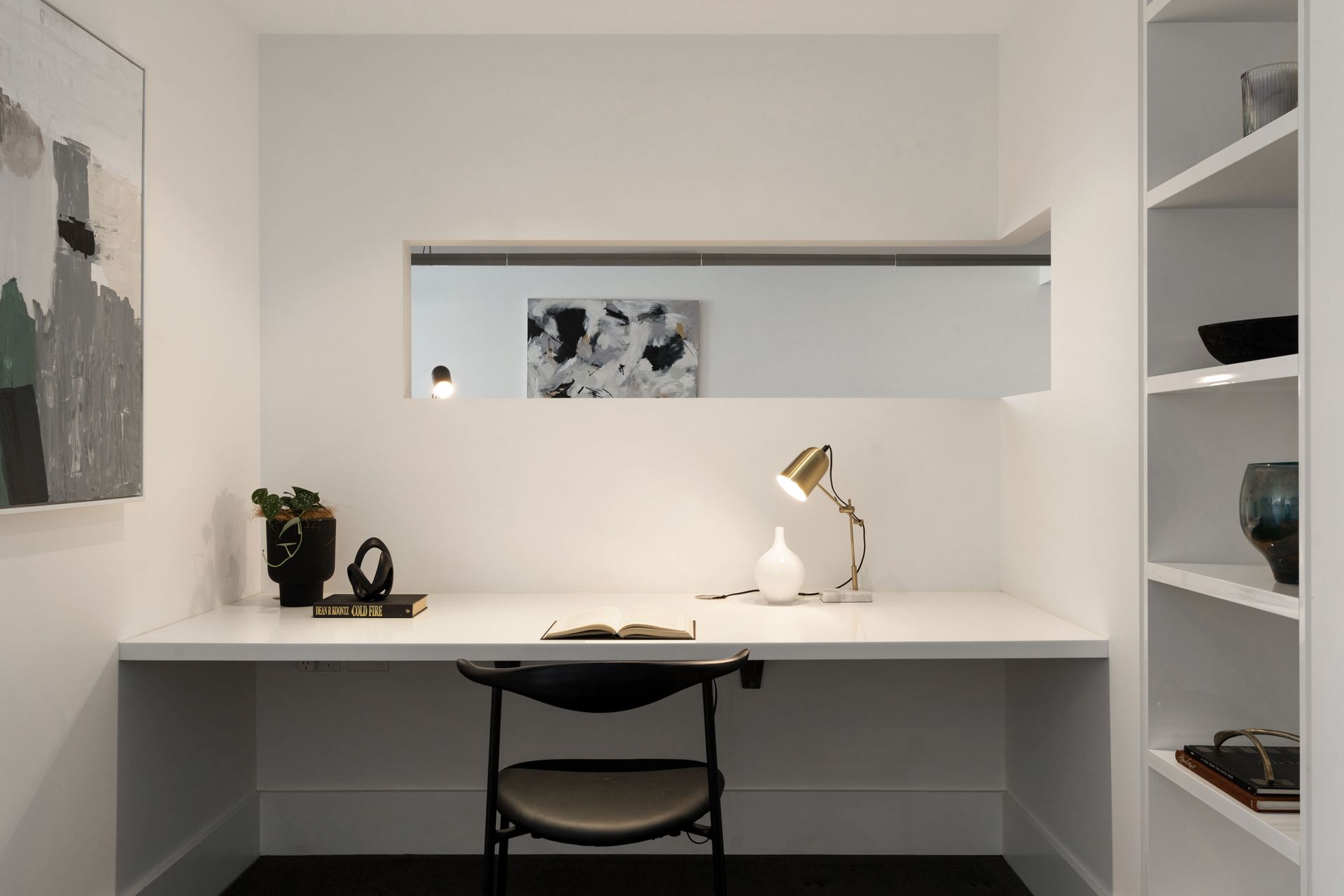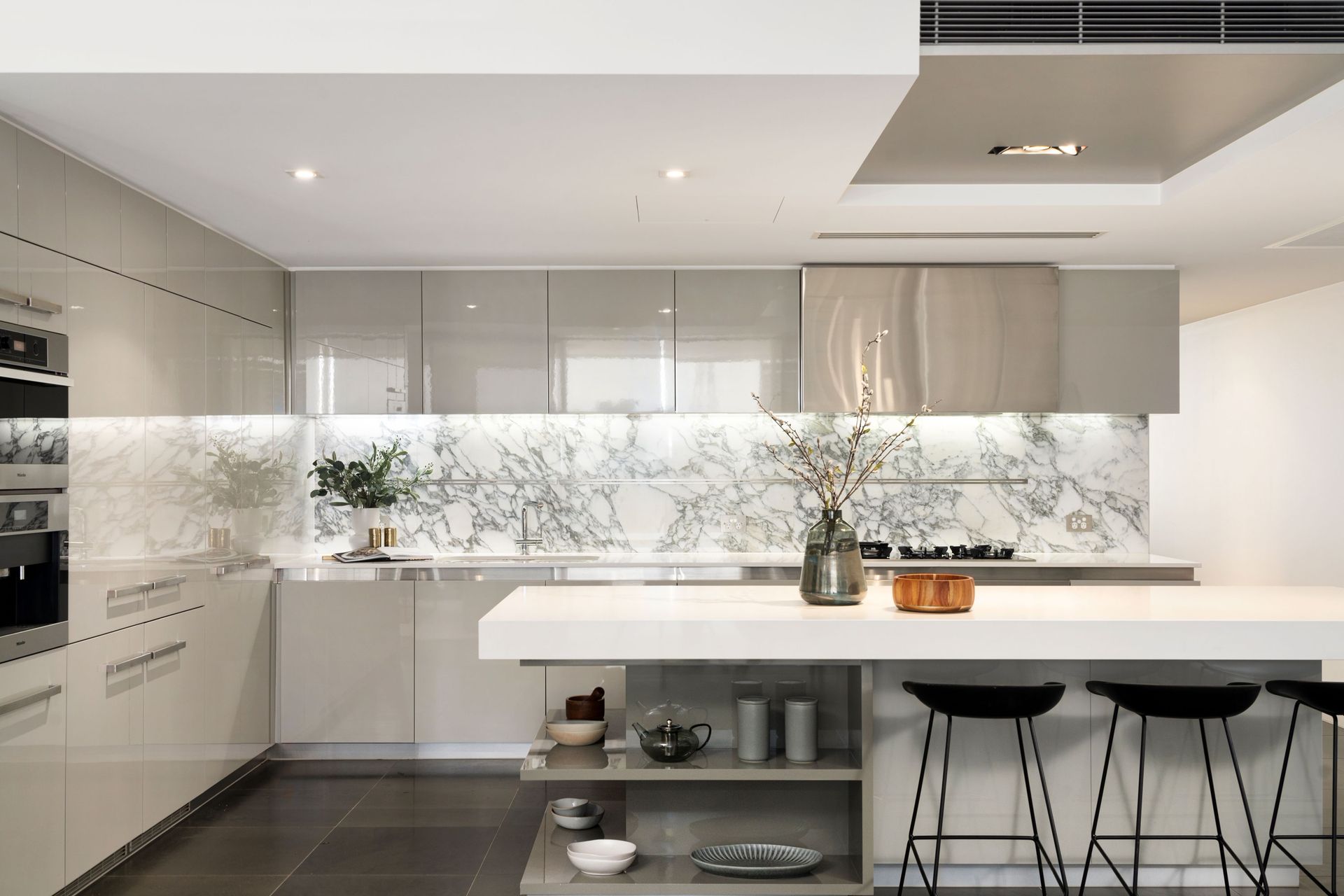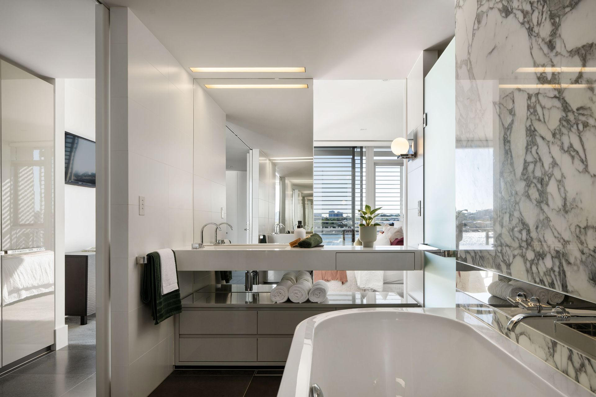 The huge galley style kitchen is perfect for year-round entertaining, located directly next to main balcony you will enjoy amazing views from every corner of the kitchen and adjacent living space. Featuring fully integrated stainless-steel Miele appliances and finished in complementing marble and two-pack kitchen joinery, this is the central hub of the home.