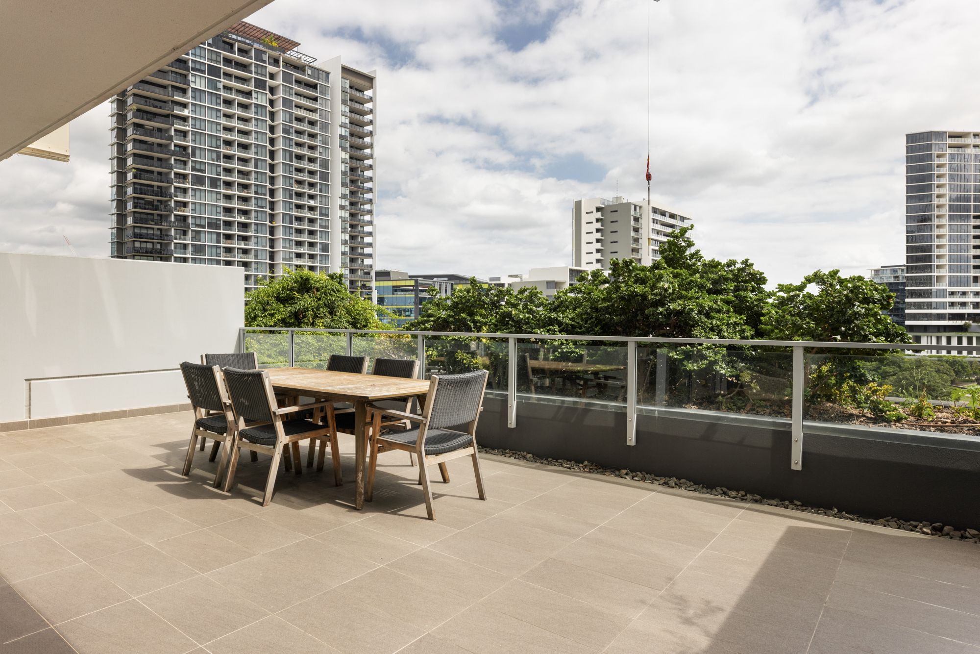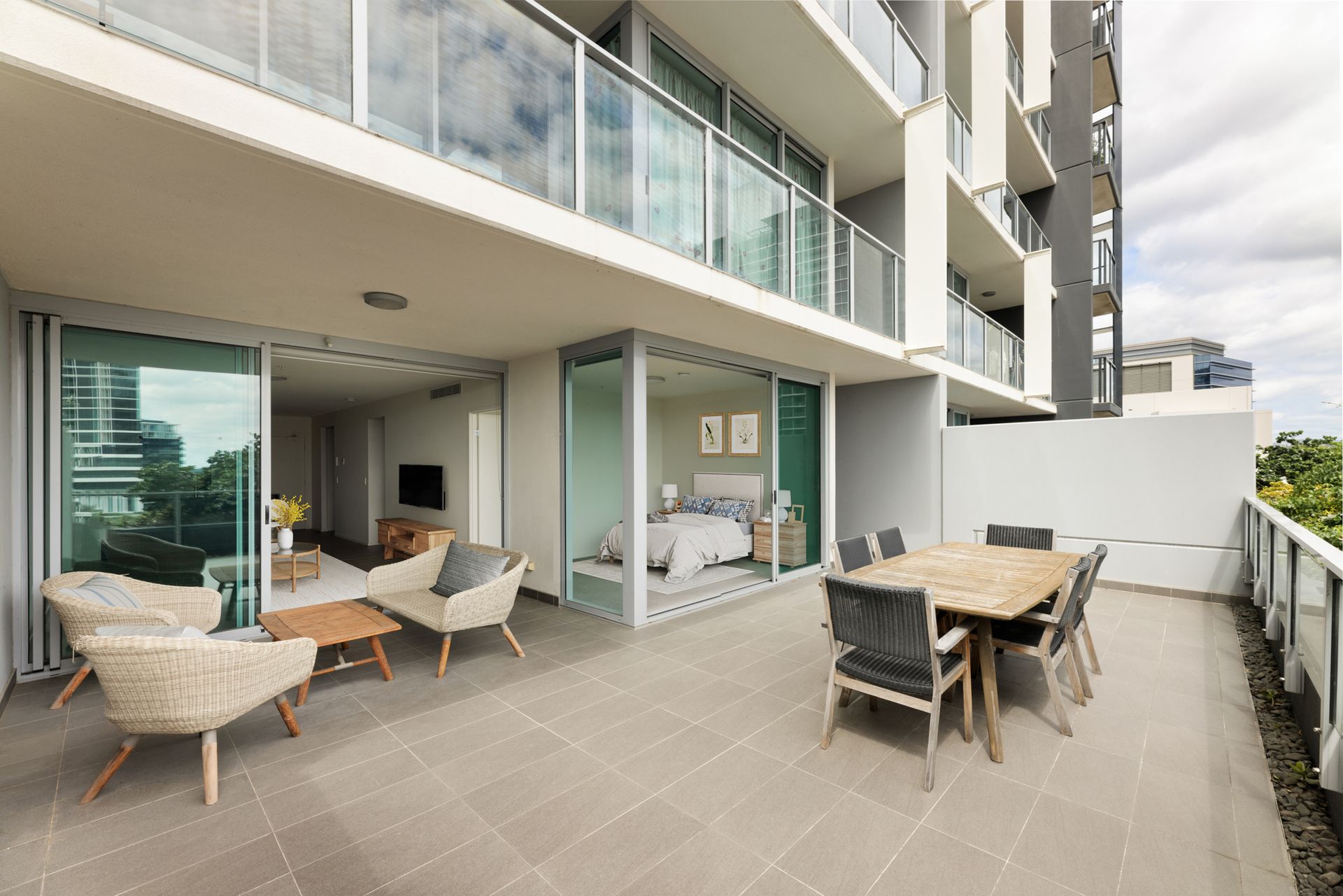Your sleek chef's kitchen boasts a centre island and a suite of quality appliances along with views over the living and dining space. Here, glass sliding doors allow you to move freely to the huge covered north-facing balcony where you will love to host guests and dine alfresco.