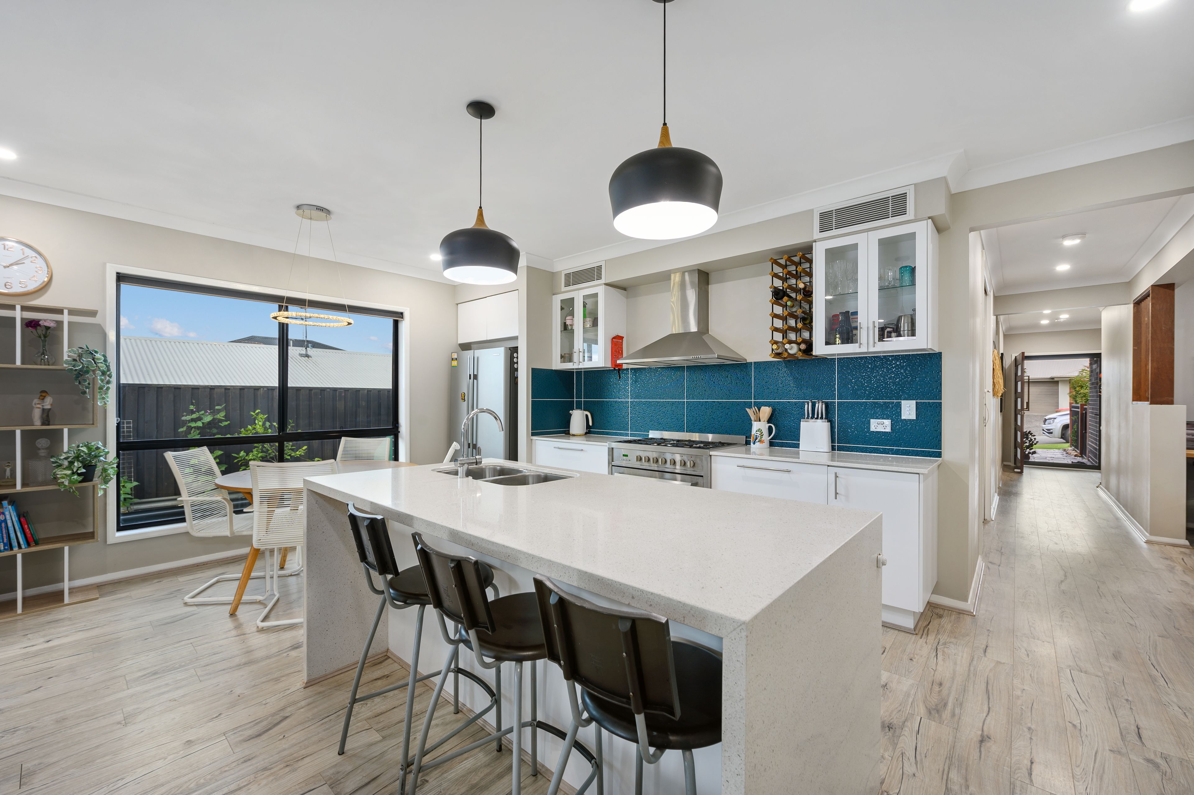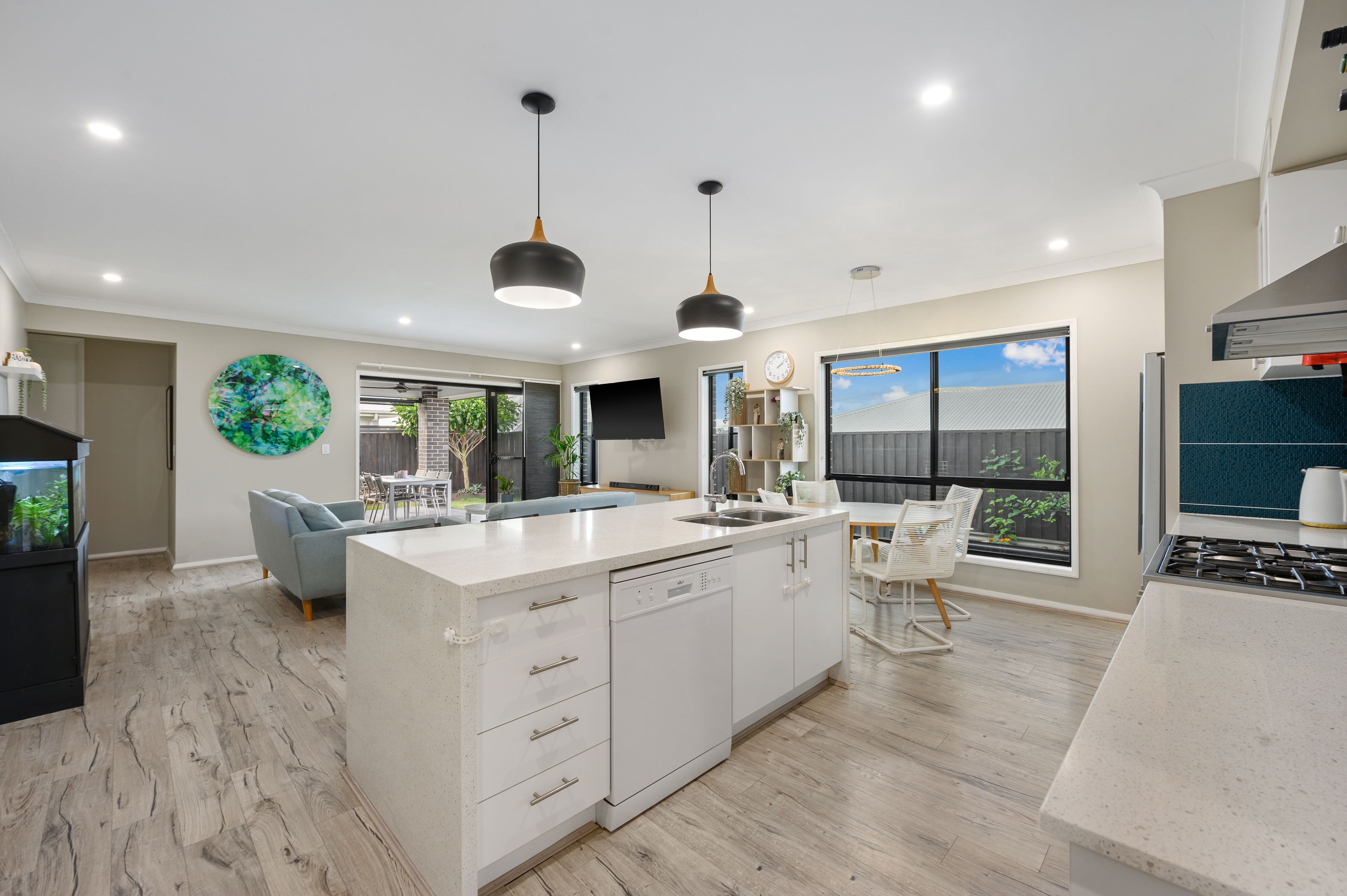 The modern kitchen at the heart of the home boasts a large 900mm stove, quality appliances, breakfast bar and plenty of storage space. The adjoining dining and living space opens out onto a covered all-weather alfresco entertaining area which is perfect for entertaining family and friends.