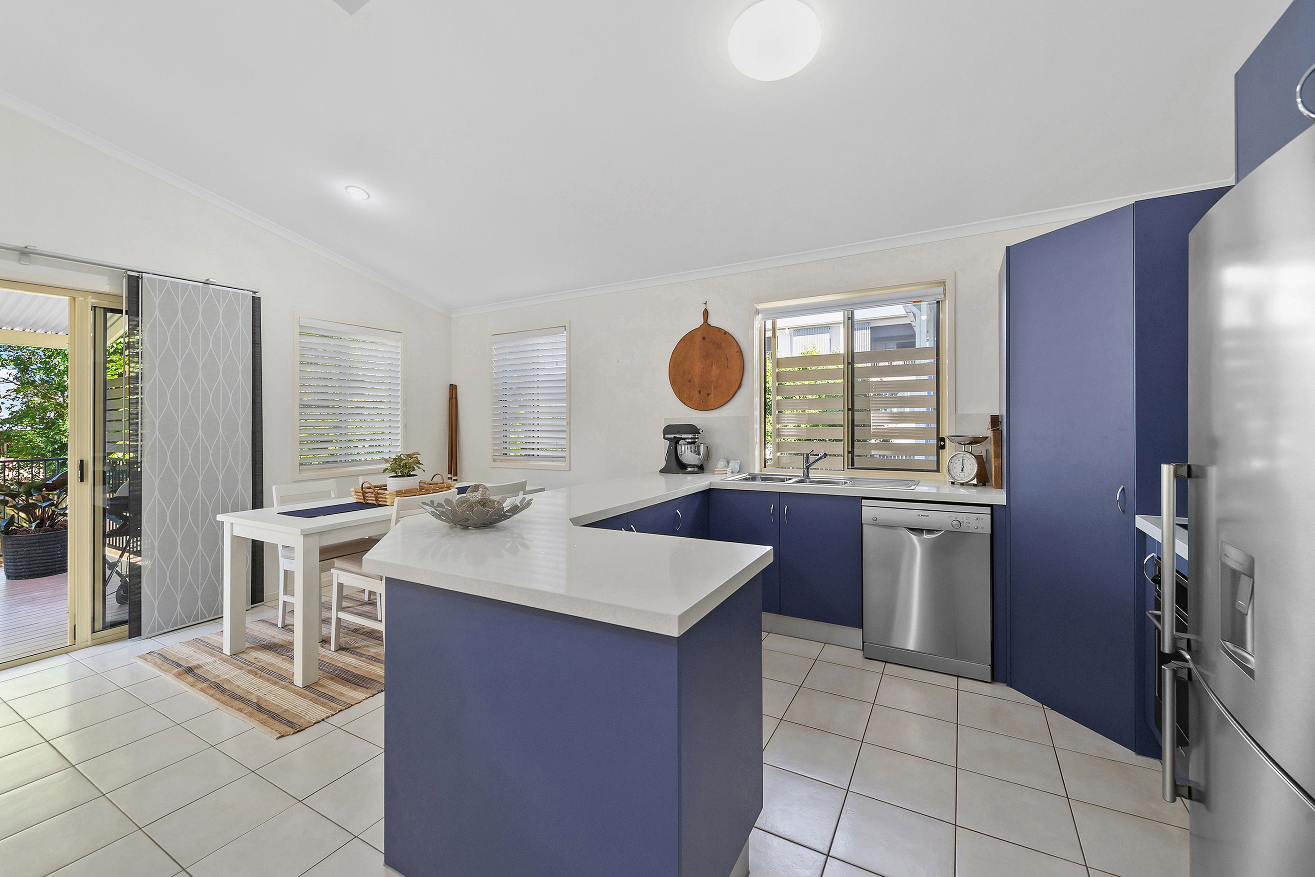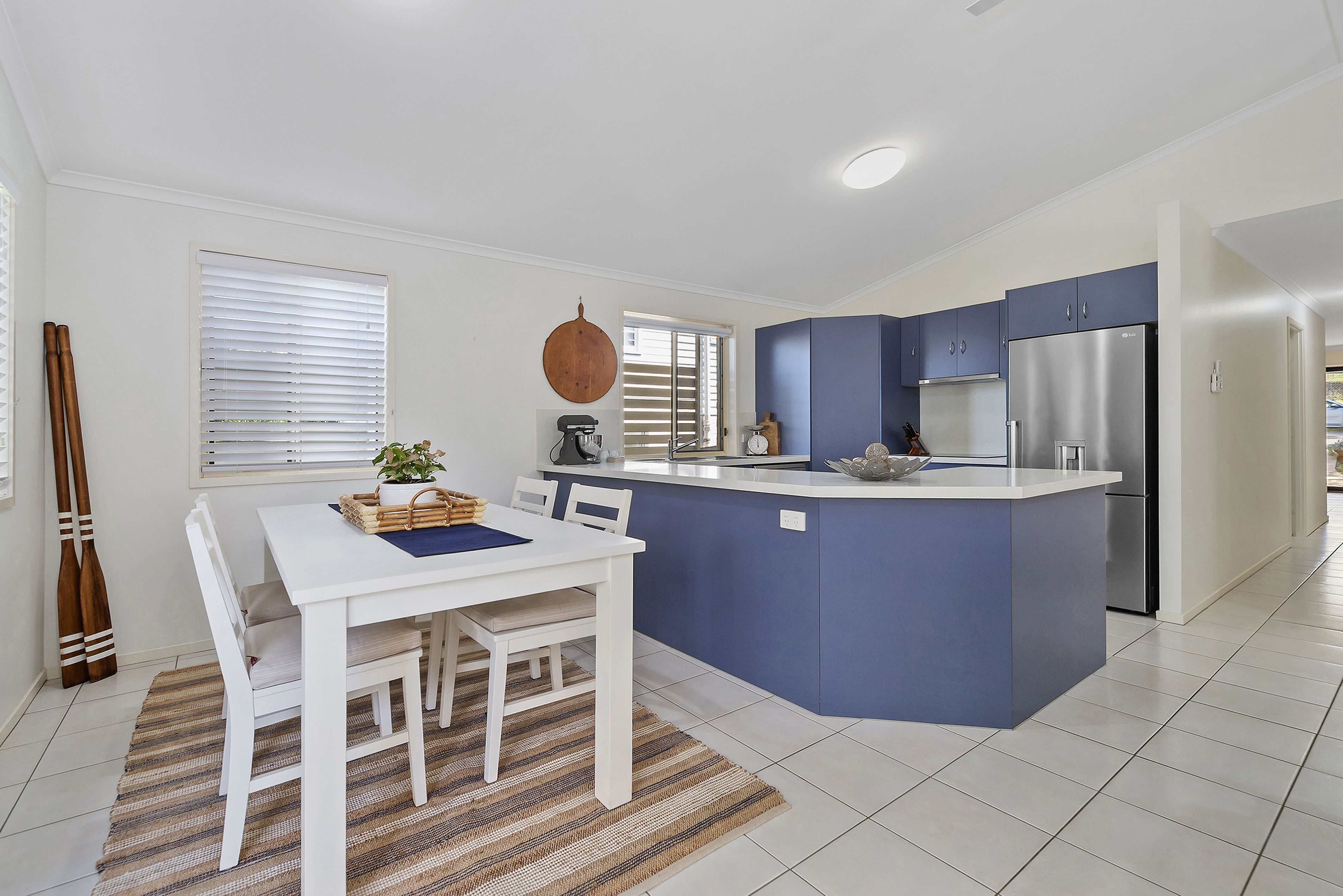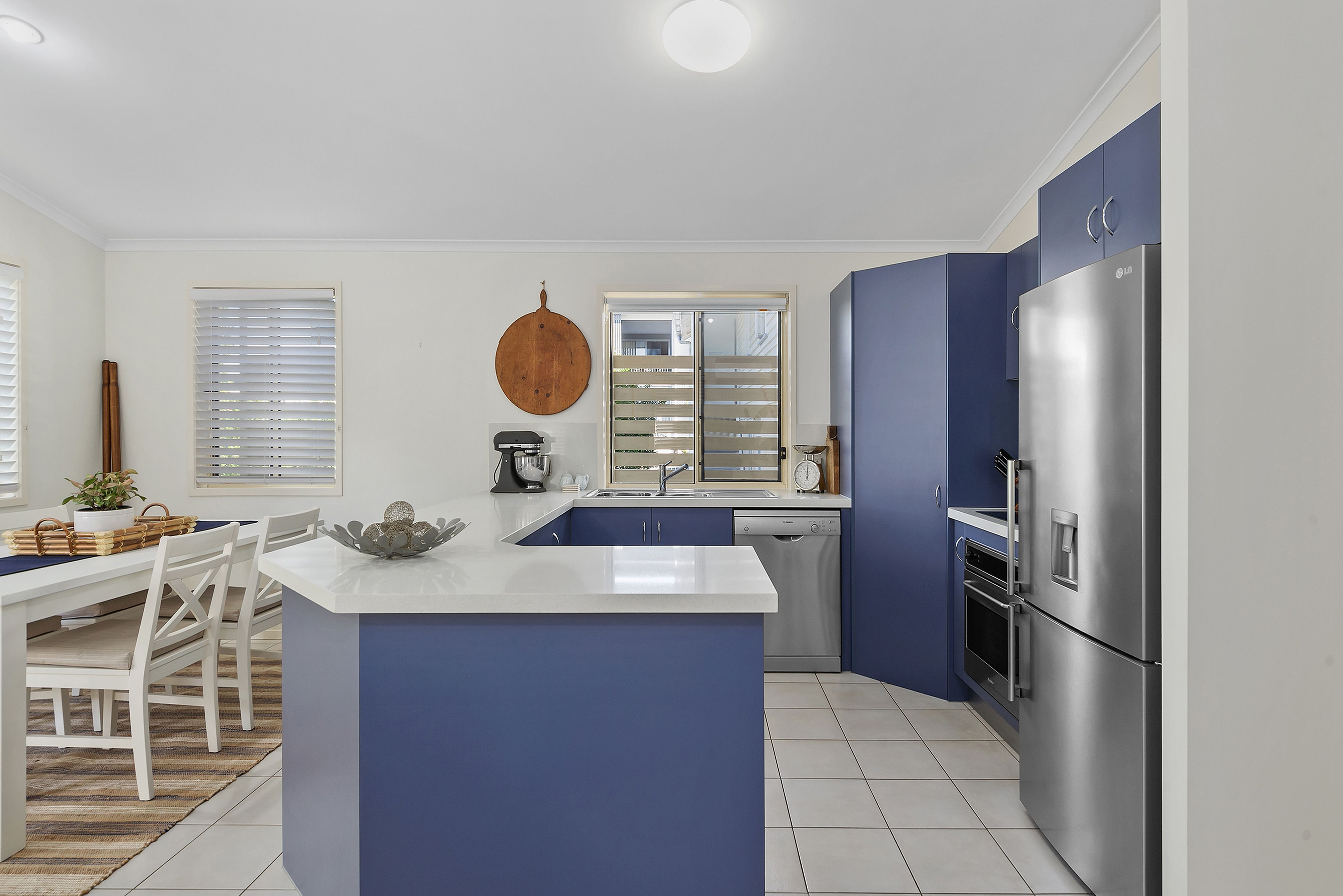 The lounge and dining area is privately positioned to the rear of the block and features tiled floors, air-conditioning and a high-pitched ceiling to draw in sunshine and airflow. The adjoining kitchen is open in design and well-appointed with stainless steel appliances and large benchtops to accommodate meal preparation and a breakfast bar.
