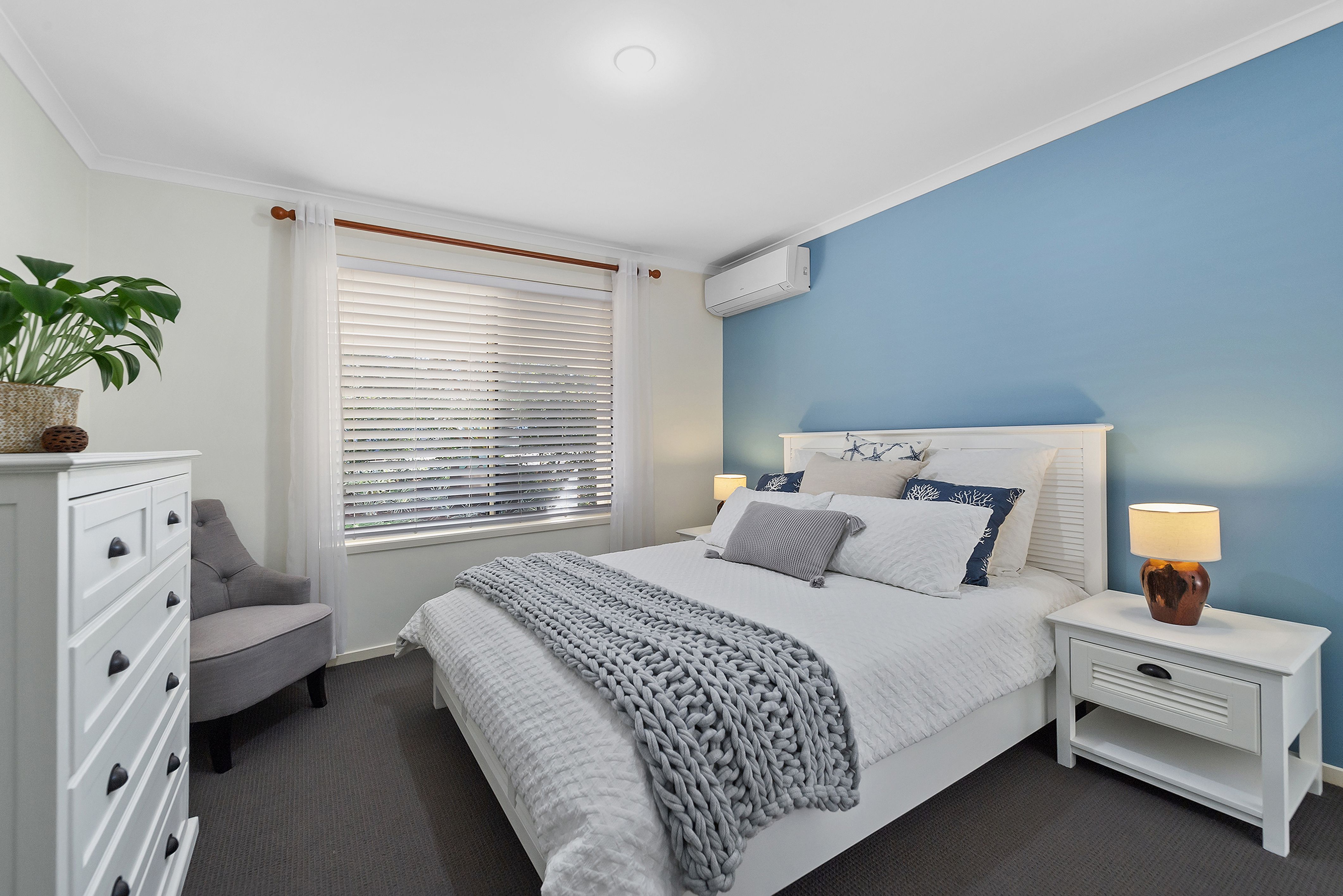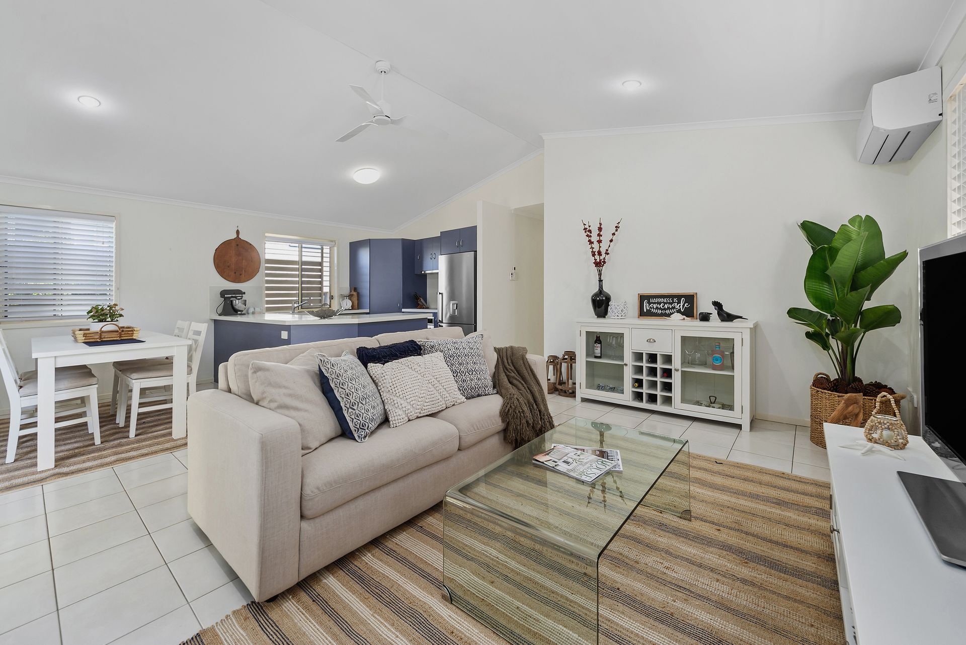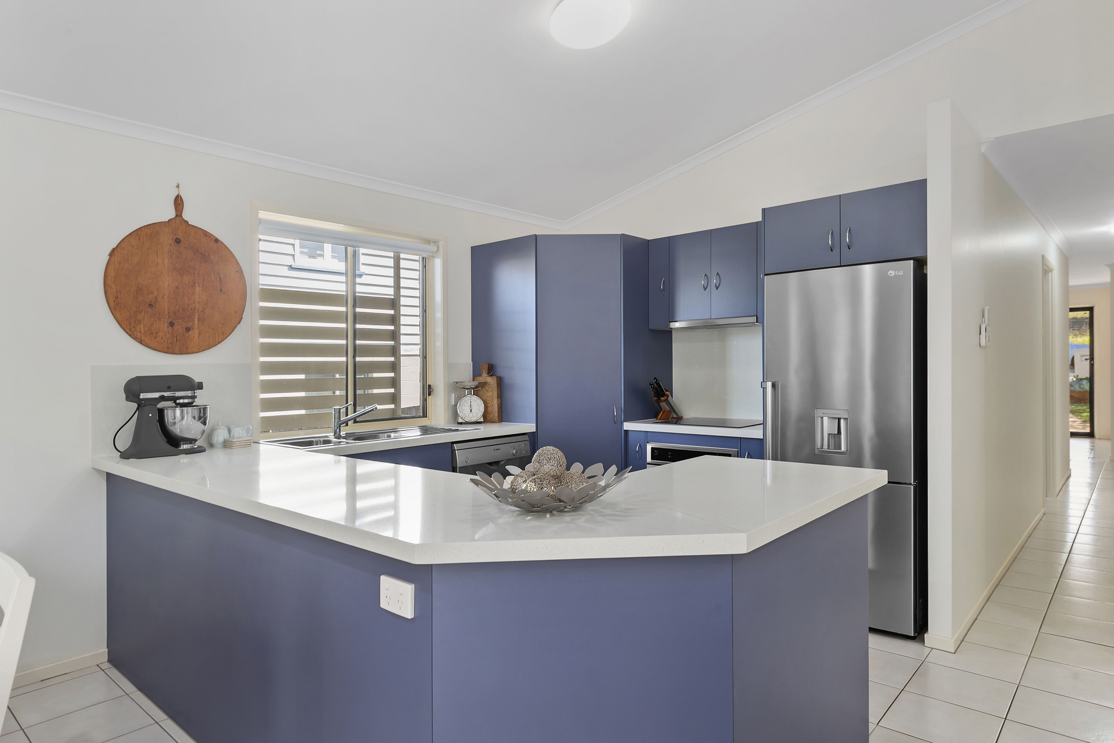 The lounge and dining area is privately positioned to the rear of the block and features tiled floors, air-conditioning and a high-pitched ceiling to draw in sunshine and airflow. The adjoining kitchen is open in design and well-appointed with stainless steel appliances and large benchtops to accommodate meal preparation and a breakfast bar.