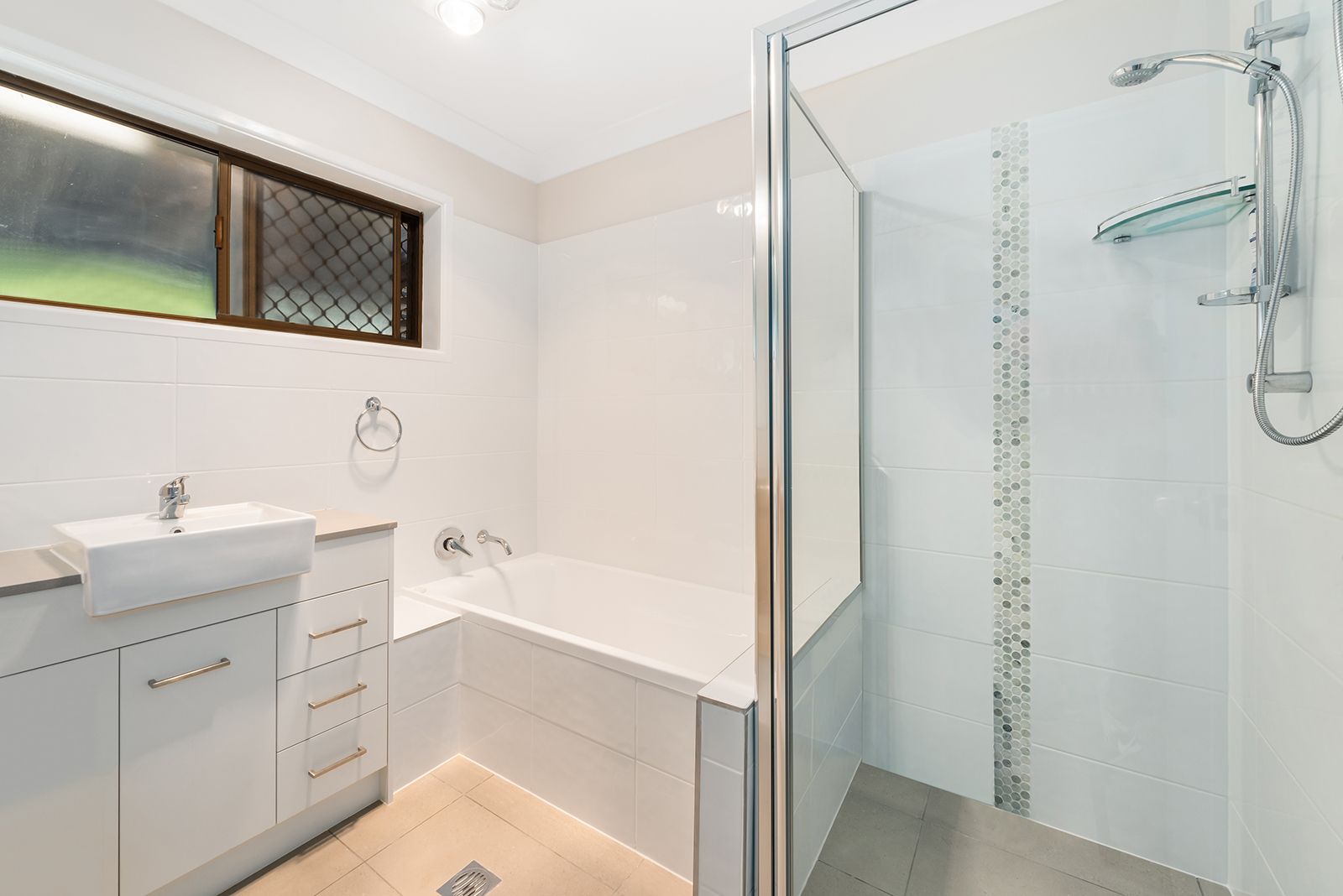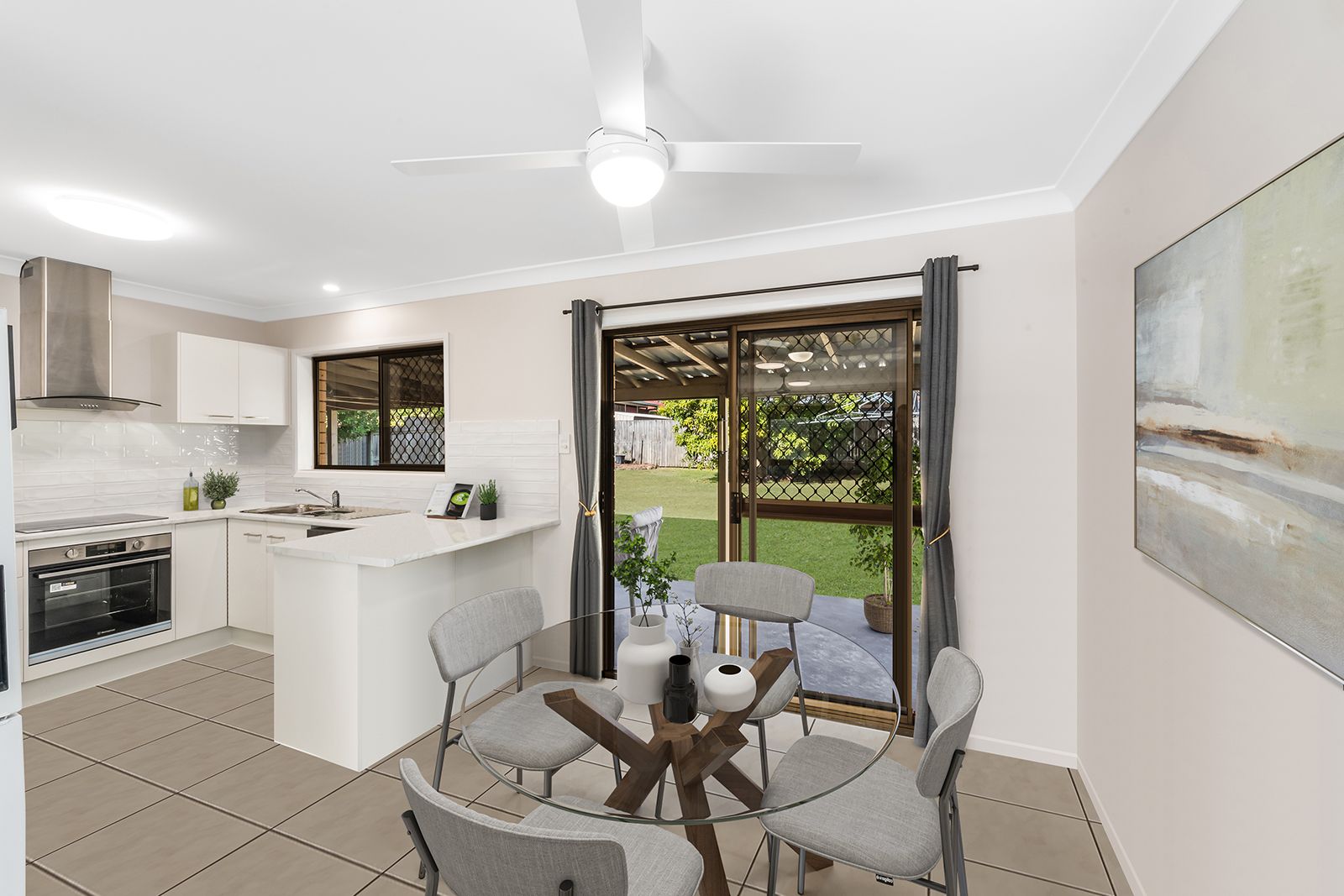The open-plan living and dining area is kept cool with air-conditioning, and the practical kitchen offers plenty of storage, a breakfast bar and quality appliances.