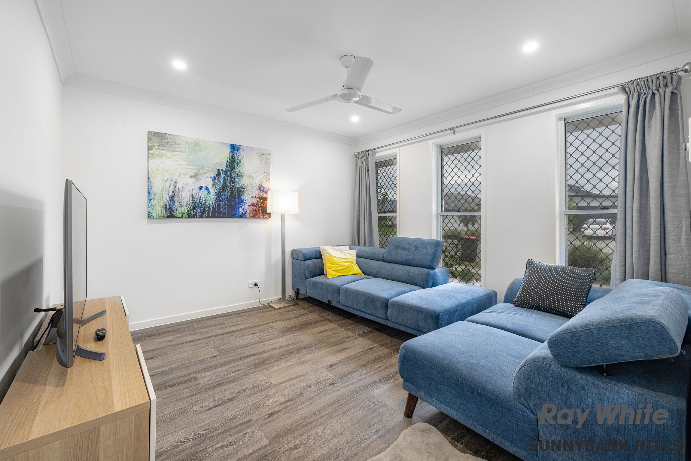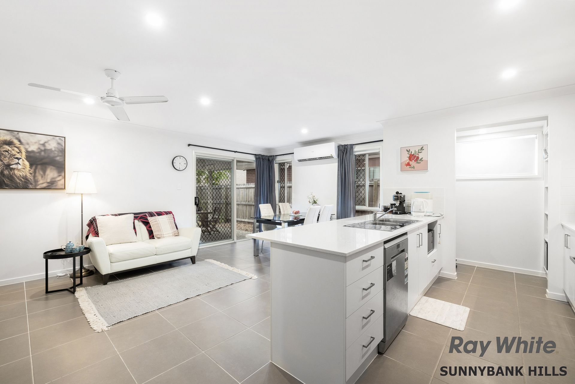- Neutral tiled floors and crisp décor with high ceilings, security screens and split system air conditioning. - Large independent front lounge room or ideal formal media area with ceiling fan for everyday comfort. - Relax in the generous open-plan living and dining area which enjoys abundant light and airflow from the numerous windows and doors and air-conditioning. - Private outdoor entertaining can be enjoyed under the covered patio area that flows direct to level lawns. - Beautifully designed and fitted kitchen with walk-in pantry includes a sleek, stone benches providing for casual seating and ample cabinetry with stainless steel appliances with gas cooker, dishwasher and large fridge capacity. - Well-planned for privacy, the master bedroom features luxury timber floor with ceiling fan and vertical blinds affixed, a large walk-in robe and adjoining stylish ensuite offering a dual vanity with storage. - Three junior bedrooms all have sliding robe storage, fans and timber flooring and have access to the neat main bathroom with separate toilet. - Purpose-built cabinetry to the functional laundry with linen storage. - Double garage with internal entry and driveway parking. - Fully fenced block with wide side access and gates at the front.