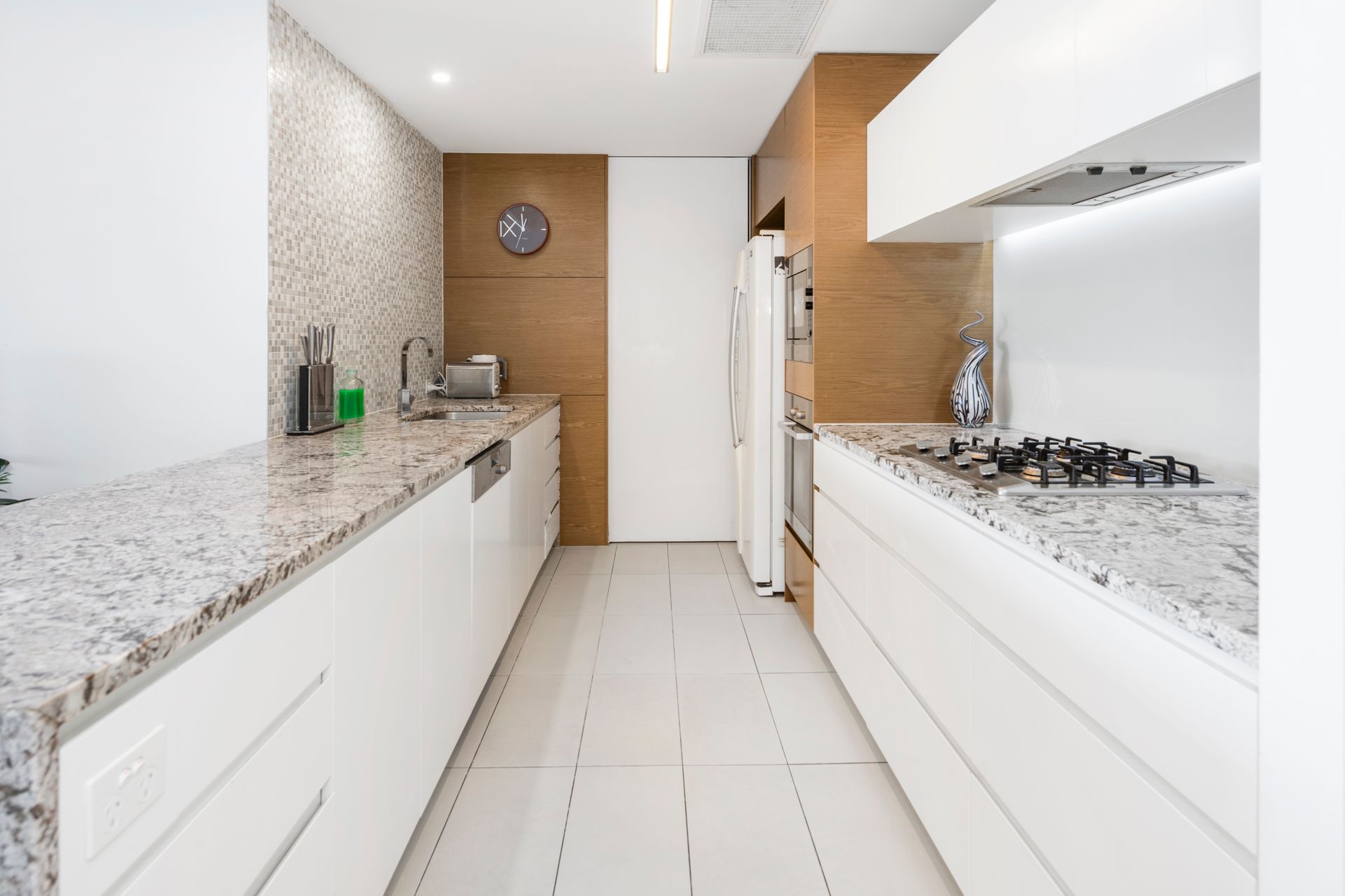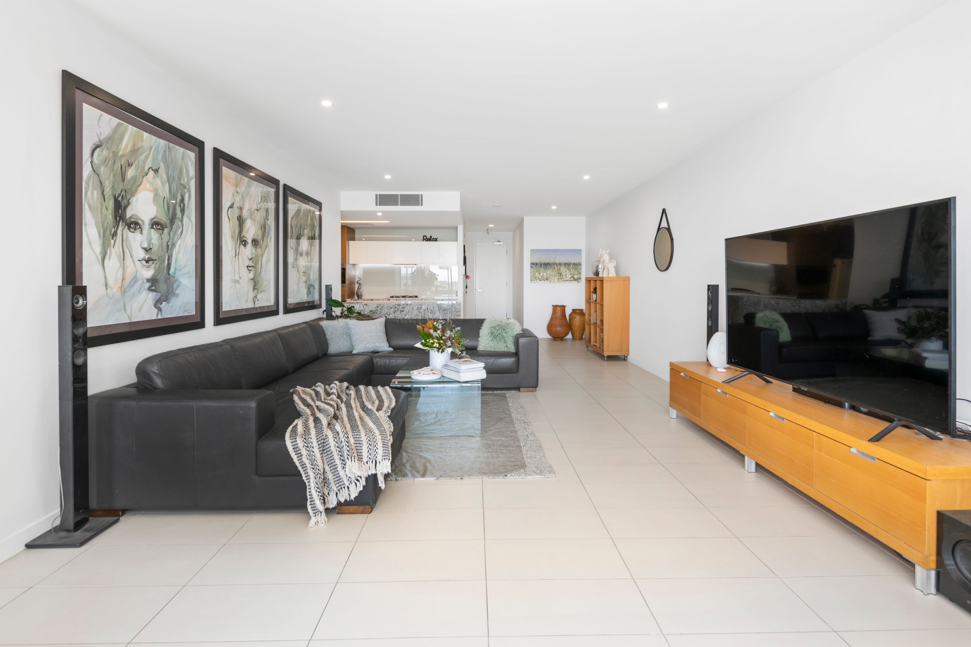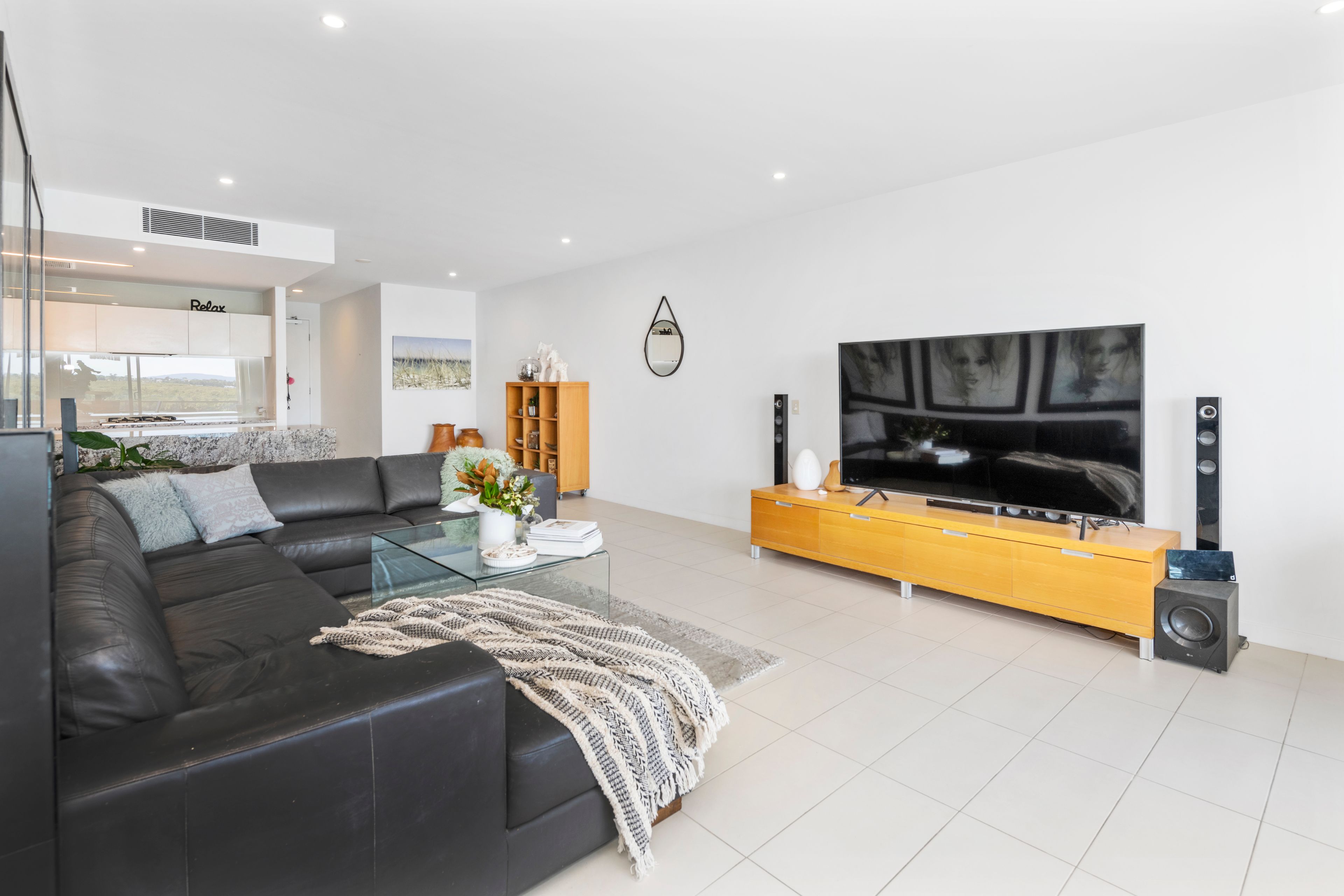 The designer kitchen overlooks the open plan living and dining space that is flooded with natural light pouring in through the sliding doors, while high ceilings and fully ducted air conditioning create a comfortable living environment year round.