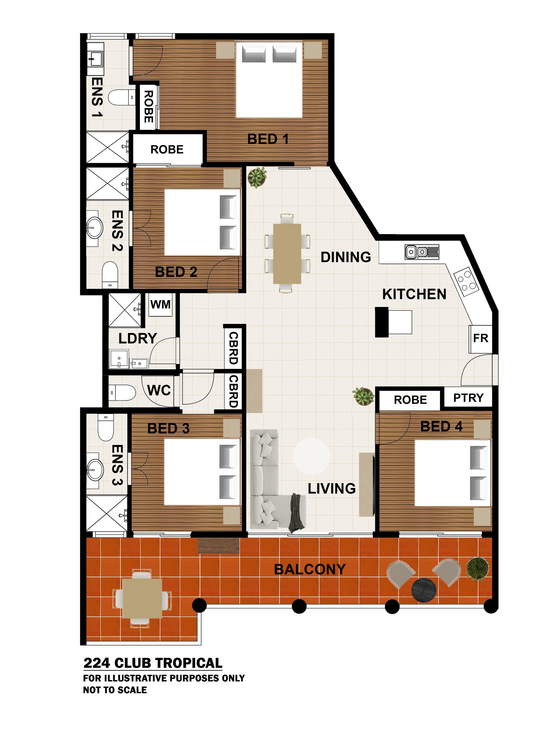 The apartment itself is spacious and private, providing a comfortable open plan living space. Contemporary in style, self-contained and selling fully furnished. Three of the four bedrooms have their own ensuite. Suitable for a large family, multiple generations or friends seeking to holiday together and share the space. The apartment includes a full-sized kitchen with dishwasher and oven. The laundry facilities are combined with the 4th bathroom, and the generous balcony overlooks a neighbouring tennis court.