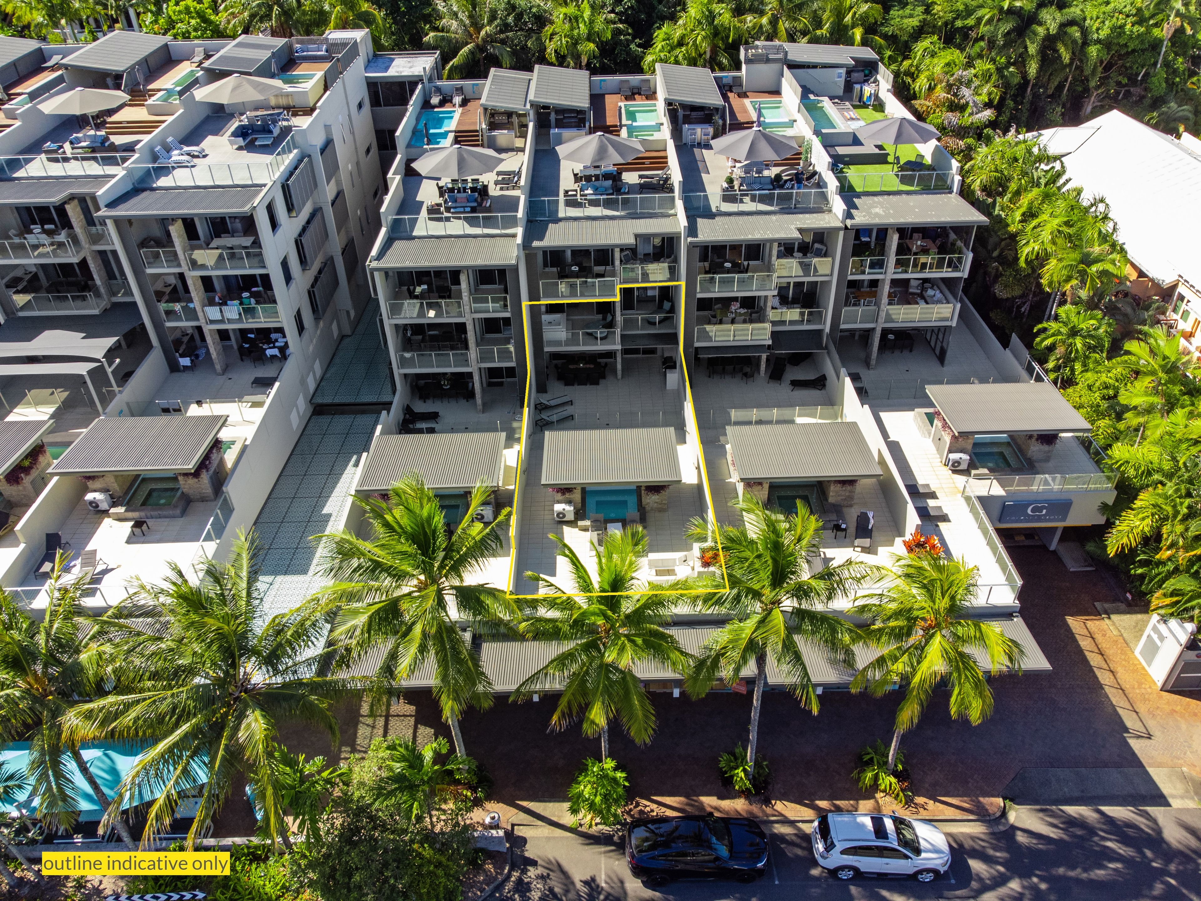 Ray White Port Douglas is proud to present for purchase 102 Coconut Grove, an exciting opportunity to own this one of a kind expansive and sophisticated apartment set over 2 levels with direct lift access. The open plan design of the living zones and media room invites entertaining, with the chef's kitchen and large stone island counter integrating both the seating areas and dining room. Relaxation mode is transitioned effortlessly to the alfresco terrace with a built-in outdoor kitchen for all seasons. Framed by palm trees the high walls capture the sunshine and provide privacy as you enjoy this grand space, whether it's a swim in your plunge pool, lazing on the lounges overlooking the mountain ranges and Macrossan Street, or soothing life's stresses in the relaxation spa.
