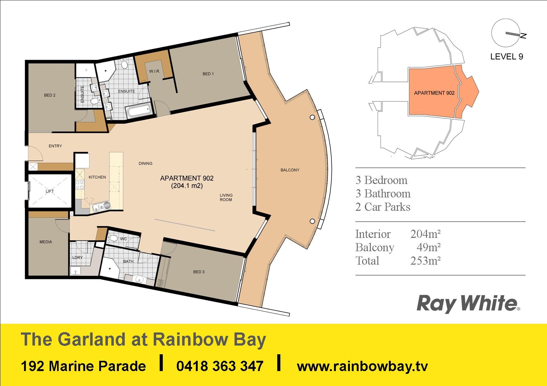 * North facing with views over Rainbow Bay * 3 bedrooms, 3 bathrooms plus media room * 2 parking spaces and lock up storage for each apartment * Spacious floor plans approximately 249m² with generous balconies * High quality finishes throughout plus integrated data cabling * Floor to ceiling tinted glazing * Outline indicative only