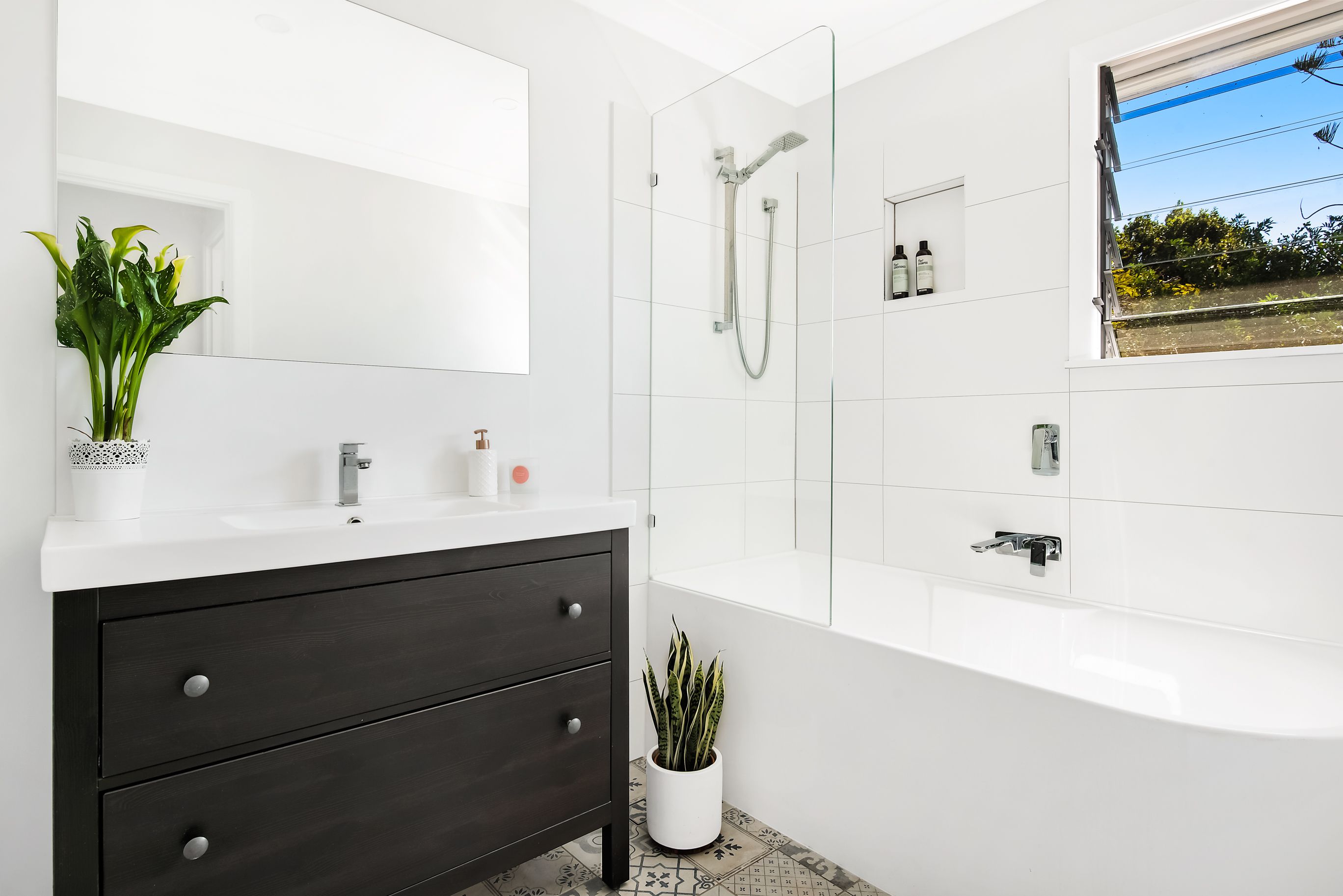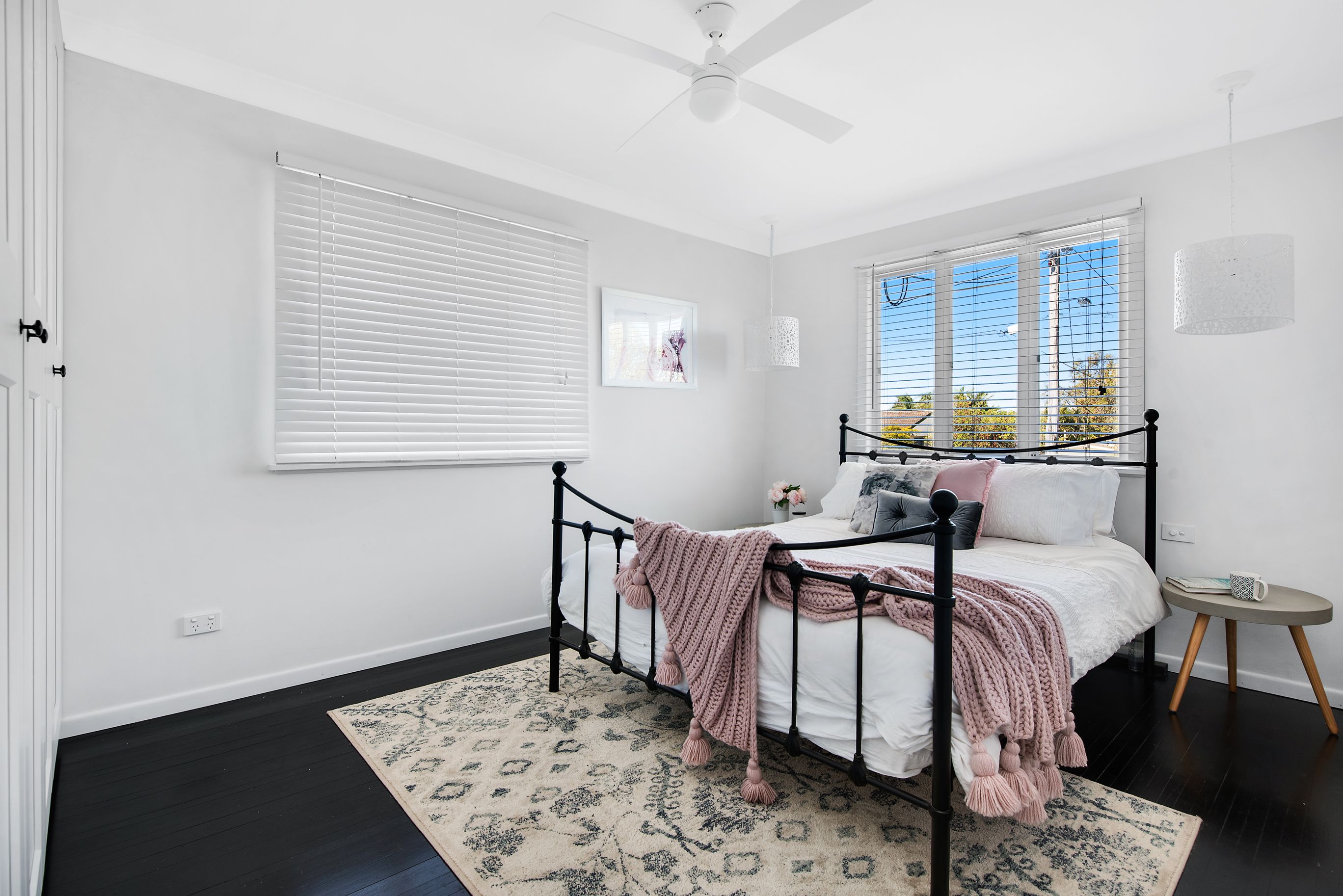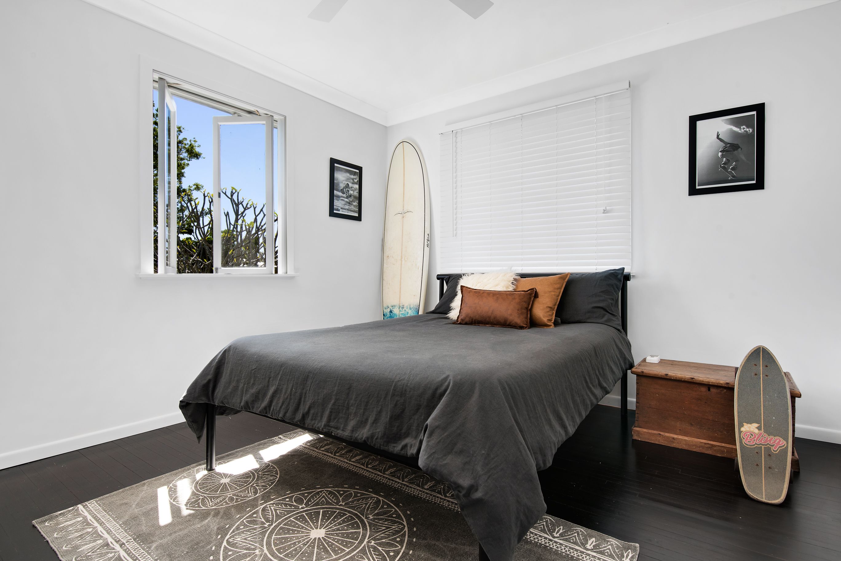 The upper floor features the three bedrooms, each with built in wardrobes and ceiling fans, plus family bathroom with feature floor tiles and separate toilet. The gorgeous dark floorboards are a rare feature, continued upstairs as a beautiful contrast to the light and airy ambience. Downstairs features an additional room plus full bathroom, all big enough for accommodation, kids room or guests, or even the home office.
