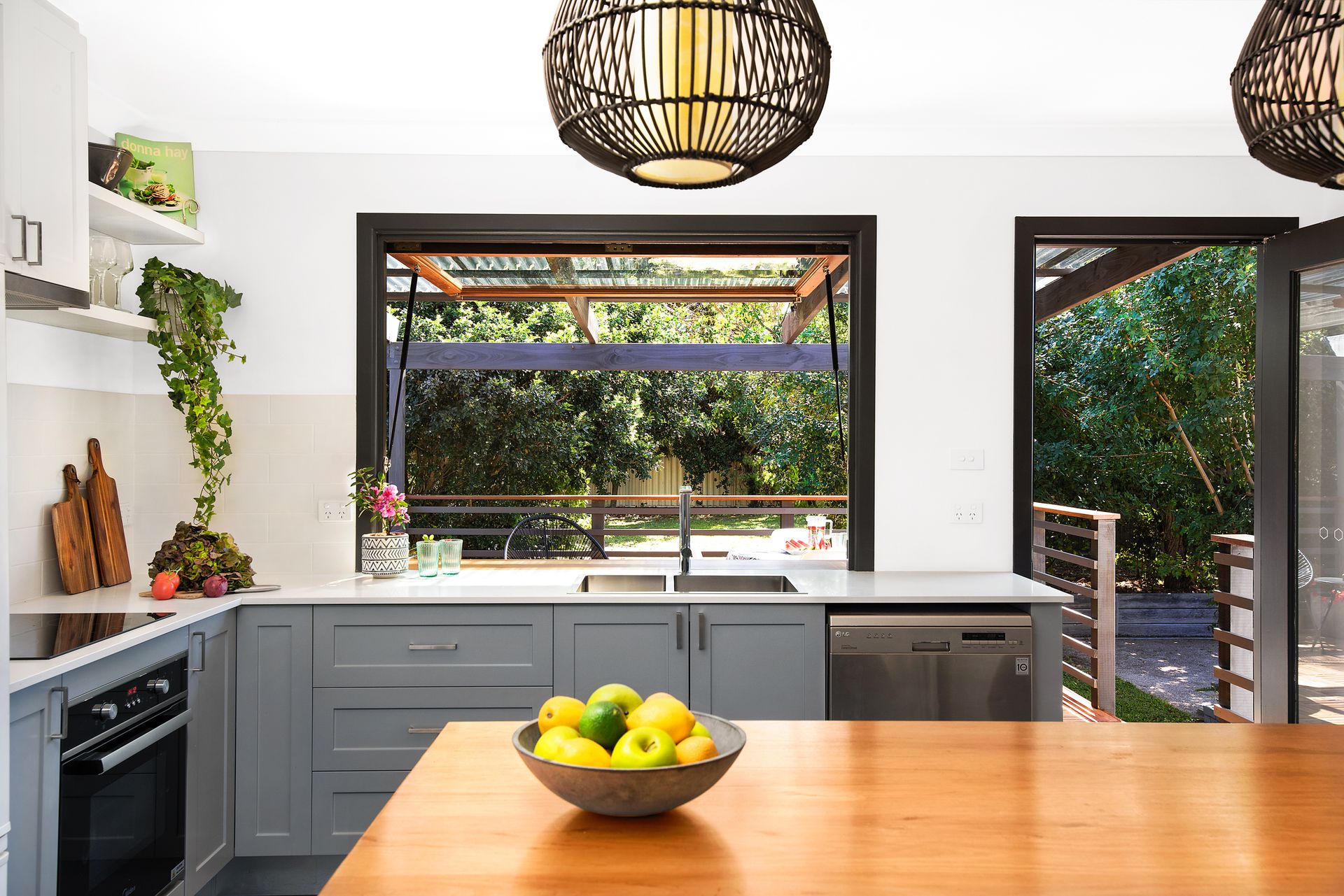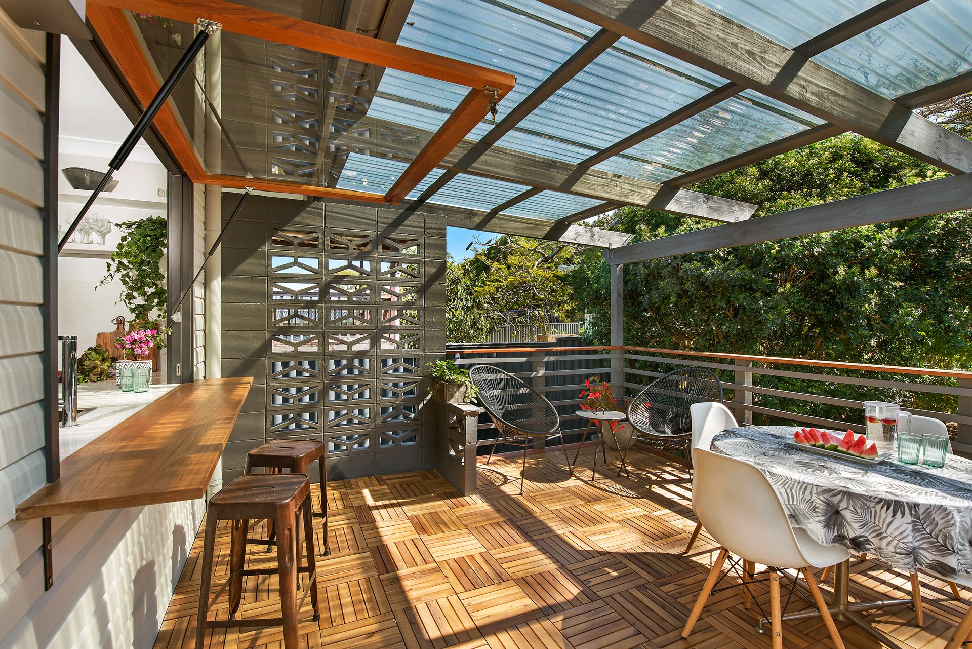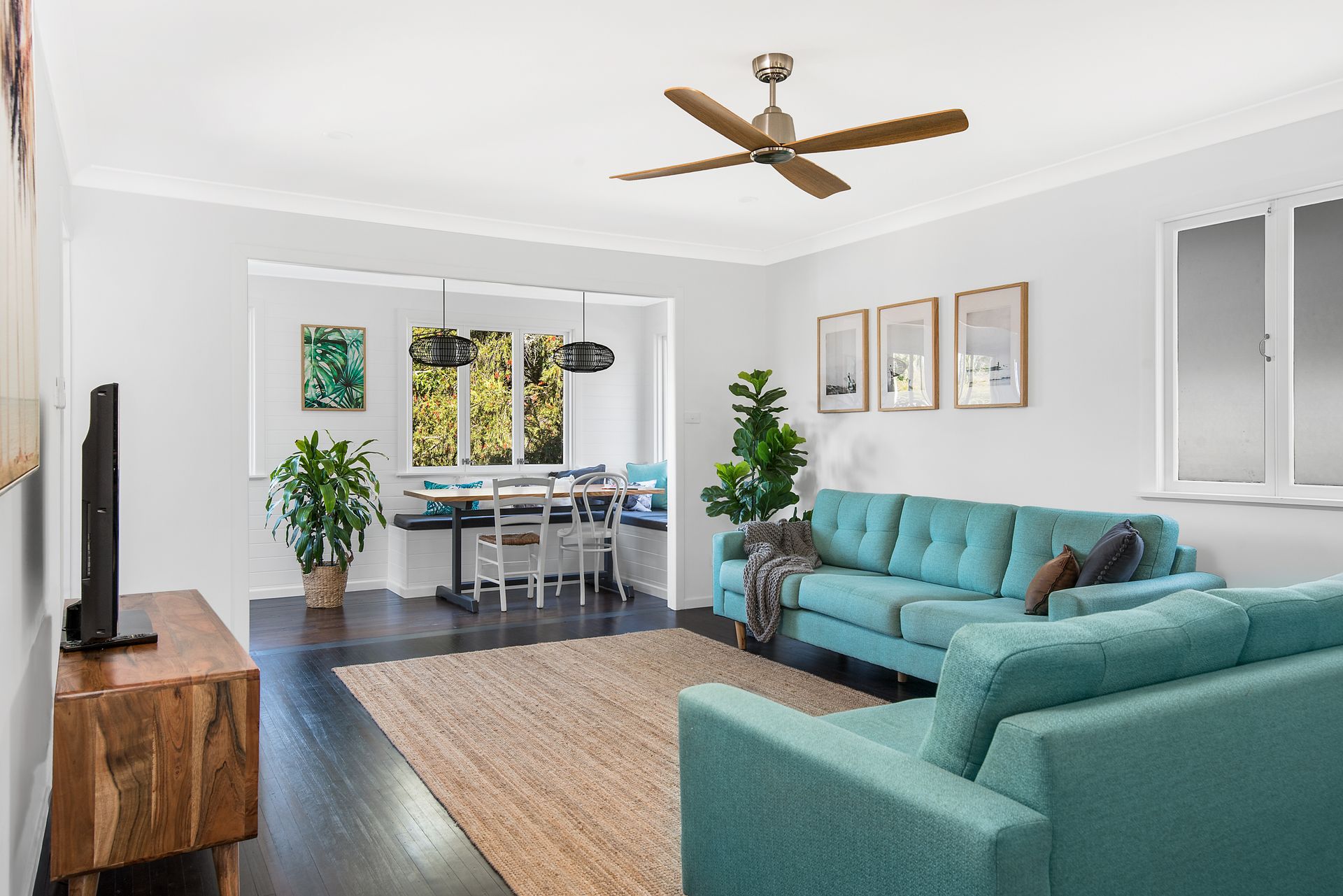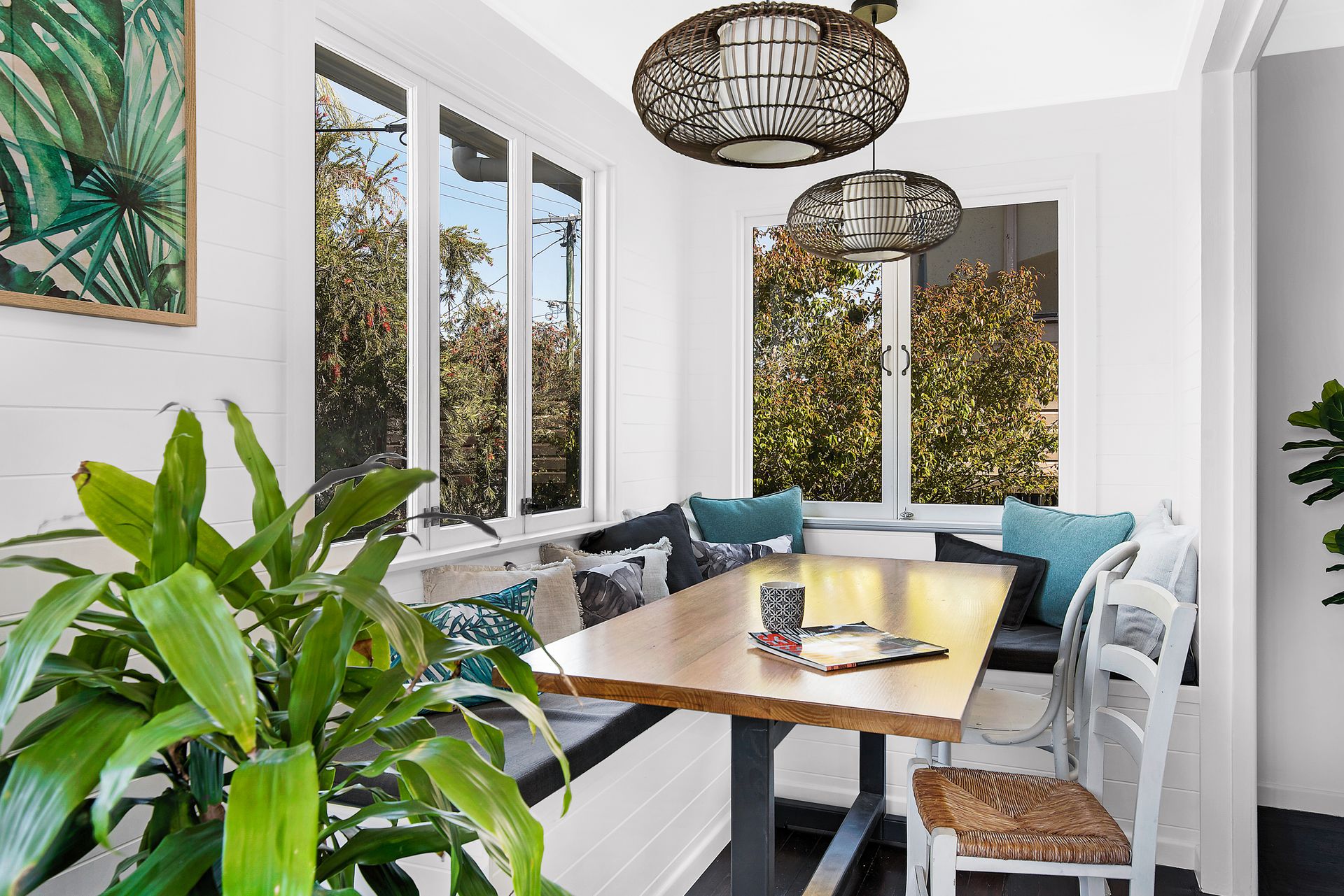 Entering the home, you're immediately greeted by a lovely bright and airy sunroom, with built in seating and flooded with natural light. The open plan living room is a brilliant space, with plenty of room for lounge and dining combination. The gorgeous dark polished floorboards lead into the modern kitchen with stone bench, dishwasher and servery out to the deck for a glorious outdoor living option.