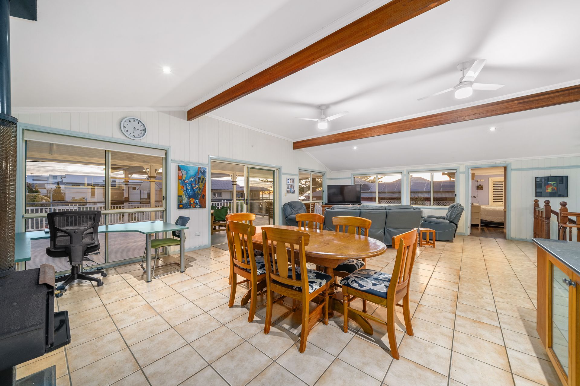 Set over two levels, this five-bedroom home spacious living suitable for multigenerational families, large households, and those working from home. Classic Queenslander features such as VJ panels, raked ceilings, and timeless hallway arches add elegant details throughout.