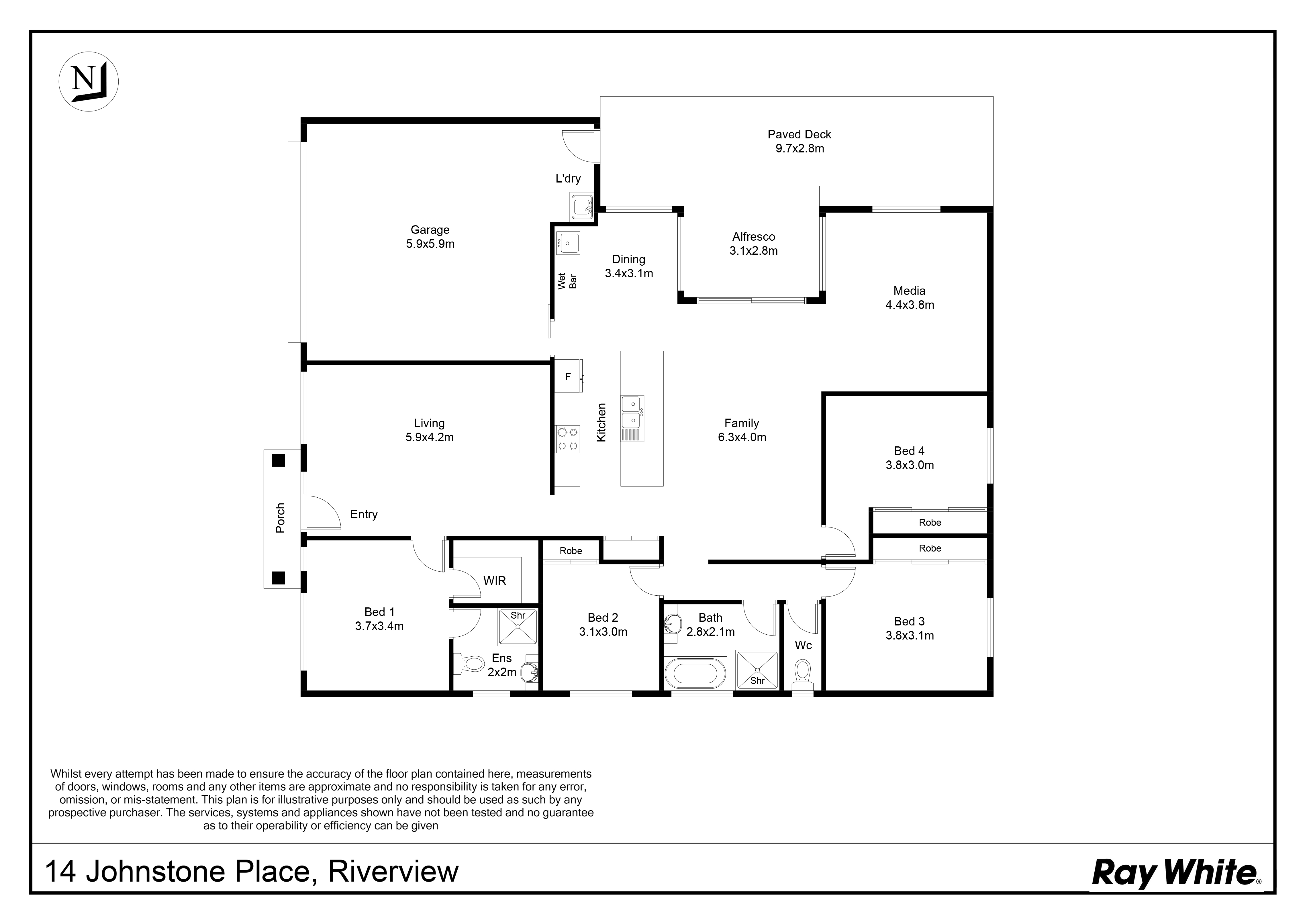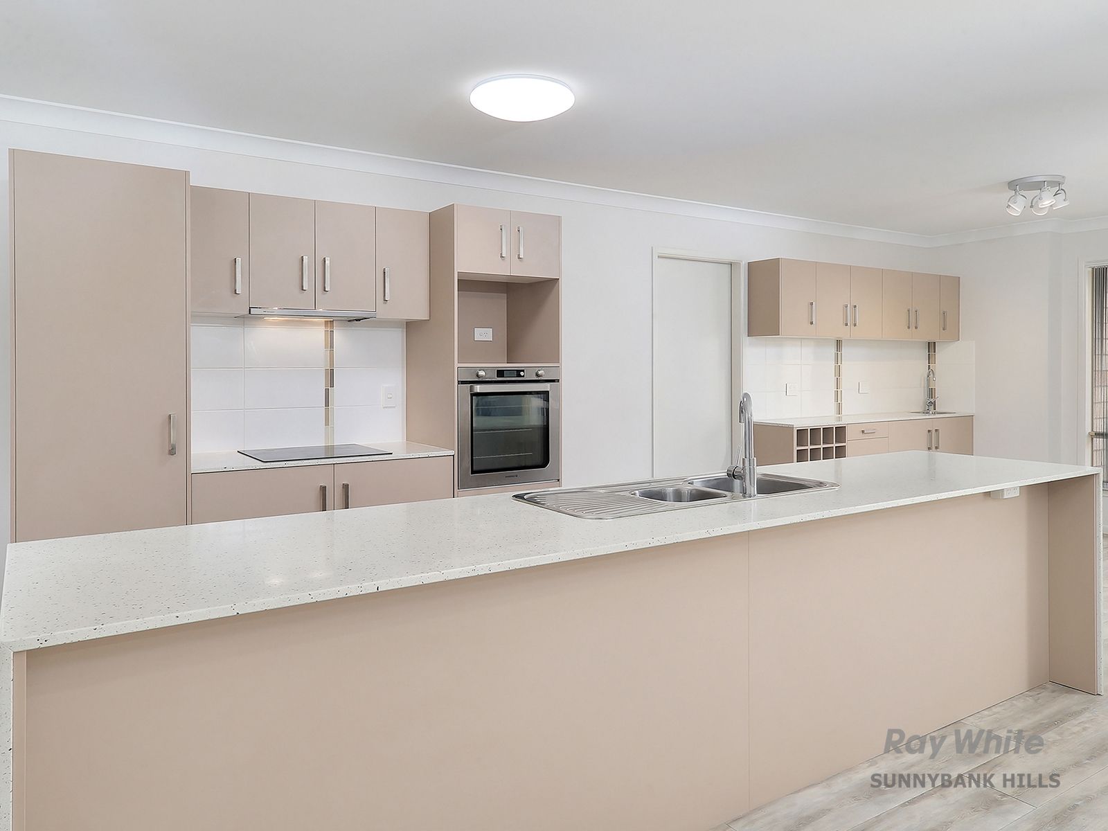 - Stunning formal lounge space on entry with ornate lights is an enjoyable entertainment room for special occasions. - Light and airy with natural breeze and sunlight, the open-plan family living, media and dining space is pure magic. It features a huge area for comfy sofas and separate space for media equipment along with a dedicated area for a dining table setting with sliding doors to the alfresco patio. - Centrepiece kitchen with massive island bench featuring stone worktops with waterfall edges, integrated sink and quality cabinetry underneath. Behind is another series of cupboards and joinery with wall mounted oven and cooktop. - The dining area includes built-in buffet cabinetry complete with wine rack, sink and stone-top finish blending seamlessly with the kitchen facility. - There are four large bedrooms that comprise of quality carpets, built-in robe storage plus ducted air conditioning to ensure all season comfort. - Front of house, master bedroom includes a walk-in robe personal ensuite with modern finish, built-in shelving and wall-hung vanity. - Main bathroom includes a separate shower and bathtub and a large vanity. - Integrated laundry in the double garage with internal doorway.