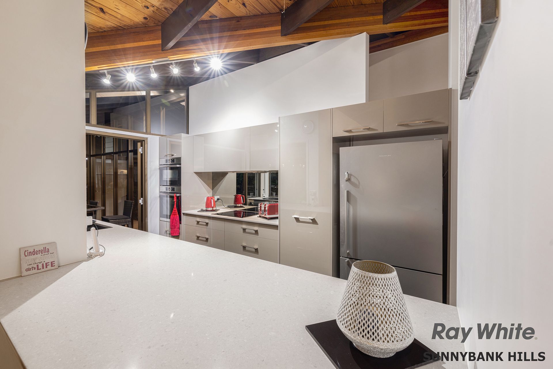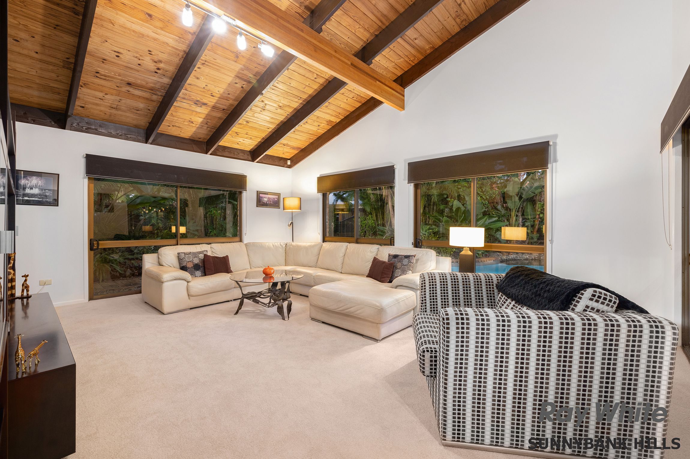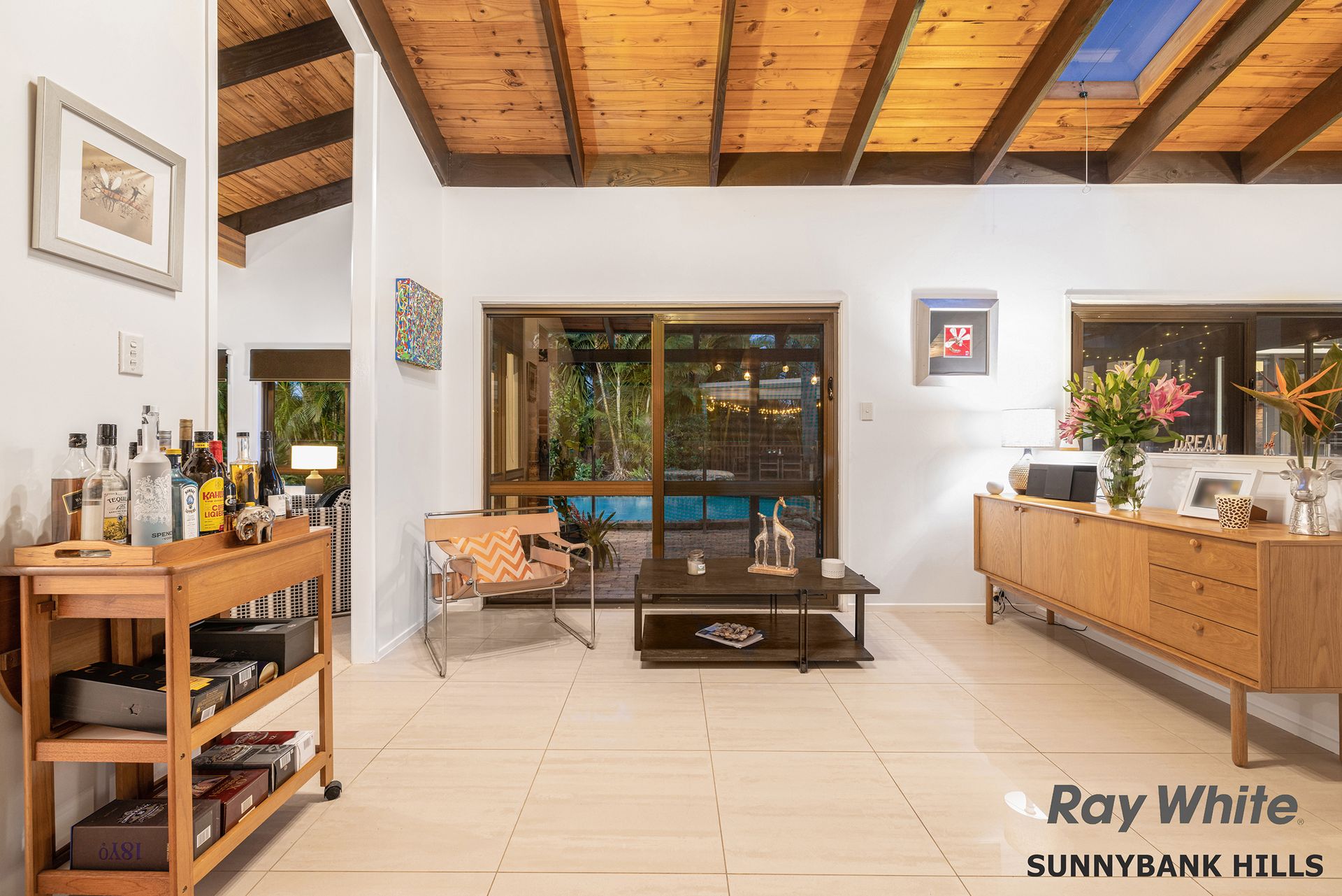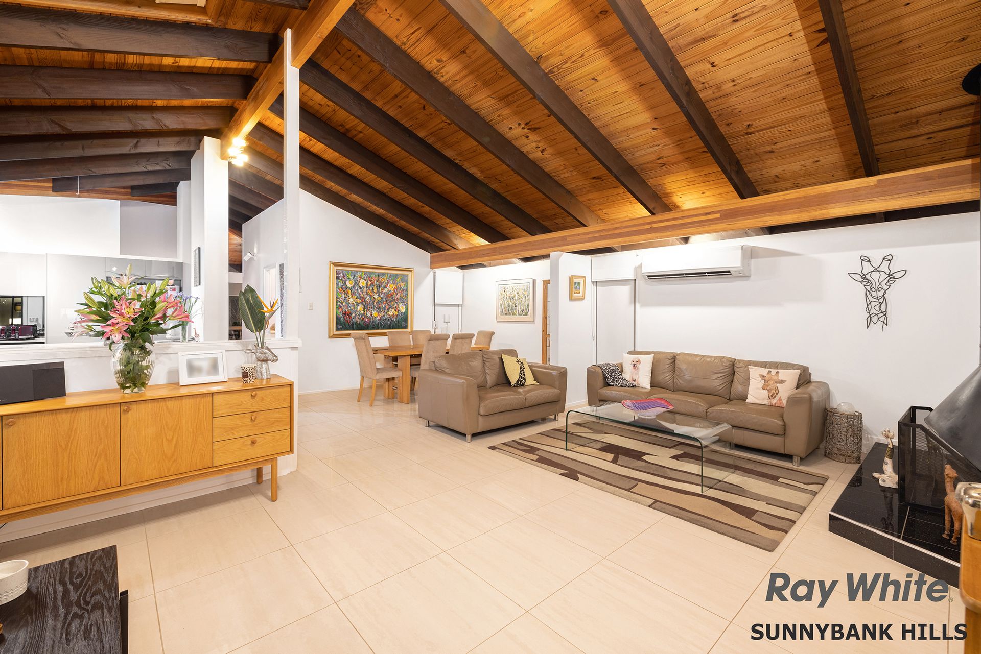 - Magnificent entrance with double doors that flows to multiple living areas. - Towering ceilings with exposed timber beams and solid timber linings to formal lounge with thick carpets and pool views. - Tiled and open-plan everyday living area with skylight, air conditioning and fireplace for cosy winter nights. - Connecting dining area both formal and casual spaces with partition wall. - High quality contemporary galley kitchen with premium cabinetry and stone benches. Fitted with top range appliances and large fridge space. - Self-contained guest bedroom with own ensuite and living area. - Four beautifully big bedrooms, all with built-in robes on lower level. - Master has a huge walk-in robe and luxury ensuite with outdoor style shower, all fully tiled and with quality tapware. A private patio area connects this room and looks across to the kitchen. - Luxury main bathroom with corner bath, separate shower and vanity. - Good-size home office area in a quiet position of home with storage.