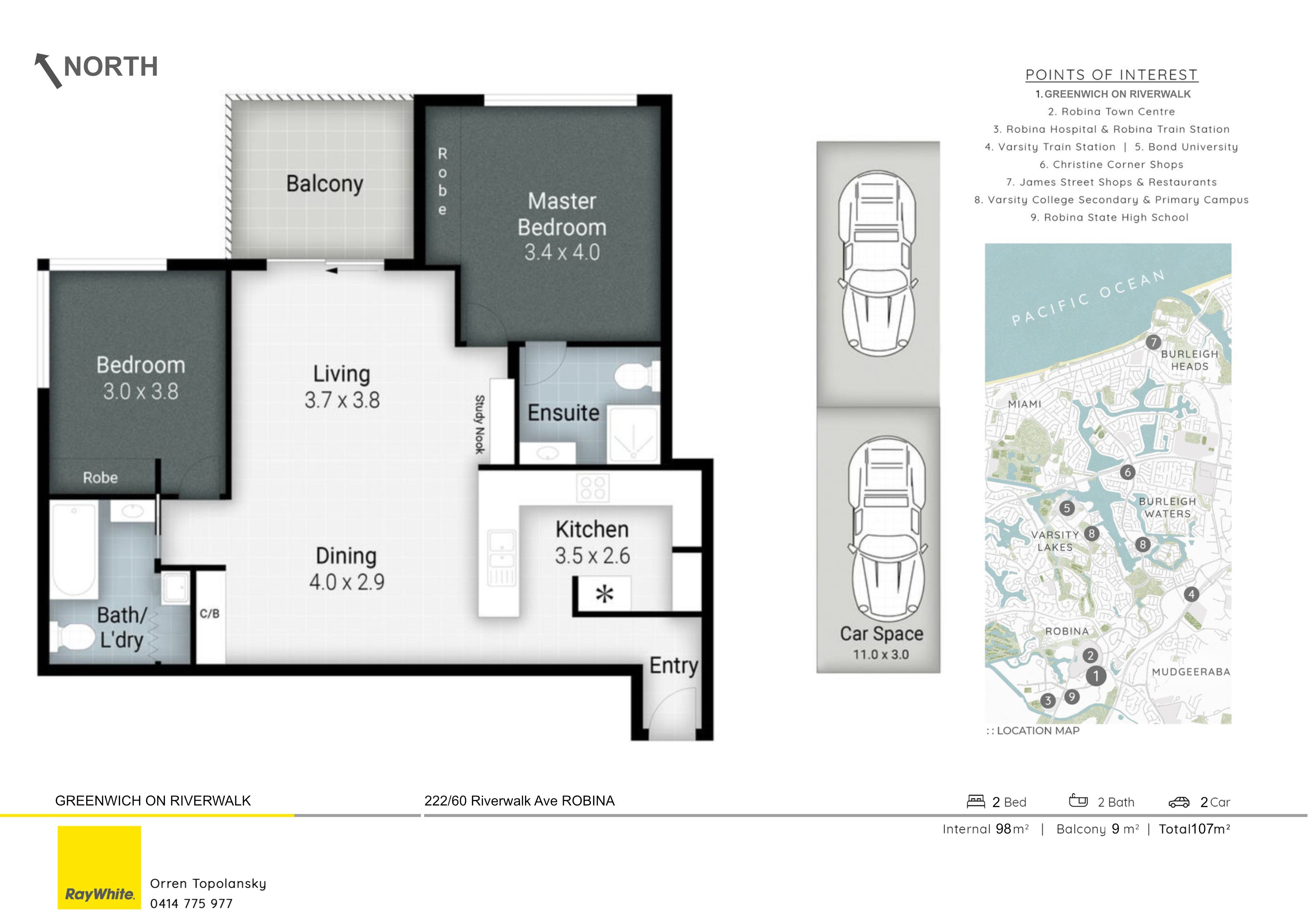 APPROX. DISTANCES: • Major Shopping Centre (Robina Town Centre) - 400 m • ALDI - 250m • Beach - 7.8 km • Primary School (Robina SS) - 3.6 km • High School (Robina SHS) - 1.4 km • Bond University - 4.7 km • Bus Stop - 350 m • Parkland - 100 m • Highway - 950 m • Train Station - 1.3 km • Robina Hospital - 1.4 km