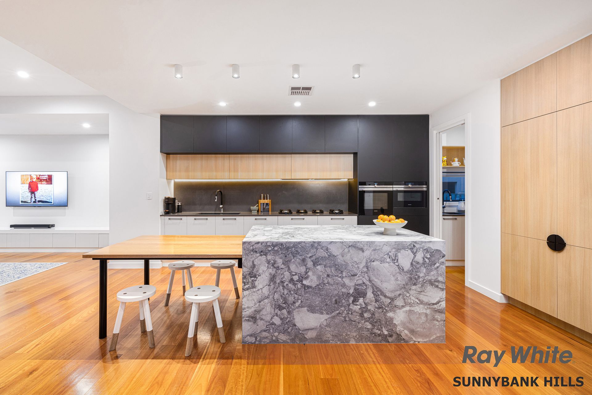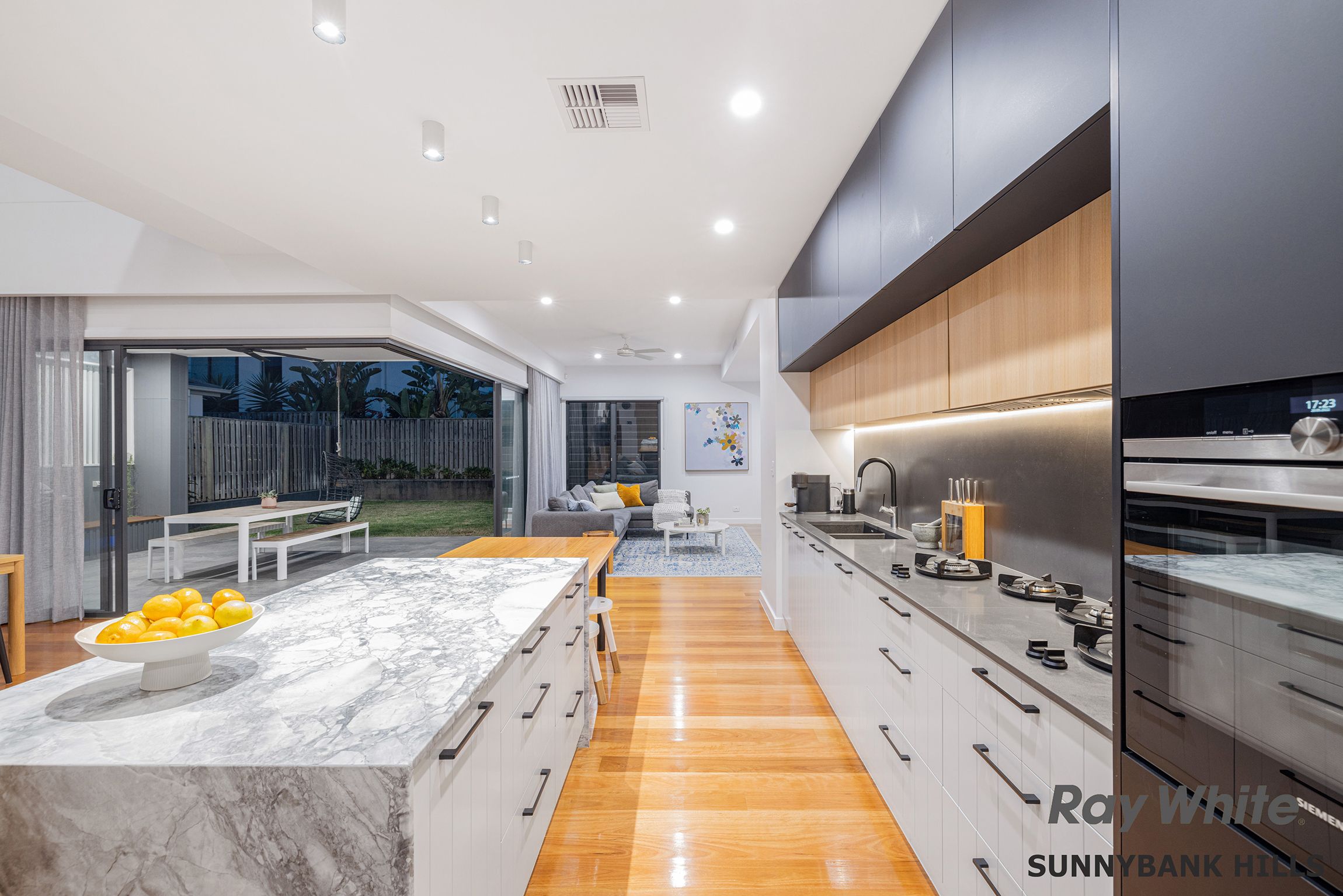 Abundant in natural light, North-facing everyday living reveals a spacious open plan design which hosts the formal lounge, dining and a bespoke chef's kitchen fitted for the culinary connoisseur with a custom dolomite stone bench, butler's pantry, and a suite of high-end appliances including a Pitt cooktop, Siemens steam oven and pyrolytic oven. Destined to belong to those who love to play host, the interiors guide an effortless transition to the alfresco entertaining where you'll find the perfect setting for memorable event-scale evenings and casual weekends making use of the built-in Weber BBQ whilst enjoying the shimmering backdrop provided by the glass-framed pool.