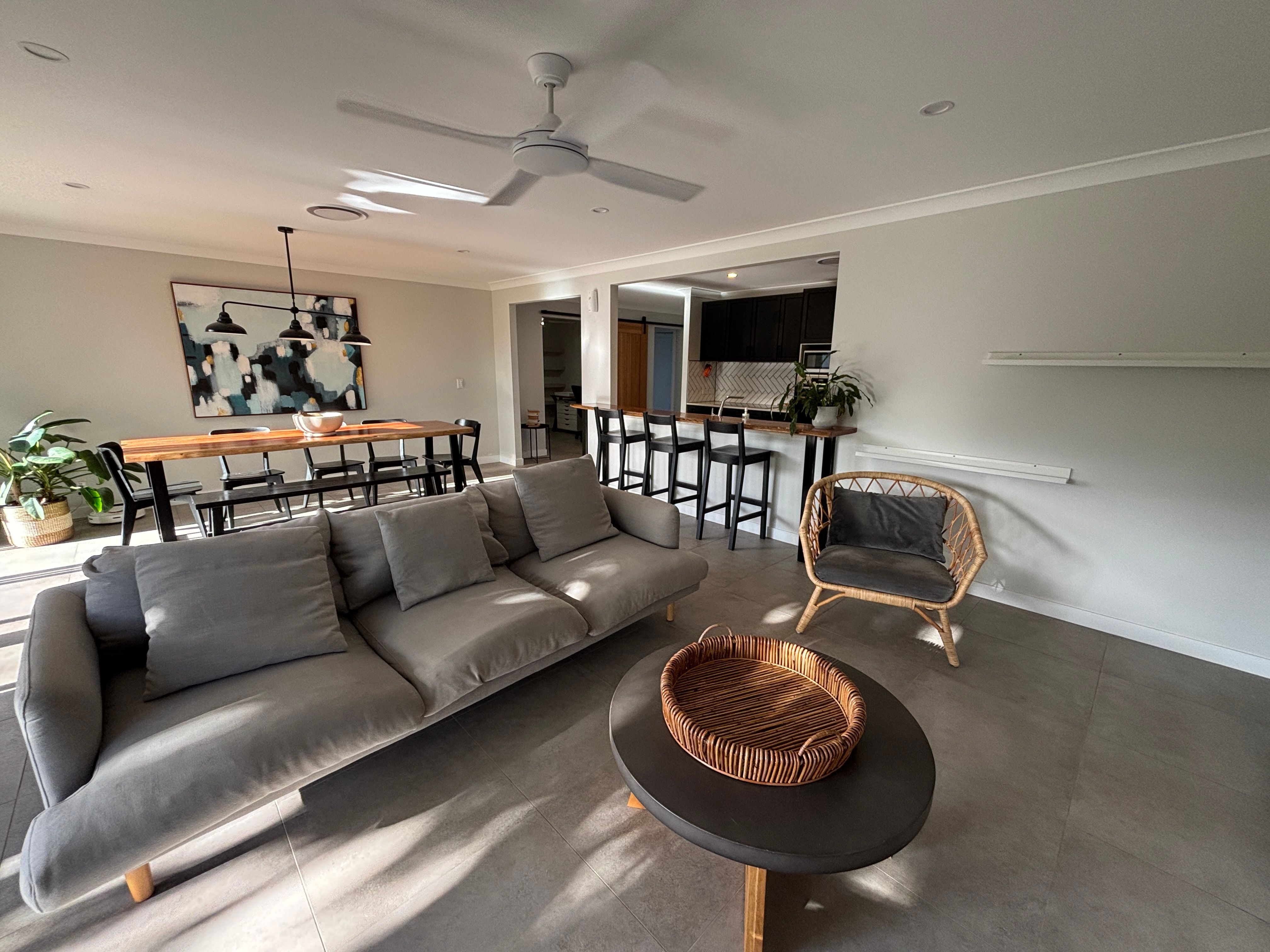 Property Features: • 4 spacious bedrooms + dedicated office • Huge master suite with walk-in robe and ensuite featuring a luxurious bath tub • Two modern bathrooms • Open-plan living and dining with stylish furnishings • Fully equipped kitchen with everything you need • Ceiling fans & ducted air conditioning throughout • Solar power for energy efficiency