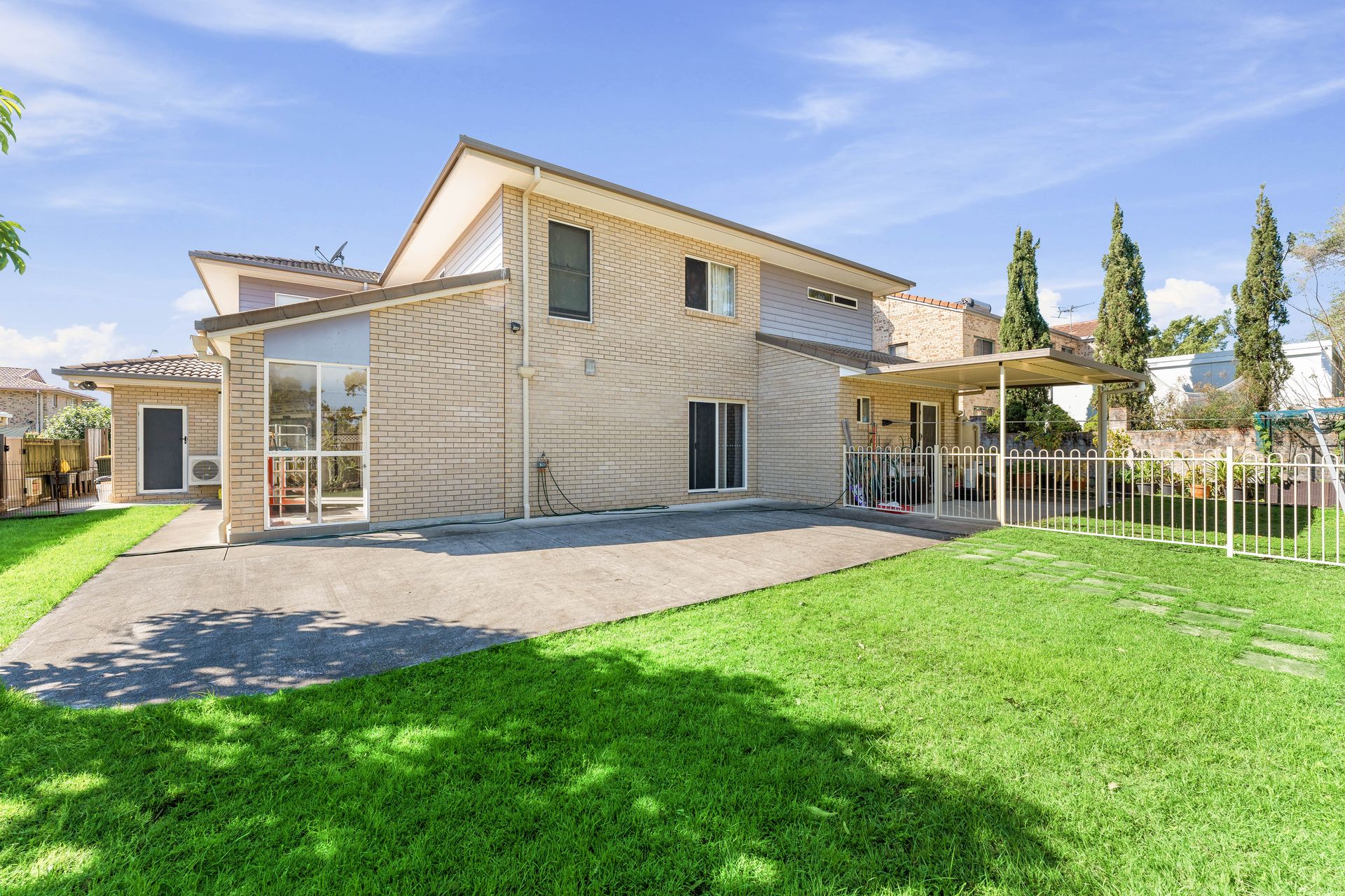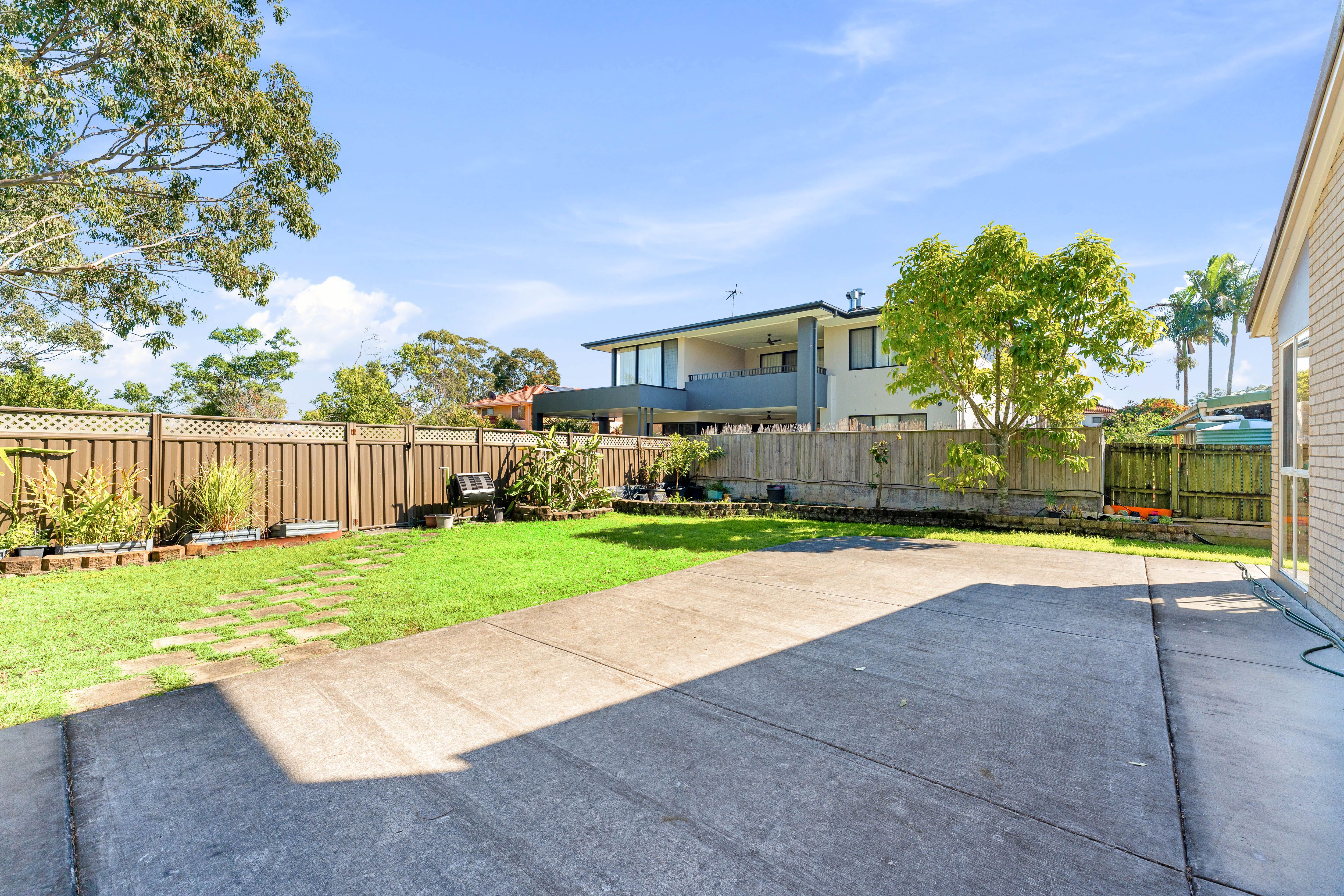 To the grounds now, and if low - maintenance landscaping is on your wish list - tick that box off! Out back, a covered patio makes a lovely spot for enjoying alfresco meals and listening to birdsong from the trees in the fabulous park and playground behind the rear fence. An open-air concrete pad extends off the patio - perfect for handball and practicing all the hoop sports - spilling onto more easy-mow lawn.