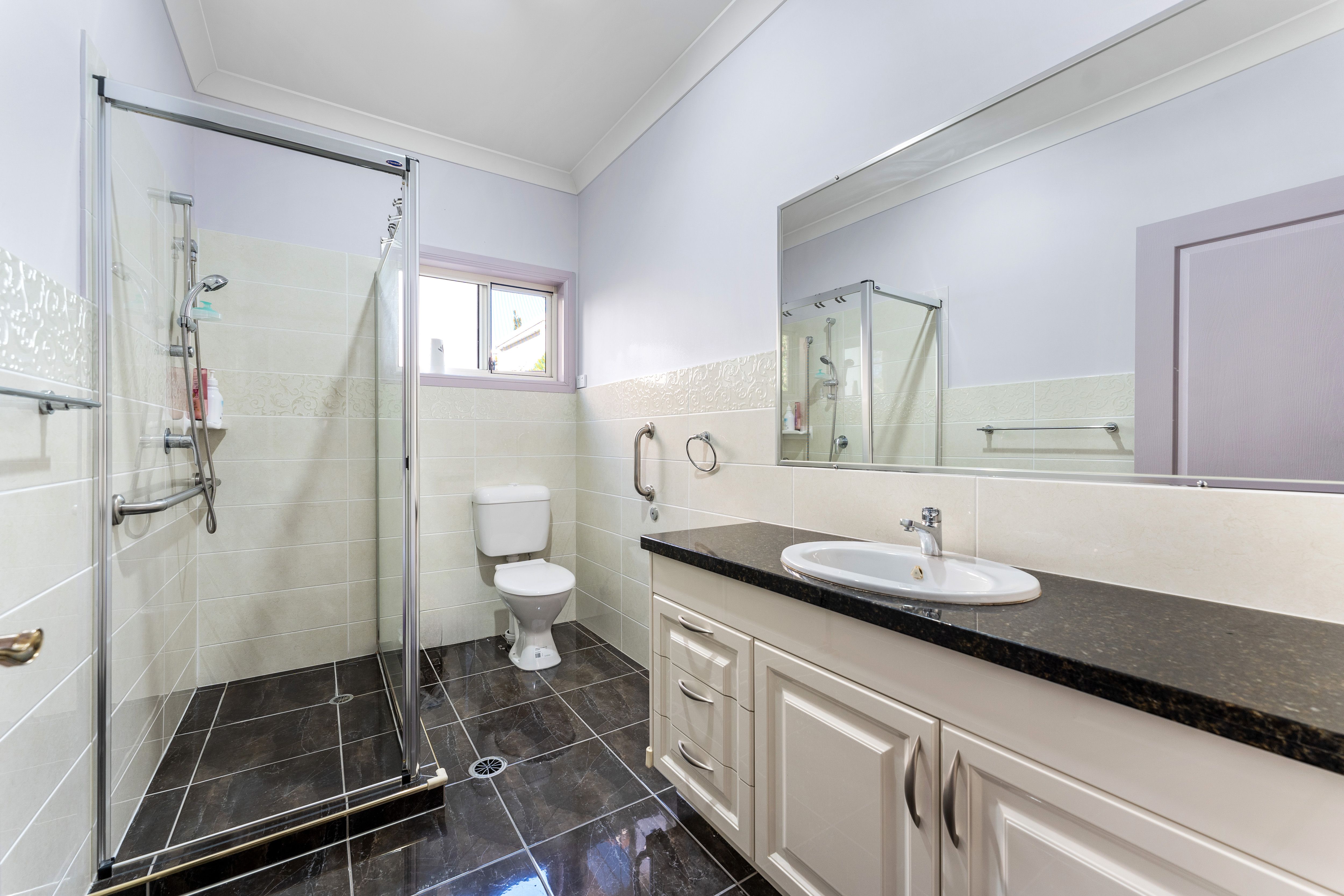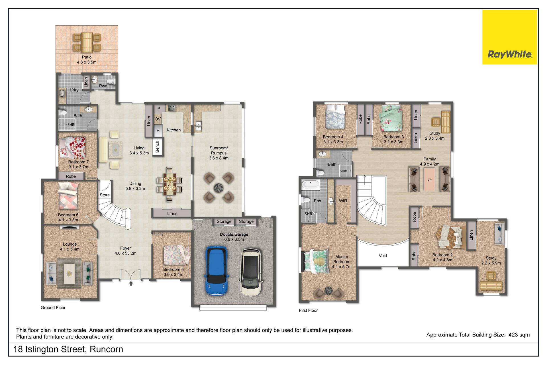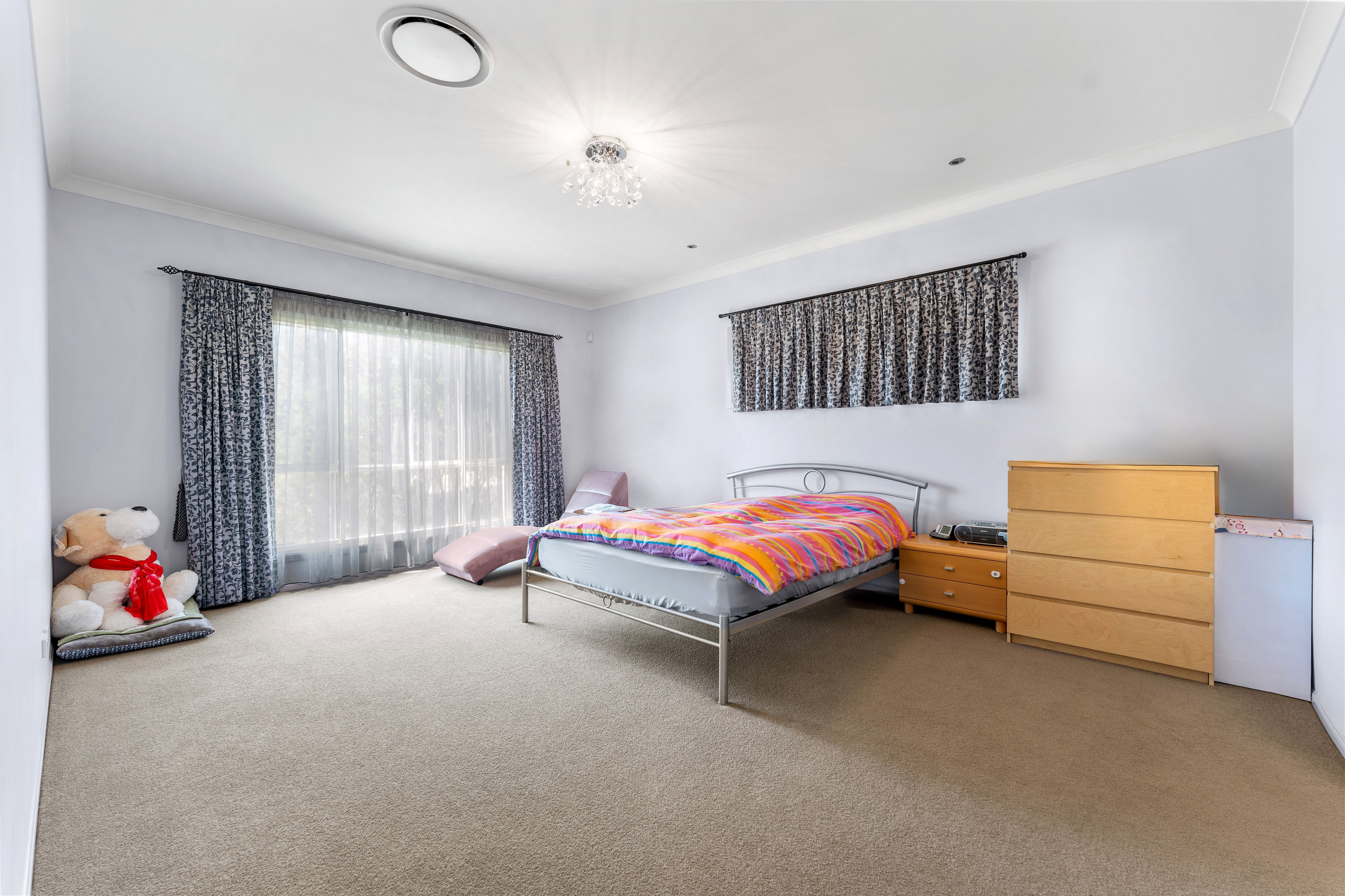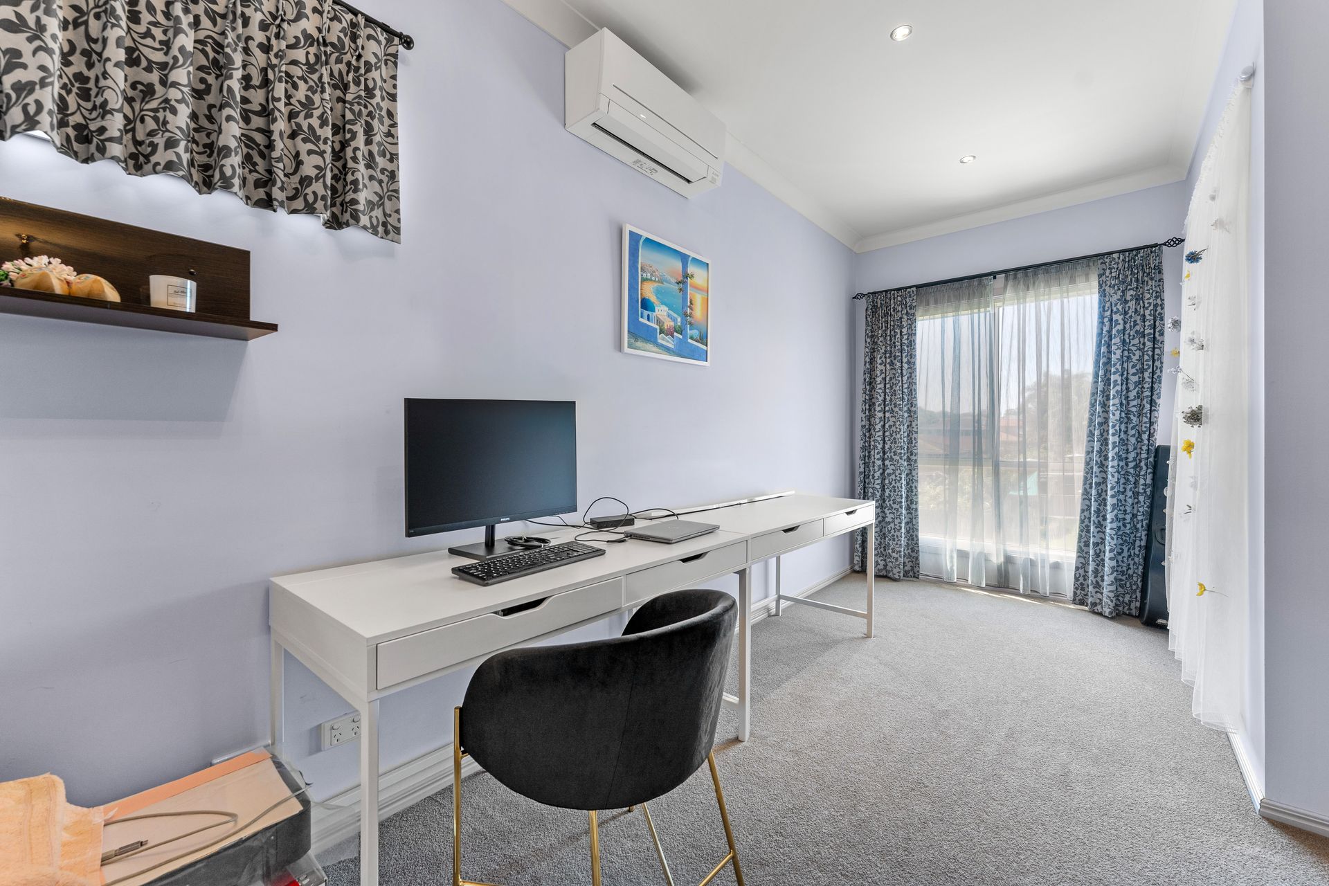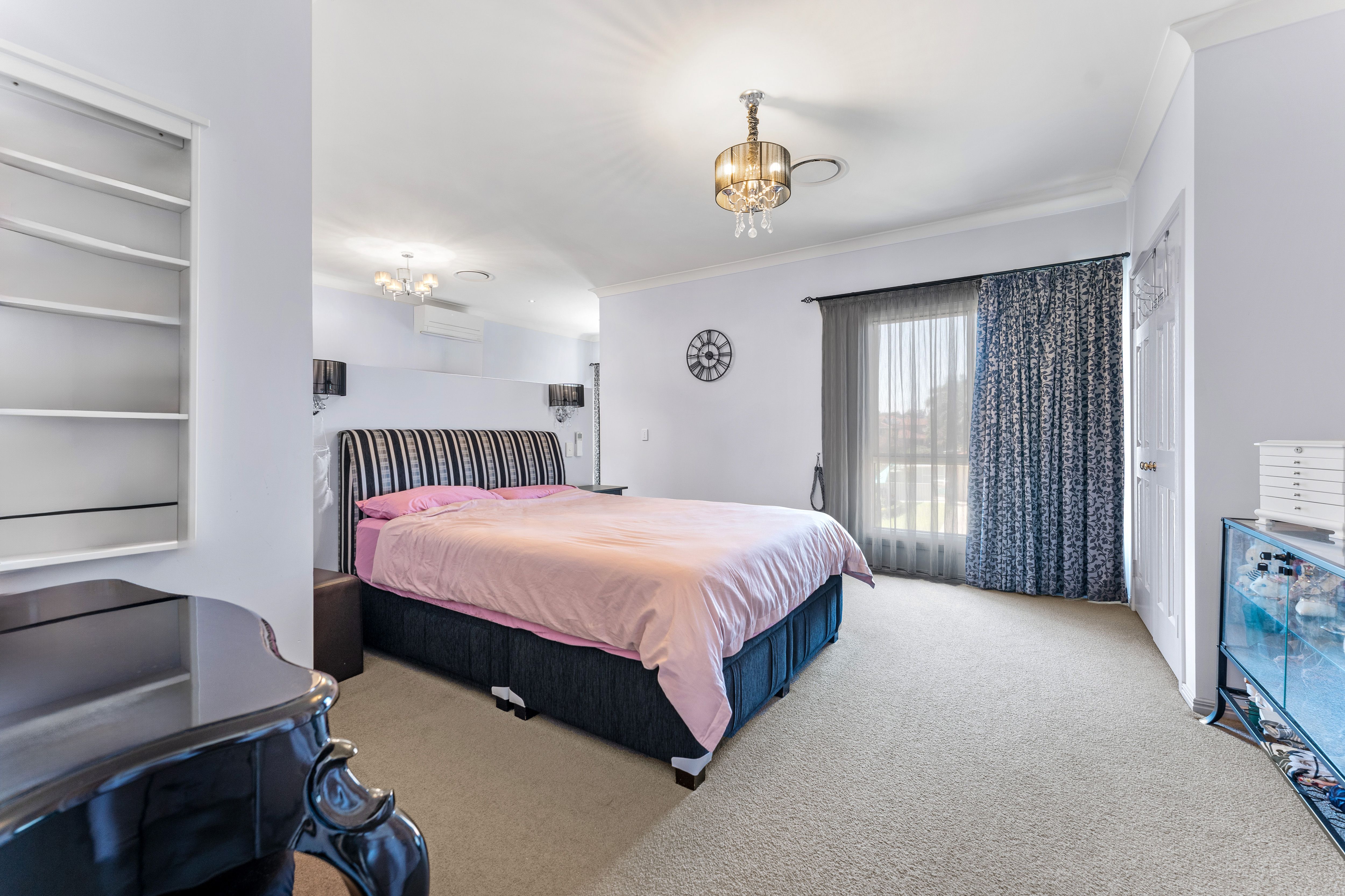 The carpeted accommodations are nicely balanced, with 3 downstairs - serviced by a full bathroom and a powder room next to the laundry, and 4 above - branching off a family room on the landing, with a study area next to it fitted with built-in storage. The super-spacious master is the most well-appointed of the upstairs bedrooms, sporting a walk-in robe and a luxe ensuite with both a shower and tub, but - if you have in-laws or long-term guests staying, the other front-facing bedroom will be a welcome find. This one has 2 built-in robes and an adjoining sitting area or study with more storage and A/C. Like the back 2 bedrooms, also fitted with BIRs, the guest suite is serviced by a second full bathroom with a shower.