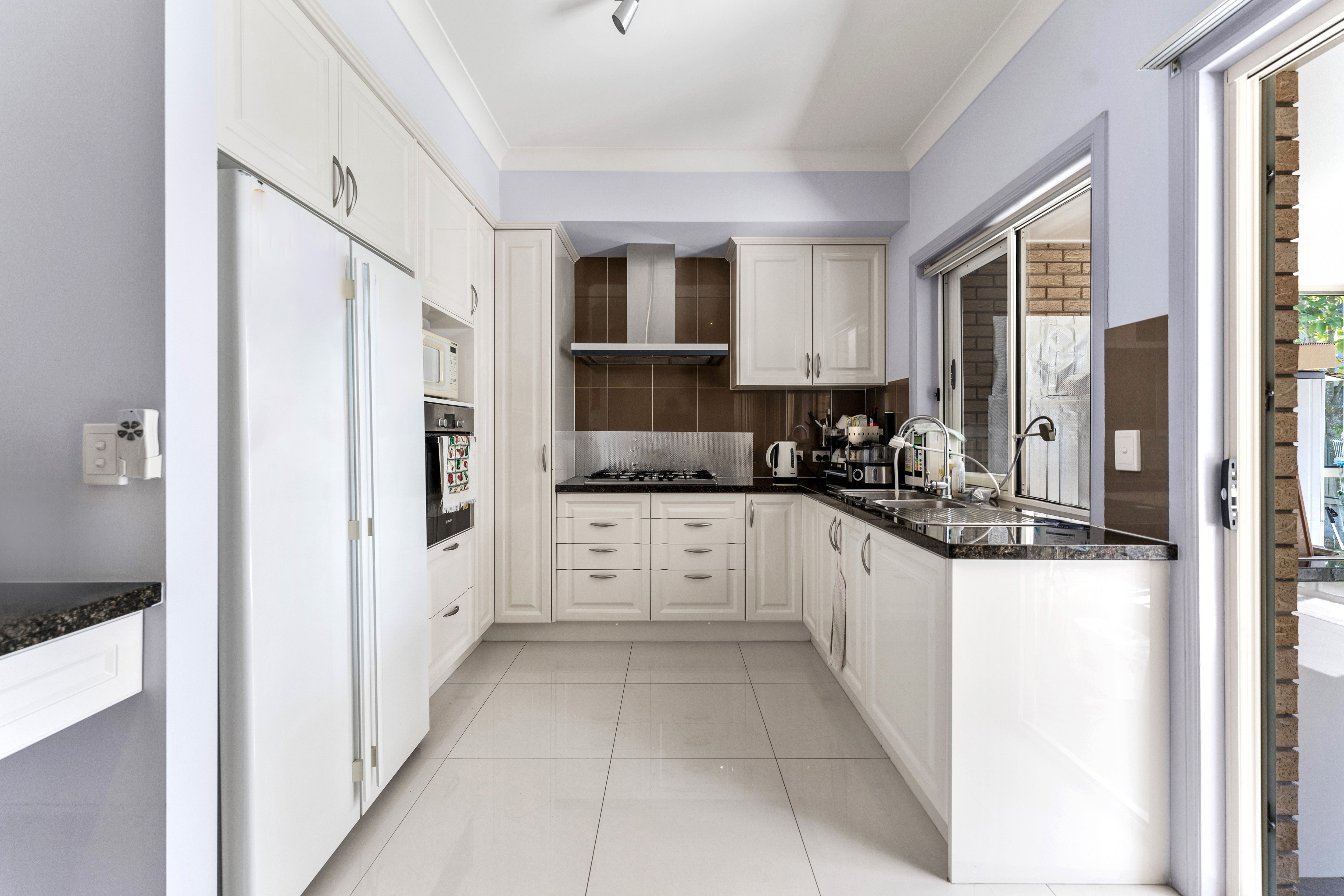 While the front lounge has carpet, large, polished tiles are an ideal choice for the other social spaces that will see constant trekking between indoors and out. The kitchen is also well-appointed to cater to a house of this size with reams of moulded cabinetry, a big gas cooker with a stainless steel/tiled splashback up to its rangehood, a wall oven, space to house a double door fridge/freezer, and chic gooseneck tapware.