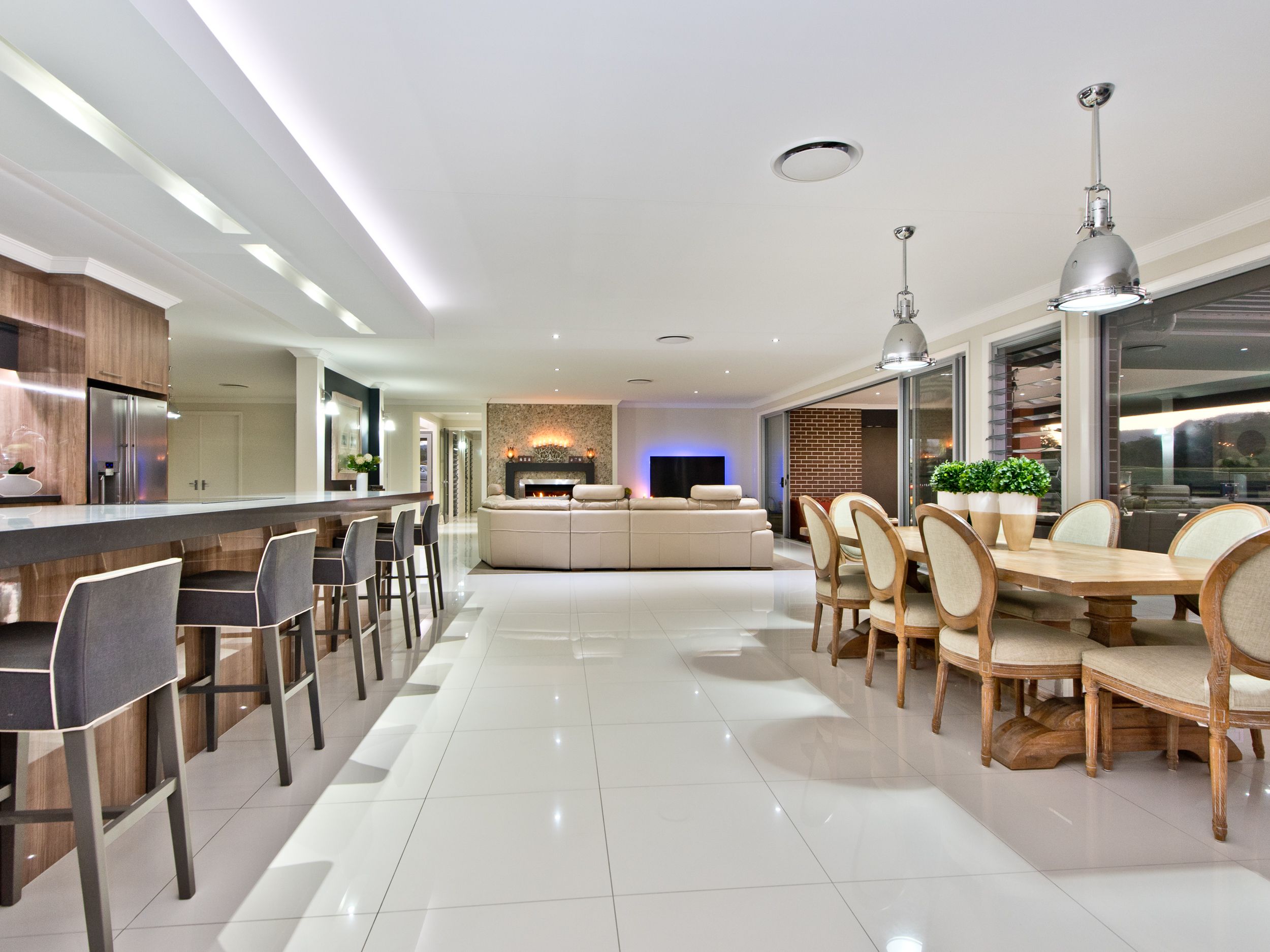 Polished porcelain tiles, high ceilings and warm neutral colours add a touch of understated elegance to this highly adaptable space that can easily accommodate everything from quiet family living to entertaining with style and comfort all year round.