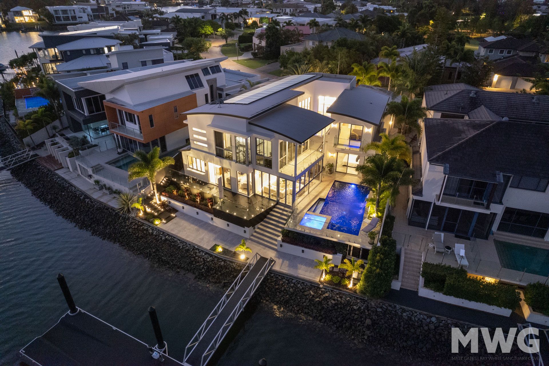 Indulge in the splendor of the master bedroom, which includes a private retreat and sweeping water vistas, offering a sanctuary of serenity. Additionally, a second master bedroom on the ground floor provides direct access to the pool, creating a seamless blend of indoor and outdoor living.