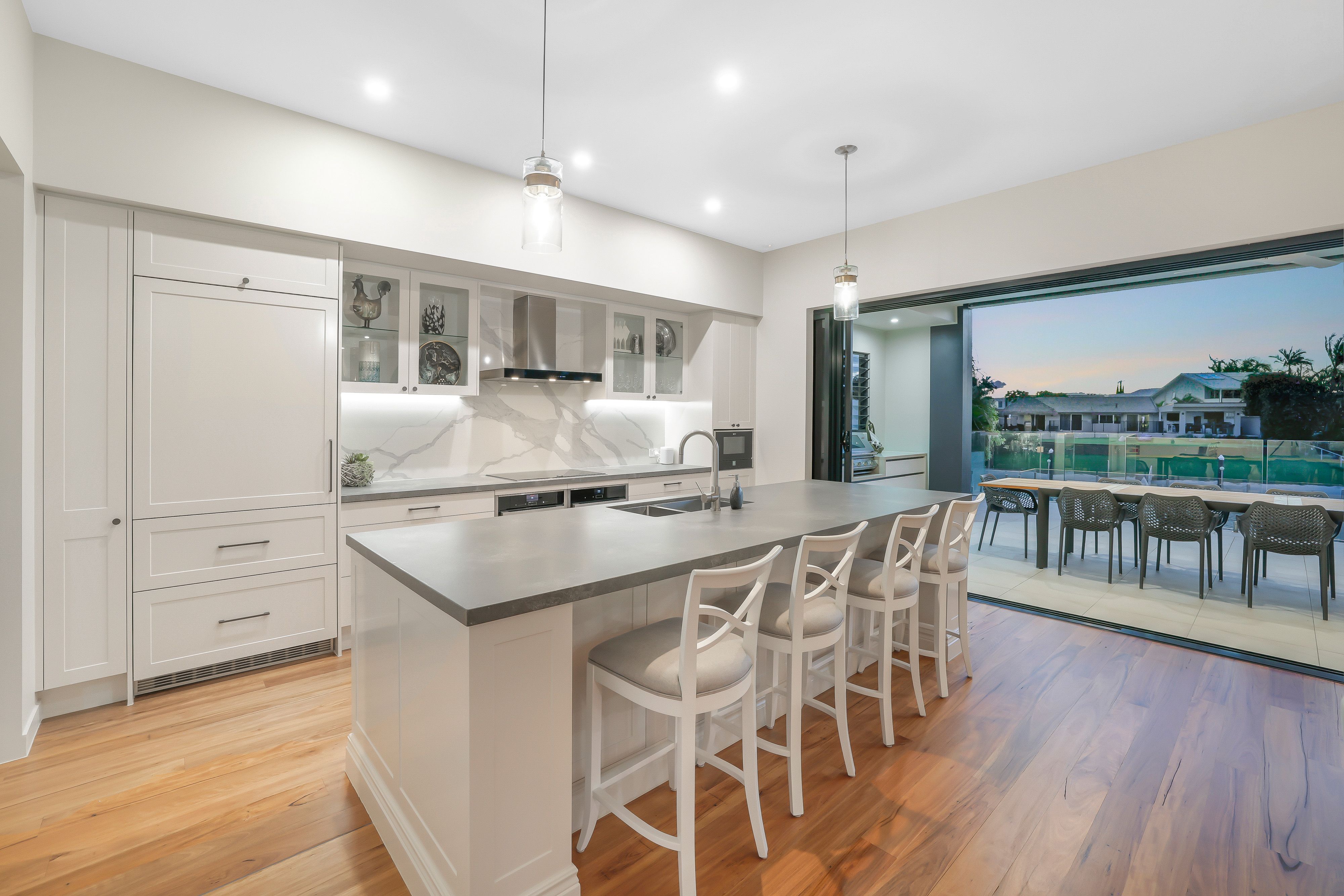 The Chef's kitchen with Liebherr and Neff appliances is paired with an extensive butler's pantry, while pocket slider doors peel back to reveal a seamless flow onto the waterfront terrace.