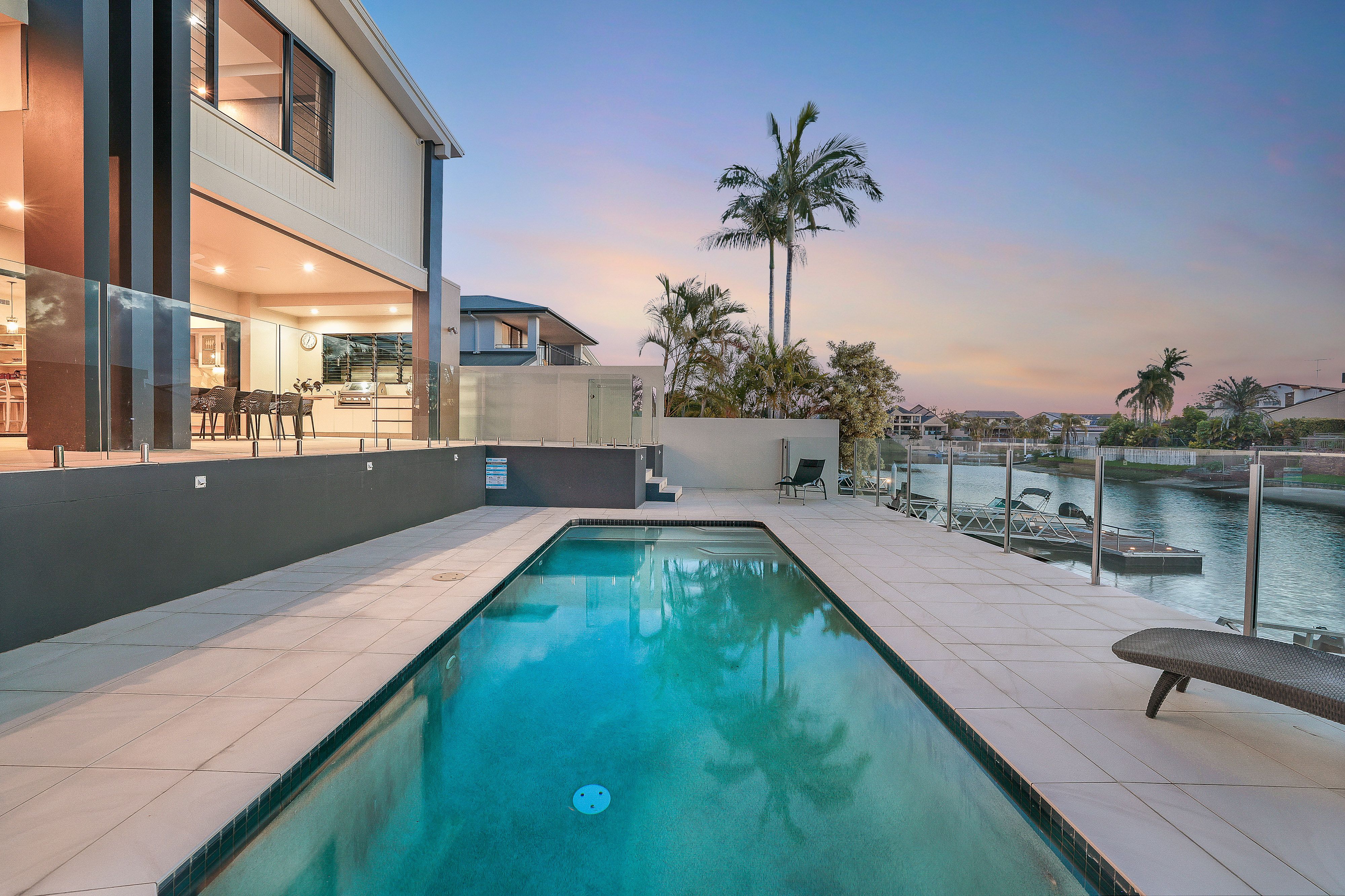 - Modern masterpiece on a 737m2 block - Stunning blackbutt timber and engineered stone - Chef's kitchen with Liebherr integrated fridge and wine fridge, dual Neff ovens (self-cleaning) and steamer, shaker profile cabinetry and stone island and splashback - Extensive butler's pantry with ample storage, plumbed fridge, Zip tap and undermount sink - Sprawling open plan living and dining zone with pocket slider doors that open onto the waterfront terrace - Upper level living room and a separate media room with surround sound - Elegant and expansive master suite with water views, triple walk-in robes and a luxury ensuite with stone floor- to-ceiling tiles, freestanding bath and a weather sensor Velux skylight - Vast alfresco terrace with built-in BBQ, overlooks pool and peaceful waterways - Jet ski dock and pontoon with power plus established, easy-care gardens; - Study with custom fitted cabinetry and powder rooms on both levels - Striking statement staircase with signature lighting and blackbutt timber finishes - Intercom, security cameras, Crimsafe screens, NBN internet, ducted air-conditioning and Sonos throughout - Advantage air and lights controlled through app, with Saturn series light switches and Atom Wiz lights - Underground rainwater tank, 3 phase power internal switchboard, new vacumaid and 10kW solar power with Fronius inverter - Wool carpets plus aluminium windows dressed by heavy curtain and sheers or plantation shutters - Double garage with epoxy floor and storage as well as a secure double carport