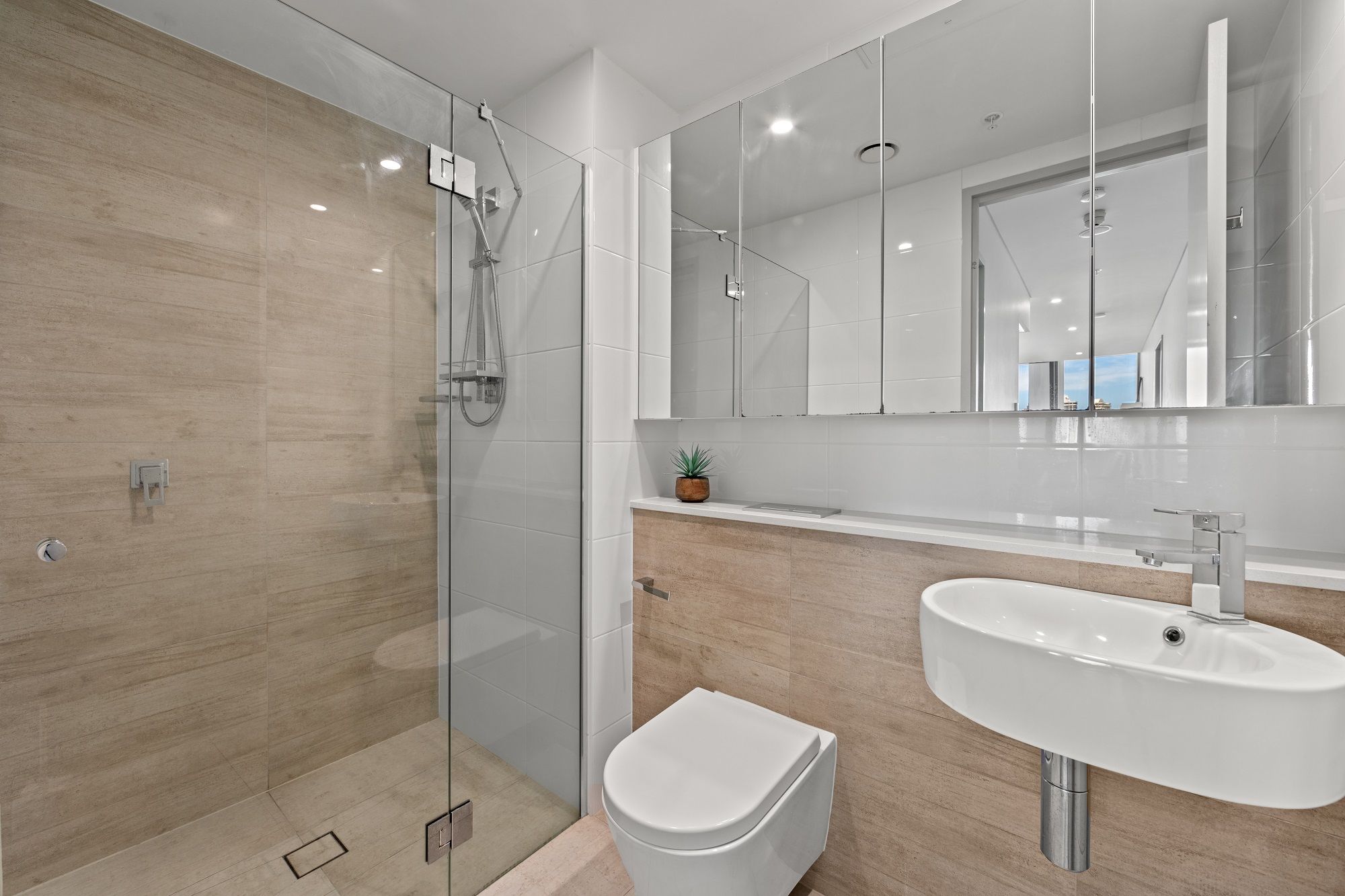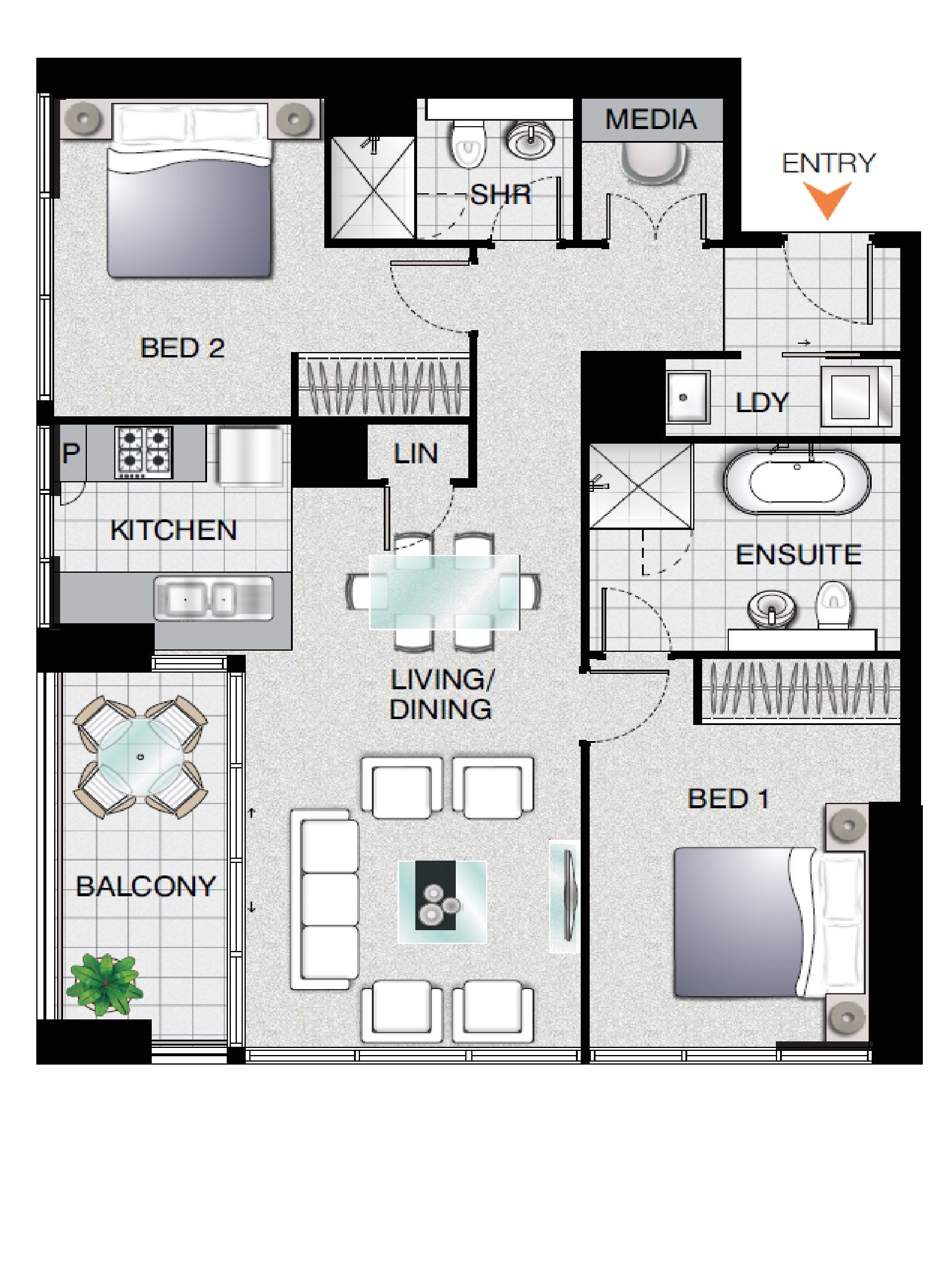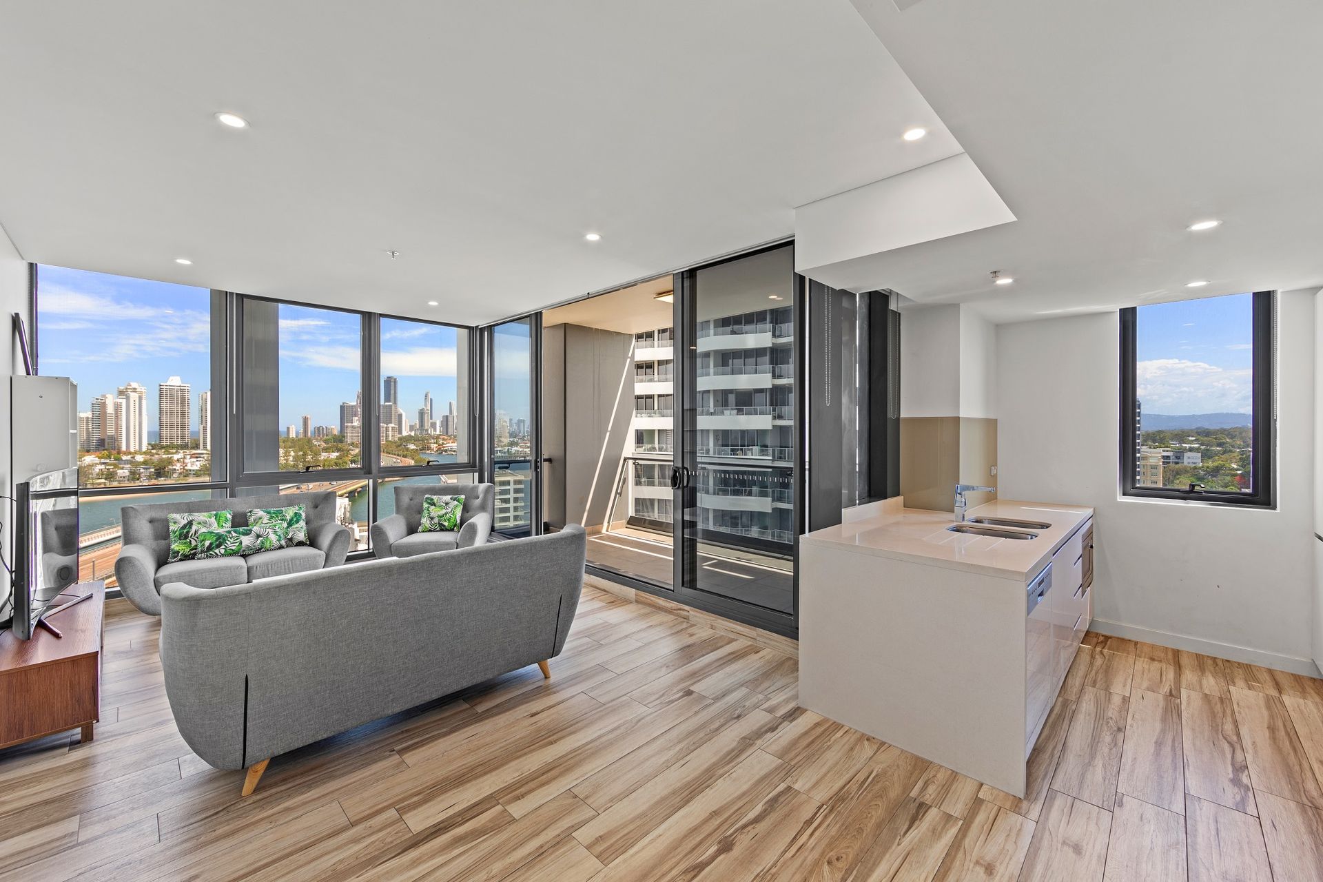 Features: * Two bedrooms, one with ensuite and built in robes. An open-plan design, spacious living areas and effective cross-flow ventilation. *Modern Kitchens are equipped with quality stainless-steel appliances including microwave, oven, gas stovetop, integrated dishwasher, Stone benchtops, polyurethane cabinetry and soft closing drawers. *Contemporary bathroom, mirrored built-in wardrobes in all bedrooms, wall-mounted floating basin, frameless glass showers, floor-to-ceiling tiles. *Comfortable living areas with study nook: flooded with natural light from the floor-to-ceiling glass, concealed air conditioning, internal laundry with dryer.