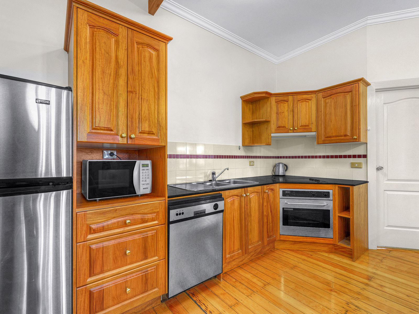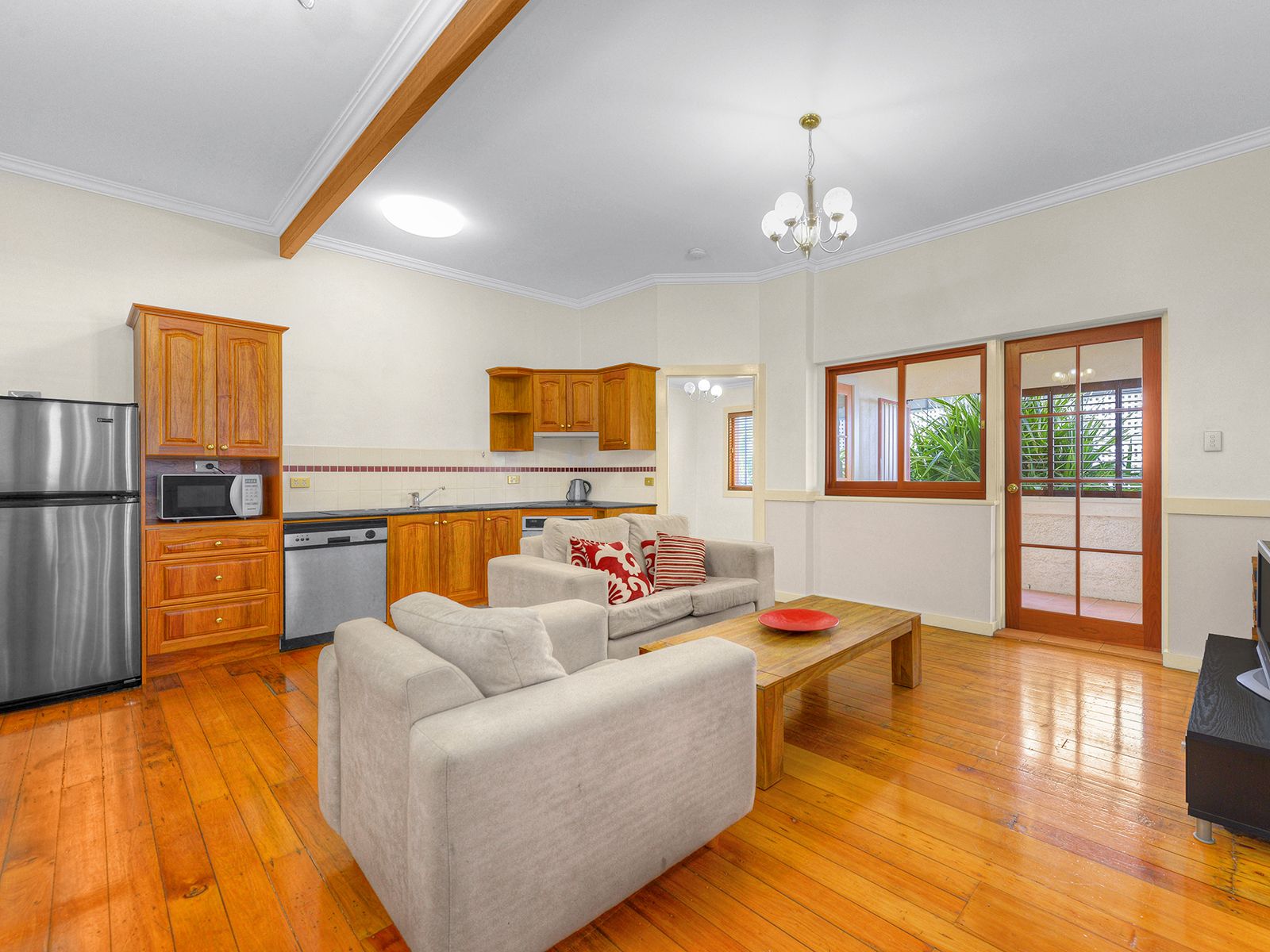 Entering via the enclosed balcony you will arrive in the open plan living, dining and kitchen space. Polished timber floor boards and timber kitchen cabinetry add so much character and charm to this pristine apartment.
