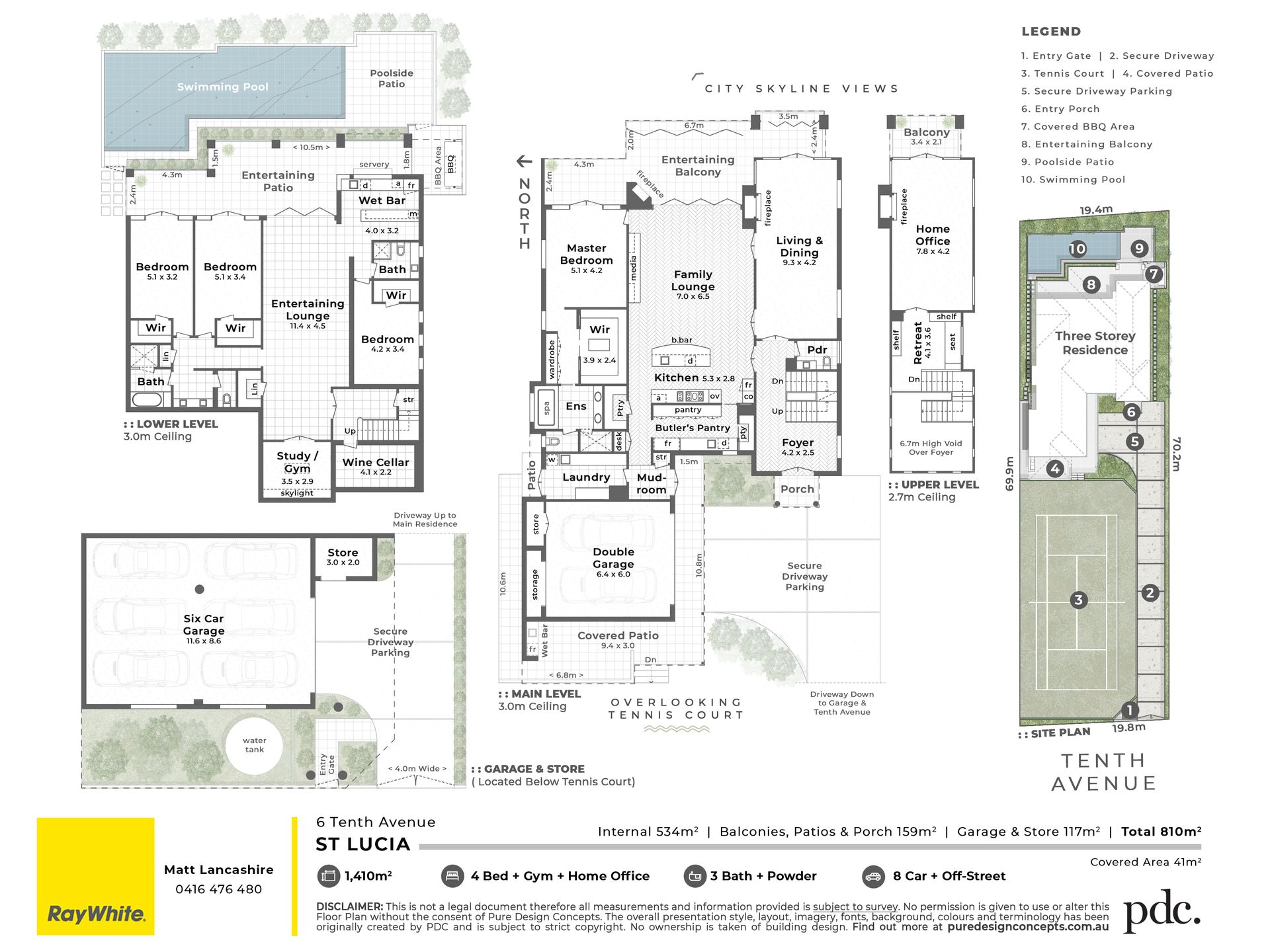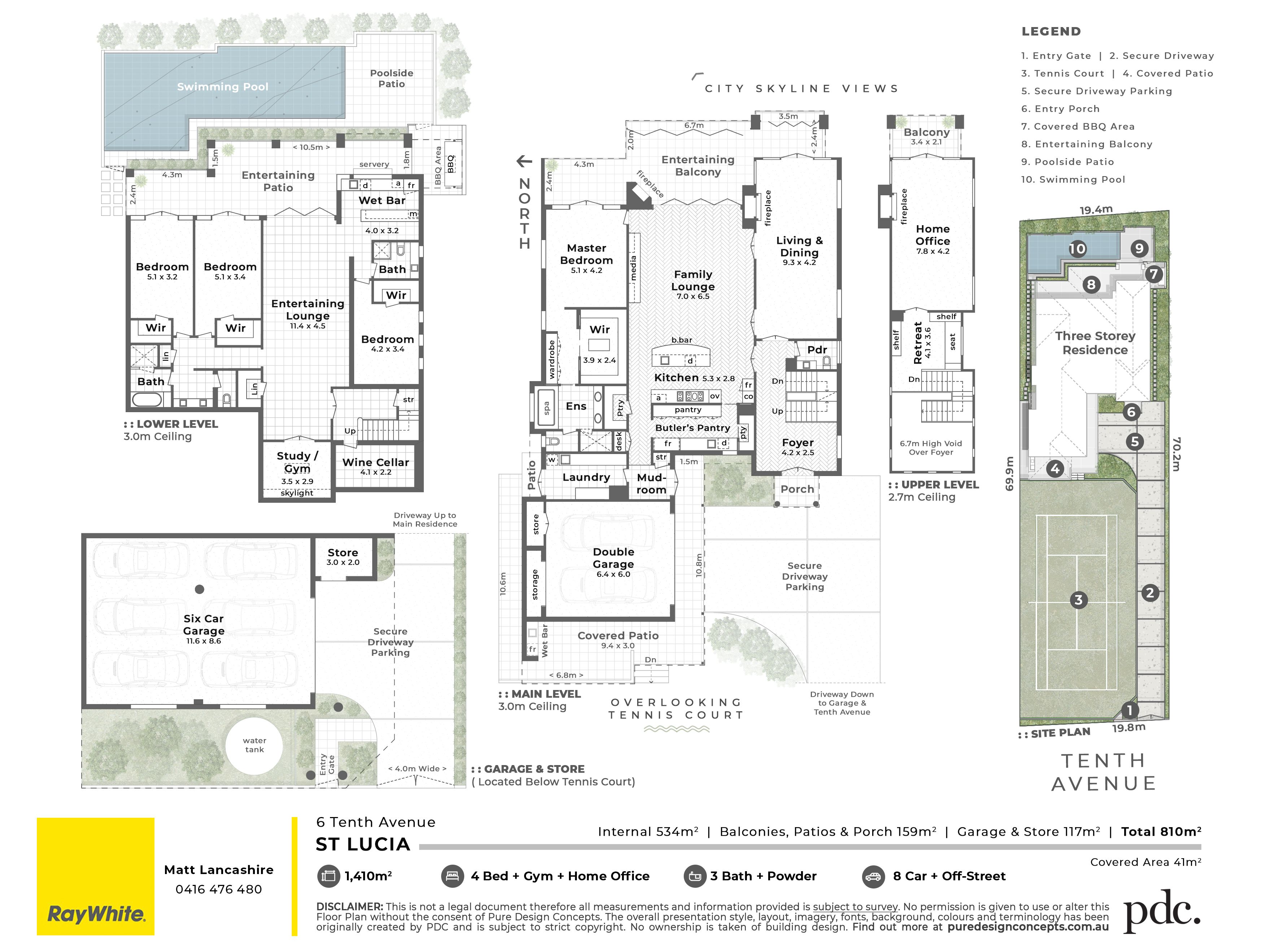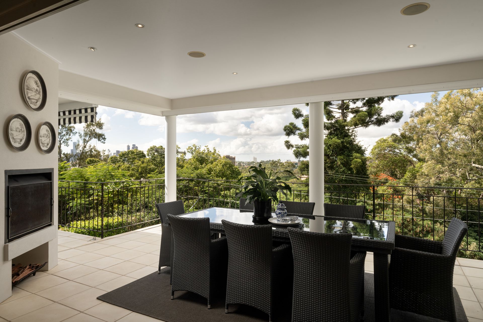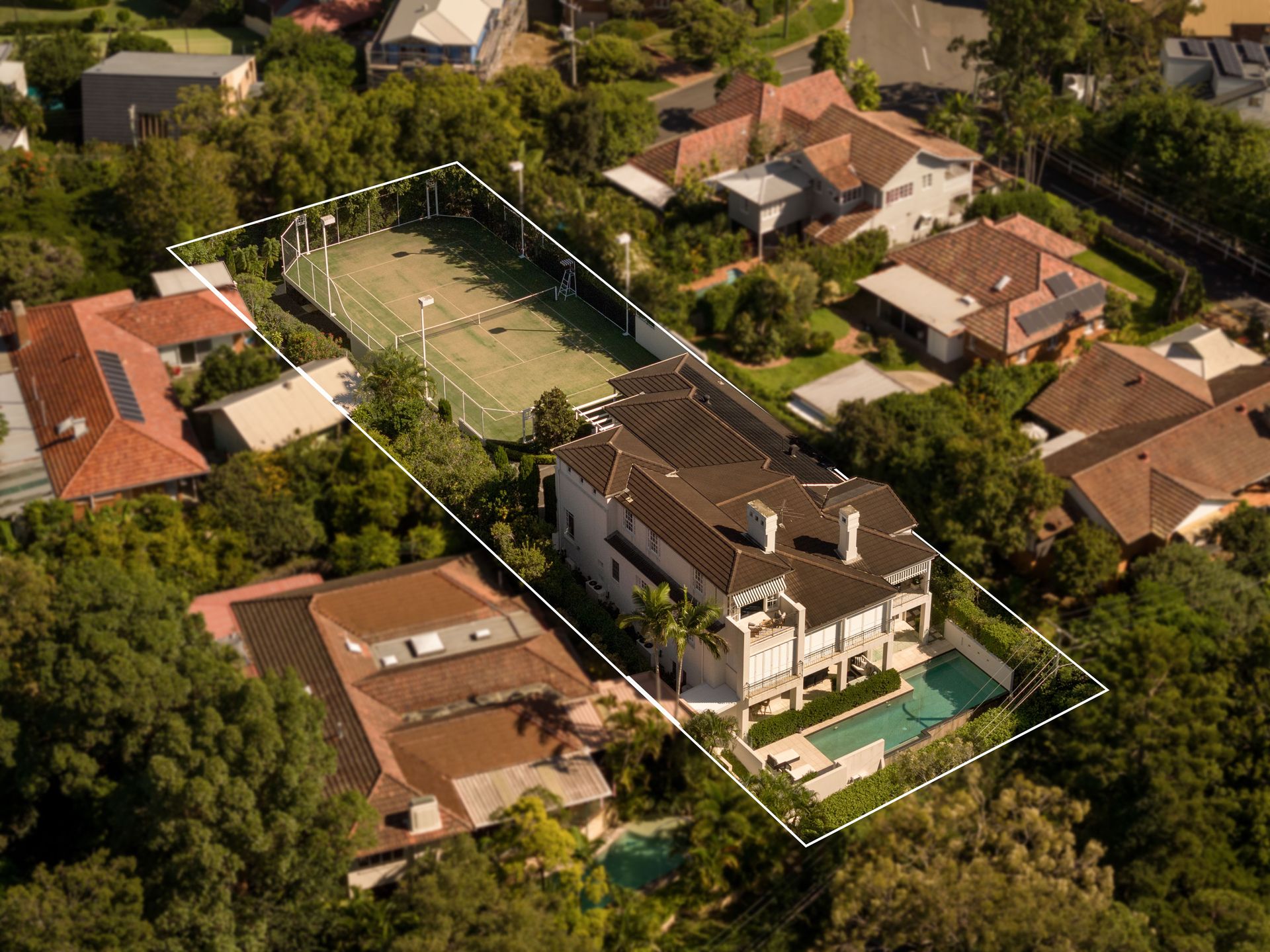 • 1,410sqm parcel with two-street access at the highest point of St Lucia • 4 bedrooms, 3 bathrooms, powder room, 8-car garage across 2 lots • Primary suite with a dressing room and luxe spa bath ensuite • Gym/study, dedicated top-floor office with city-view balcony & library • Formal lounge, living/dining area, entertainment lounge • Kitchen with butler's pantry, Miele and Liebherr appliances • Kitchenette/bar, built-in BBQ, temperature-controlled 1000-bottle wine cellar • City-view entertainer's balcony, private alfresco terrace • Full-size flood-lit tennis court, heated swimming pool • Ducted A/C, Dynalite, indoor and outdoor fireplaces • 900m to UQ, 1.2km to Guyatt Park ferry, 5.3km to CBD • Close to St Peter's, Ironside SS and Indooroopilly SHS • Proximity to St Lucia Golf Links & Indooroopilly Golf Club