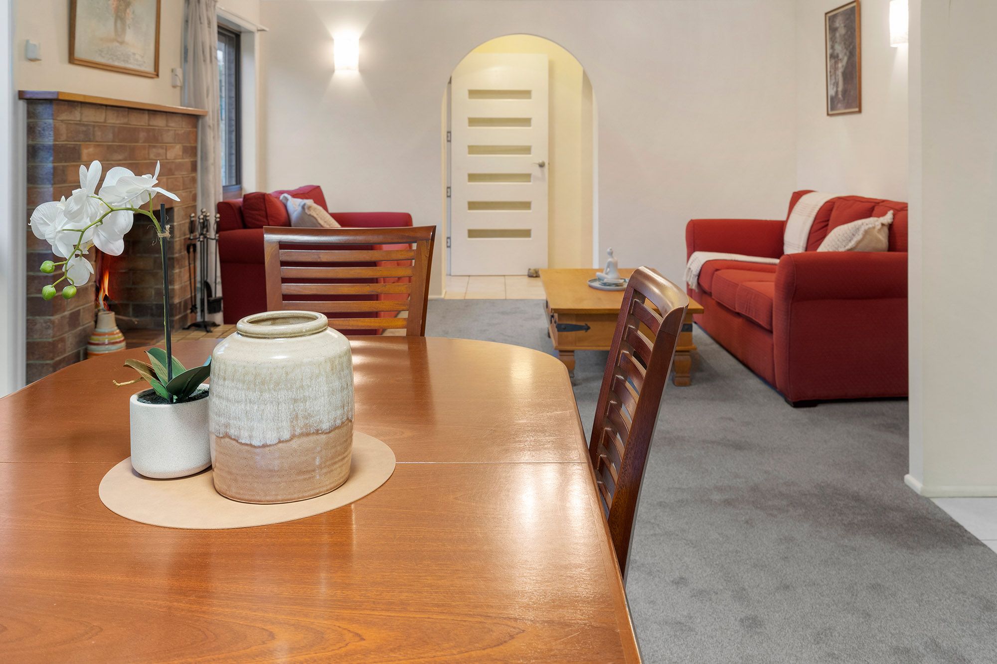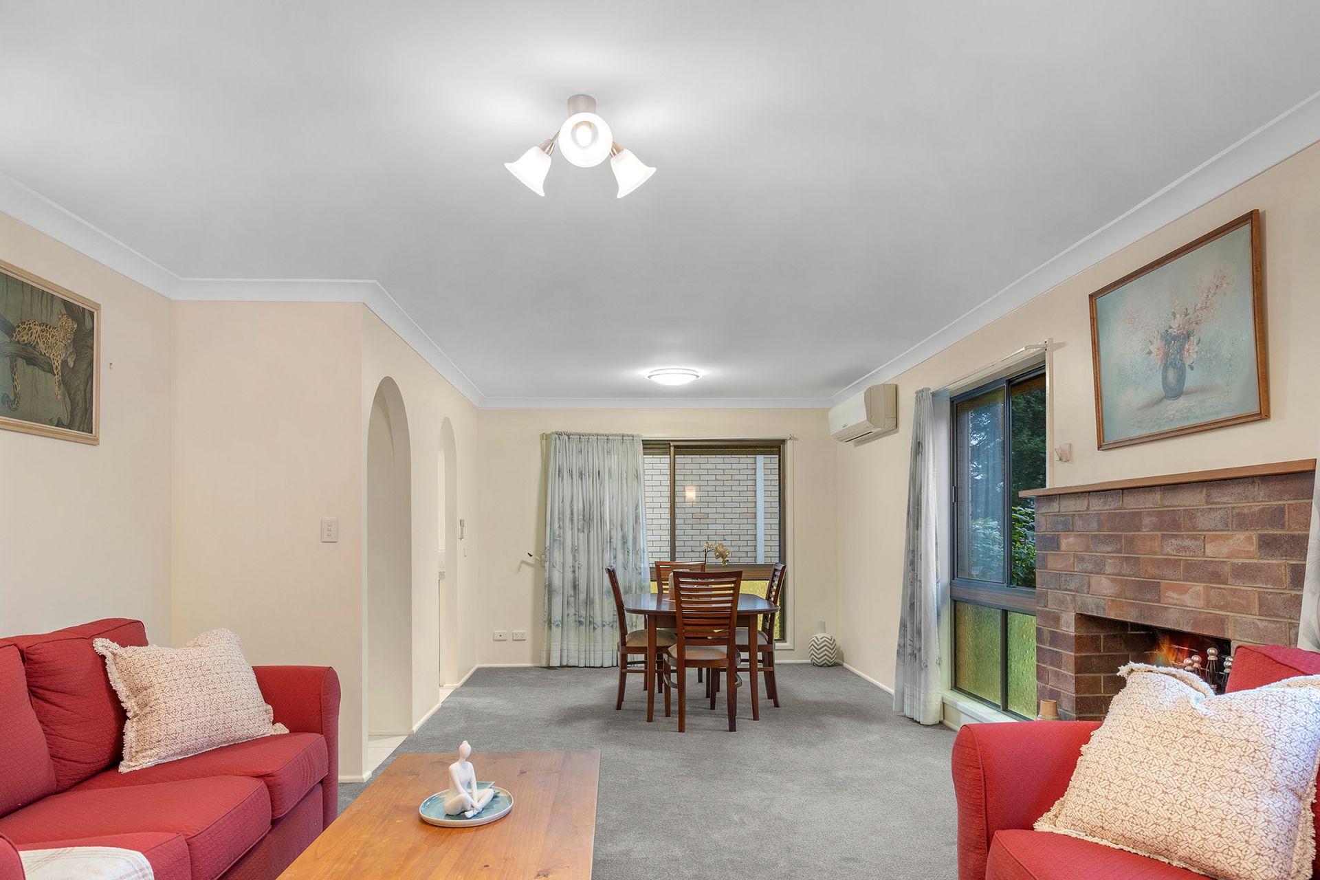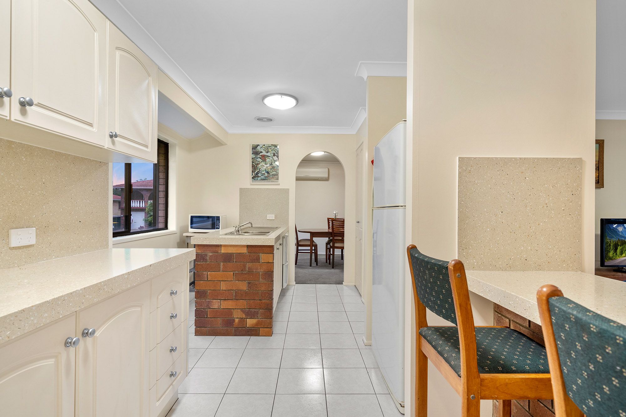 - A classic 80's archway leads into the cosy, open-plan living and dining room which features air conditioning and a stunning brick fireplace to warm the home and your guests during winter. - Trendy kitchen set up with thick stone tops and exposed brick. This long galley style has two-way entry, equipped with sleek cabinetry, freestanding cooker and integrated breakfast bar seating. - Casual living area is ideal for your media equipment, chill time watching movies or everyday gatherings with friends. - Welcoming alfresco area with overhead covering designed for outdoor entertaining. - A tiled ante-room flows from the living room and is screened in for extra security. - Fenced yard is very private and features lawns and low maintenance gardens. - Private master bedroom at back of house with a dedicated walk-in robe and tidy ensuite with tiled flooring and decent fixtures. The room is peaceful and pretty with quality carpets and blinds to windows. - Two junior bedrooms with quality carpets and shared access of the main bathroom which presents with neat appointments including tiled vanity, shoer and separate bath with and independent WC adjoining. - French-style timber and glass doors are an attractive addition from the garage linking to the alfresco area.