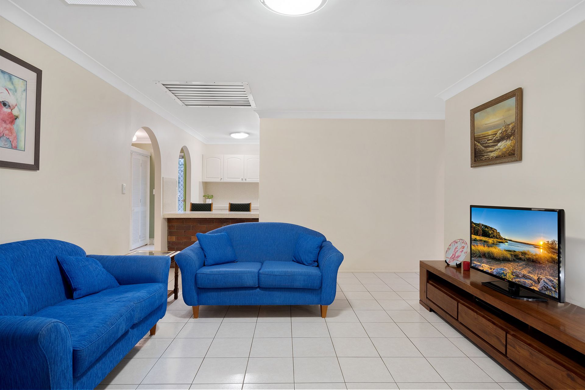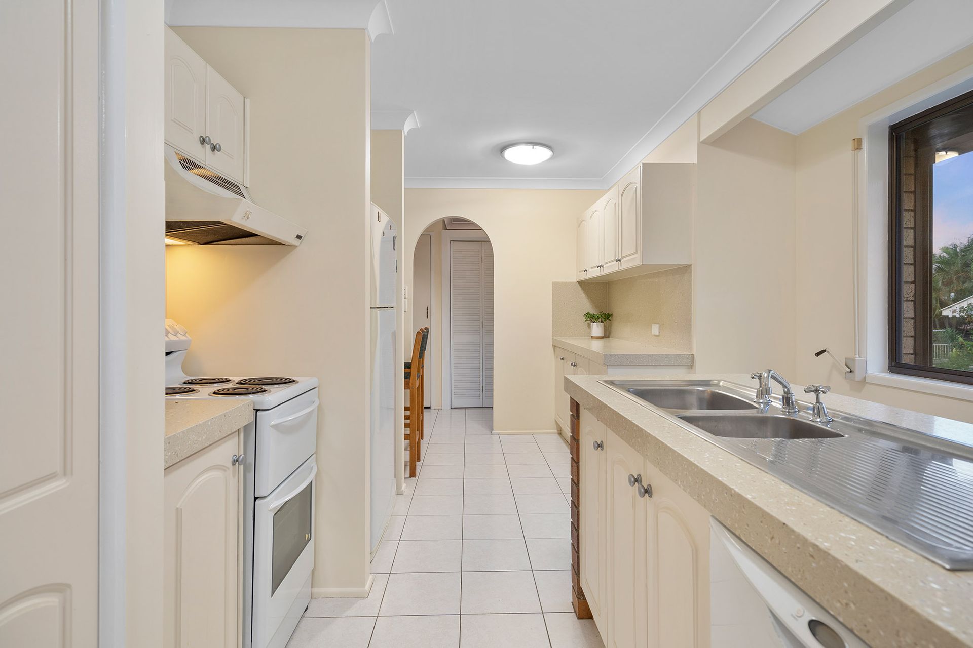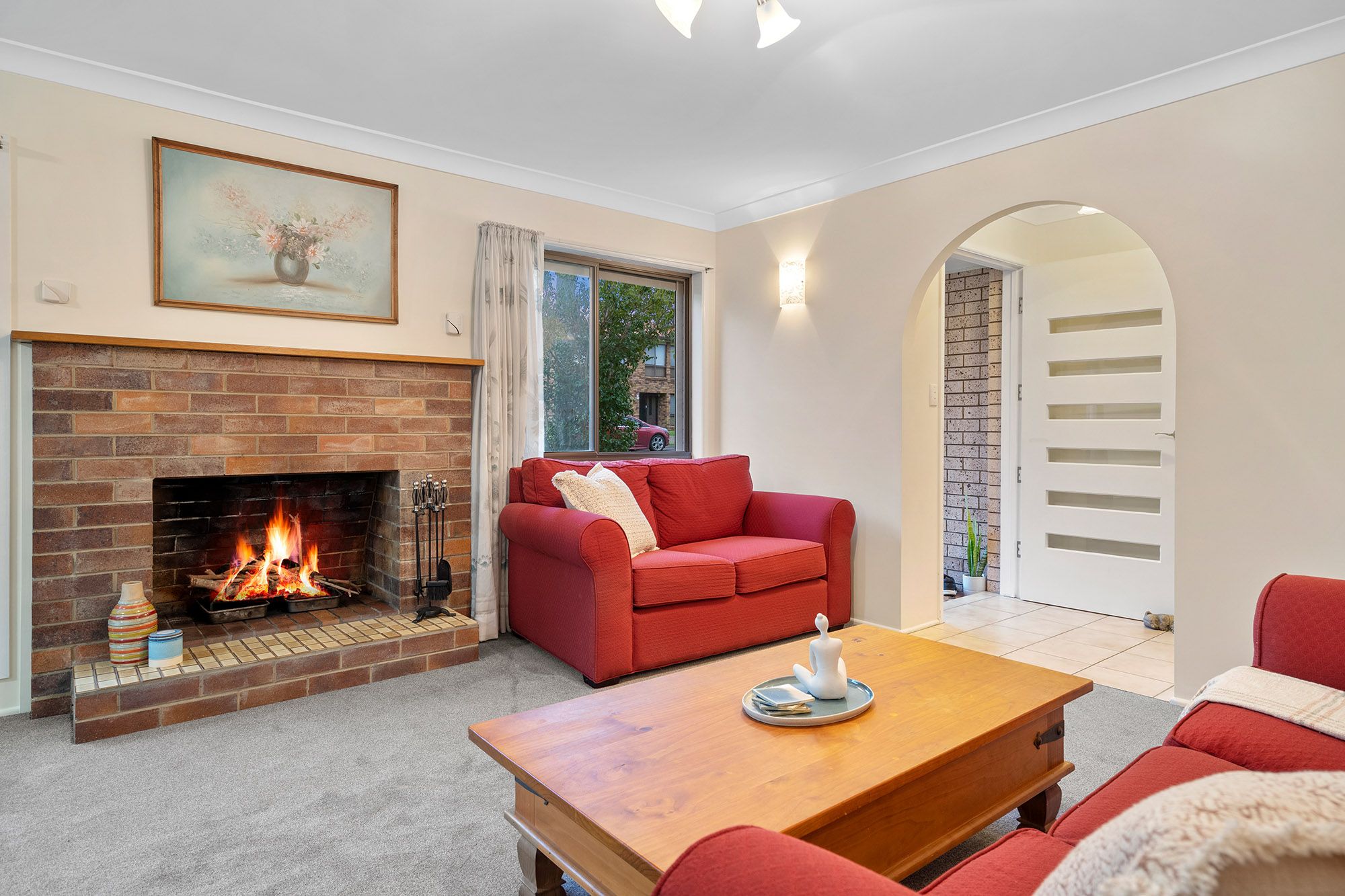 - A classic 80's archway leads into the cosy, open-plan living and dining room which features air conditioning and a stunning brick fireplace to warm the home and your guests during winter. - Trendy kitchen set up with thick stone tops and exposed brick. This long galley style has two-way entry, equipped with sleek cabinetry, freestanding cooker and integrated breakfast bar seating. - Casual living area is ideal for your media equipment, chill time watching movies or everyday gatherings with friends. - Welcoming alfresco area with overhead covering designed for outdoor entertaining. - A tiled ante-room flows from the living room and is screened in for extra security. - Fenced yard is very private and features lawns and low maintenance gardens. - Private master bedroom at back of house with a dedicated walk-in robe and tidy ensuite with tiled flooring and decent fixtures. The room is peaceful and pretty with quality carpets and blinds to windows. - Two junior bedrooms with quality carpets and shared access of the main bathroom which presents with neat appointments including tiled vanity, shoer and separate bath with and independent WC adjoining. - French-style timber and glass doors are an attractive addition from the garage linking to the alfresco area.