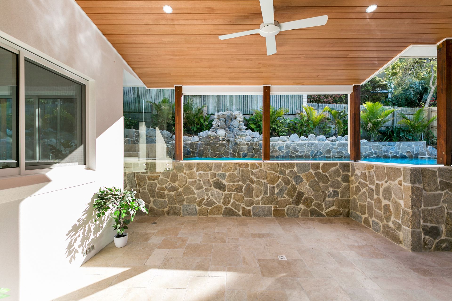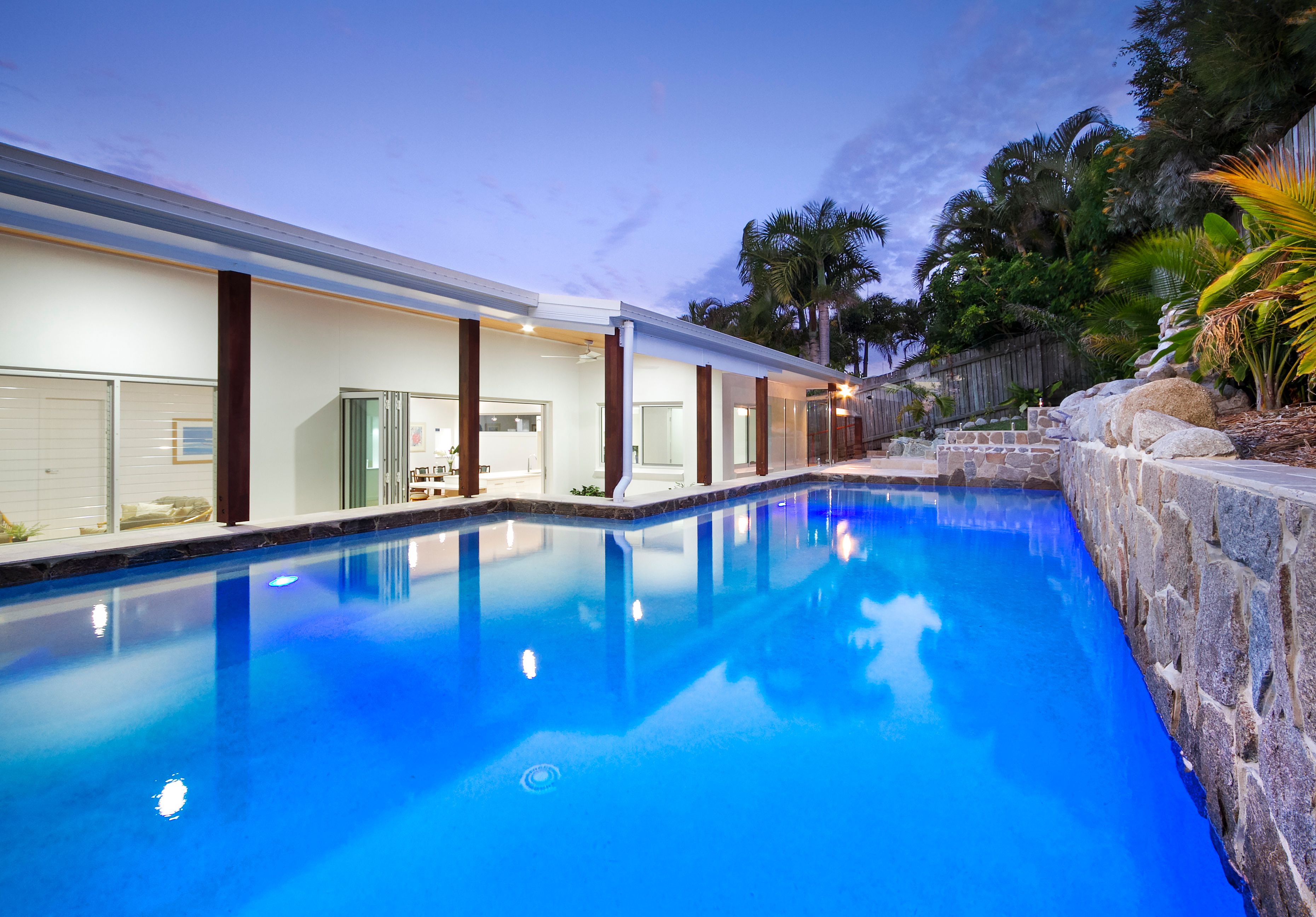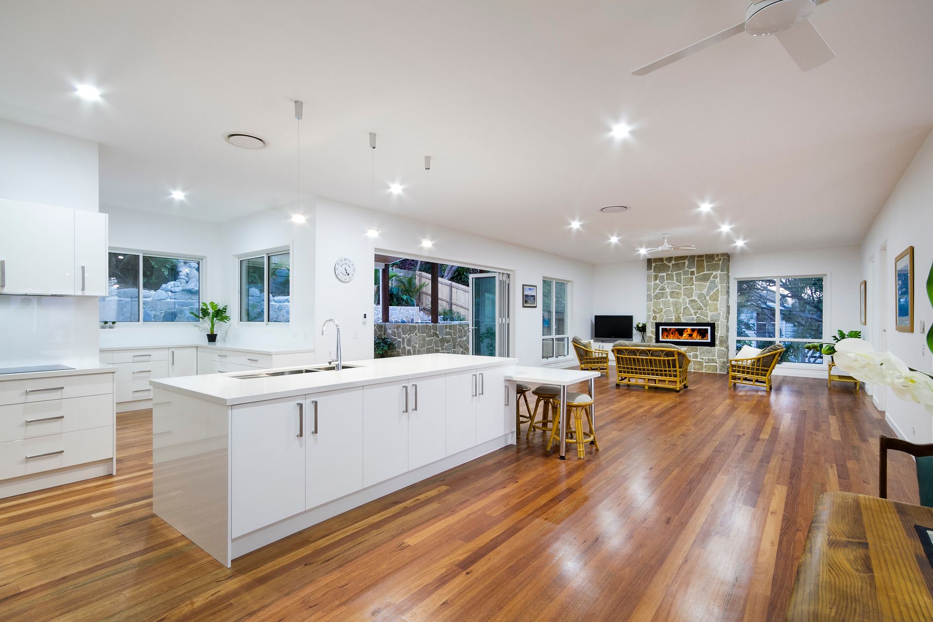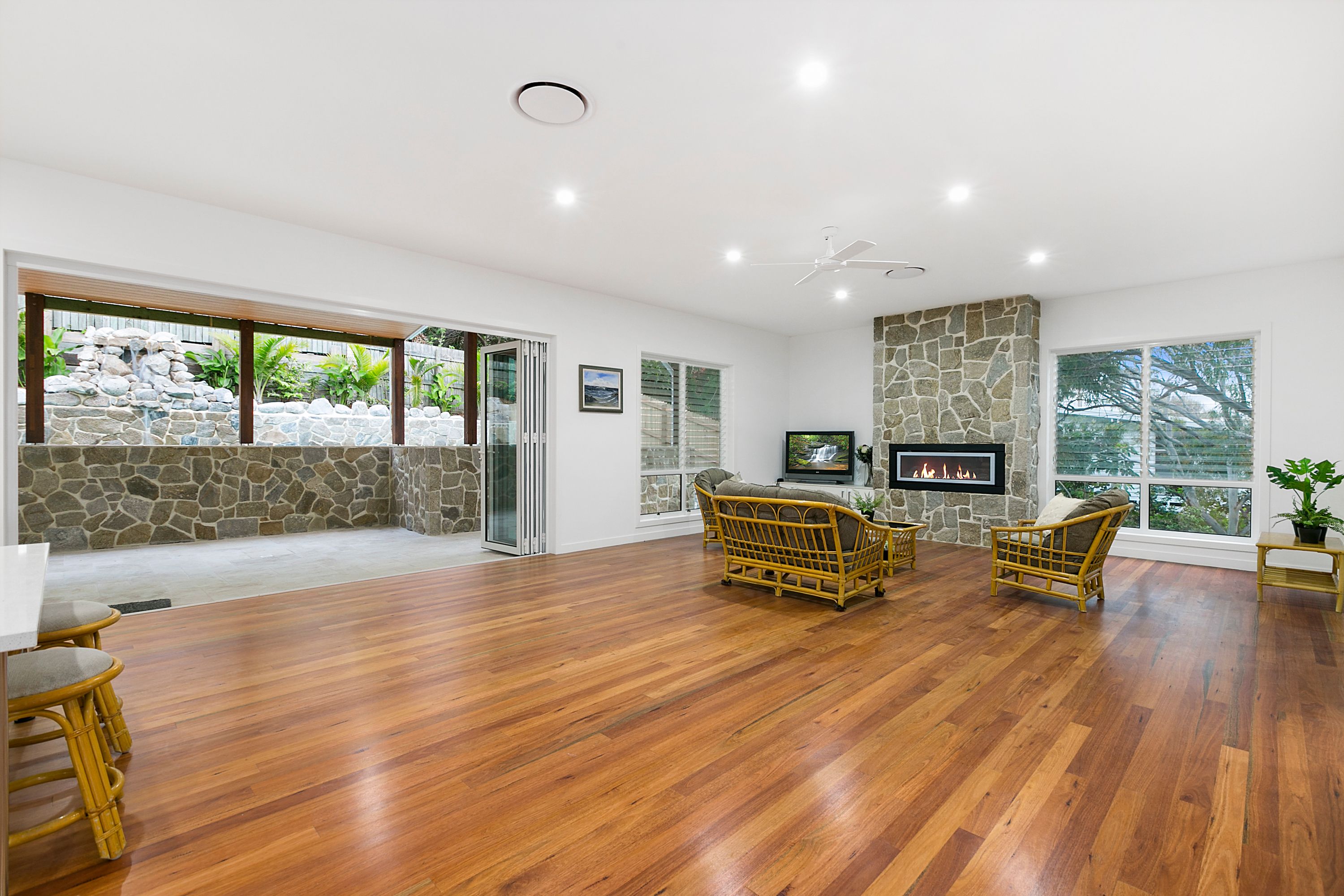 On the top floor the vast open plan living space opens to an all-weather entertaining patio and impressive pool. Another eye-catching feature in the living room is the gas log fireplace set in a floor to ceiling granite stone wall.