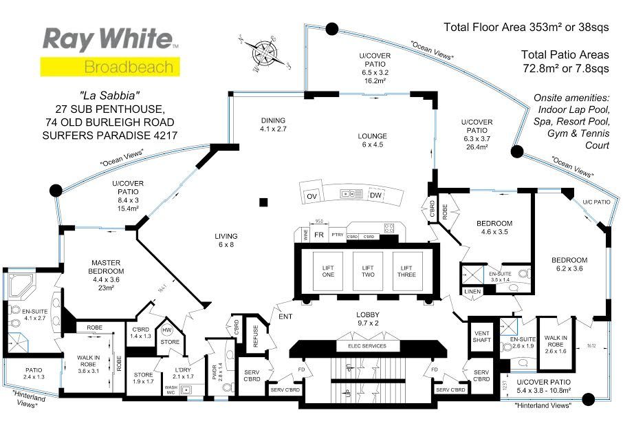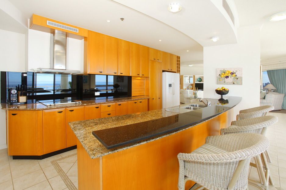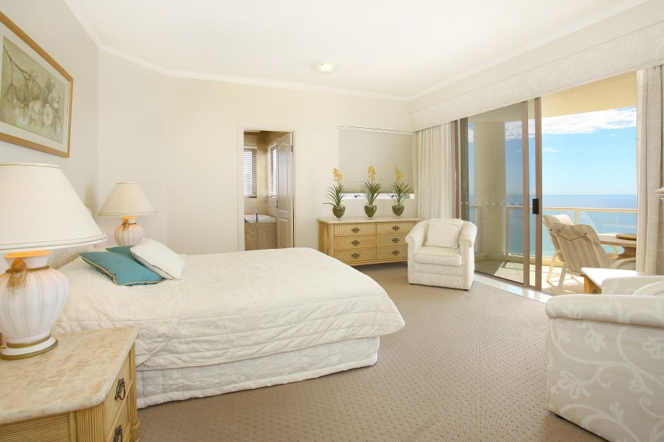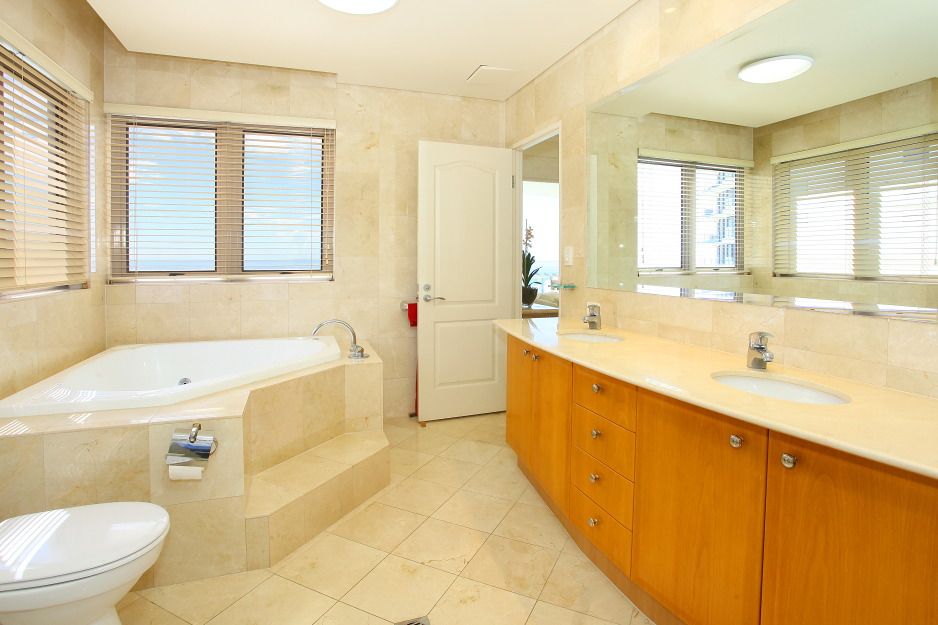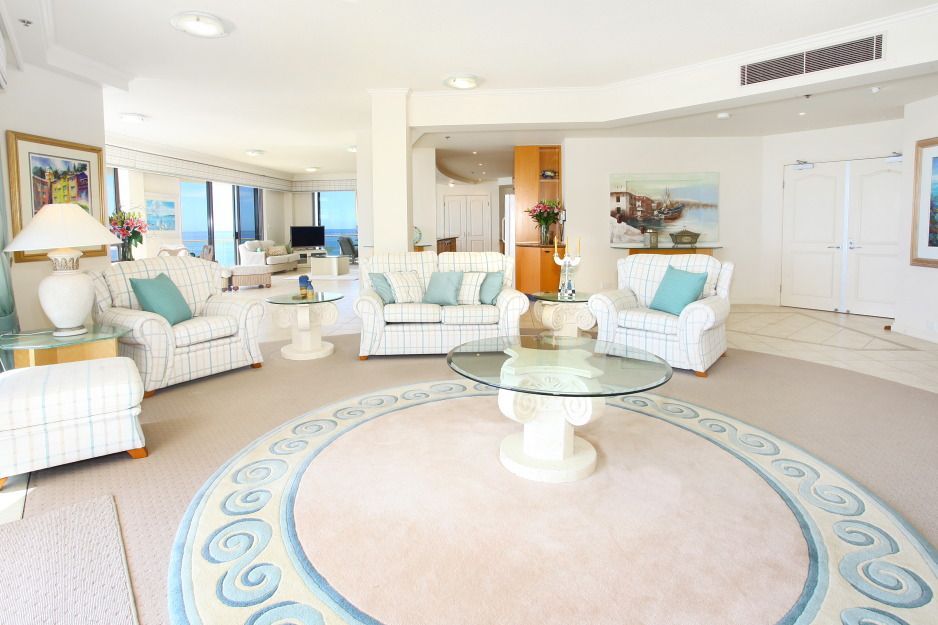• Circular formal lounge adjoins spacious dining area & huge family room • Kitchen with copious storage, large media-display unit in lounge • Warm neutral toned decor, bathrooms tiled in marble to ceiling height • Powder room & fully equipped laundry discreetly located off master wing • High ceilings, zoned ducted air conditioning, video intercom • Lock-up 2-car garage in security basement directly opposite 3 lifts • Grand port cochere entry, resident management, dining & shops nearby • Gated private access to beach, indoor heated pool, huge resort pool • Gymnasium with hot spa and saunas, tennis court, beautiful gardens • Beach walk to Surfers Paradise or Broadbeach, 5 minutes to Pacific Fair