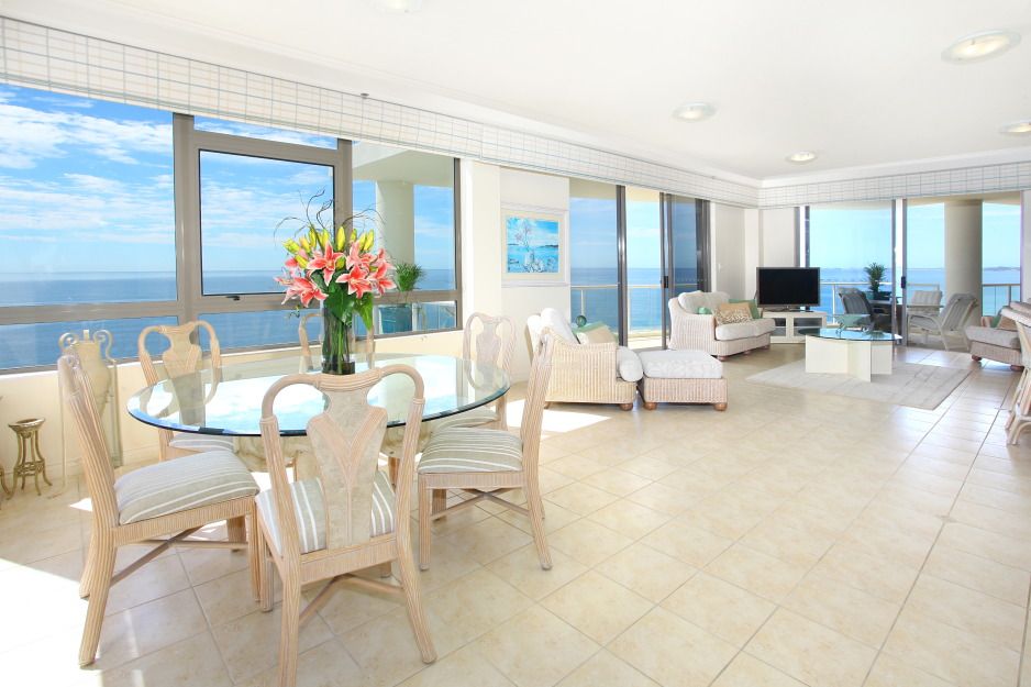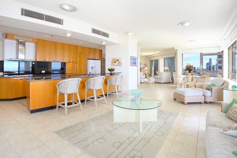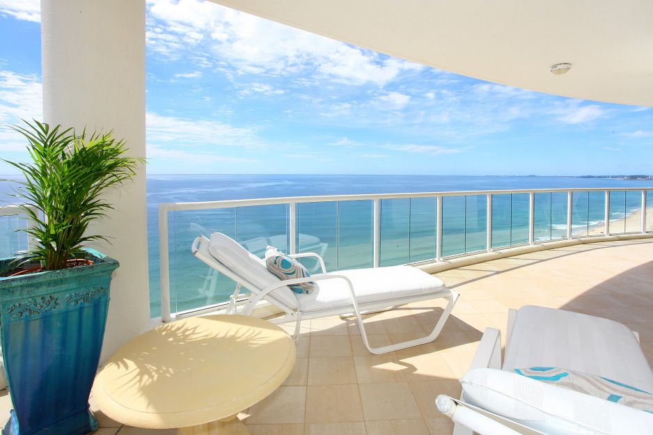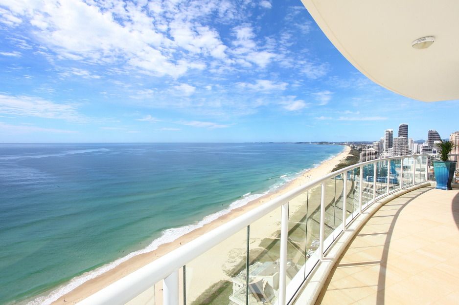 A unique opportunity now exists for fastidious buyers long seeking an elegant sub penthouse of grand proportions. La Sabbia is an iconic absolute beachfront Gold Coast land mark. Renowned for a superior level of luxury, security and fine resort facilities, making it one of the most sought-after apartment addresses on the Gold Coast. Spread across the entire 27th level this is a private haven of luxury in the sky, commanding panoramic views over the ocean, city and west to the mountains, with a spectacular sweep of golden beaches stretching to the Queensland border. The balconies ensure outdoor living is a pleasure, while indoor entertaining will be the height of elegance, with two large living areas and a central formal dining area offering bluewater views by day and sparkling city lights by night. The open plan kitchen features a large granite-topped breakfast bar and stainless steel Miele appliances. Two separate wings house 3 generous bedrooms plus a study or 4th bedroom. The master suite, in the north wing, includes a walk-in wardrobe and lavish marble ensuite with spa, shower and bidet. The adjoining study offers abundant extra robe space and with its northern aspect, would make an ideal art studio or hobby room. All bedrooms open to balconies and provide a luxury private ensuite and ocean views, including the two large guest rooms overlooking the southern Gold Coast beaches. At 353 square metres, this is a house-sized residence incorporating all the security and convenience of superior absolute beachfront high rise living.