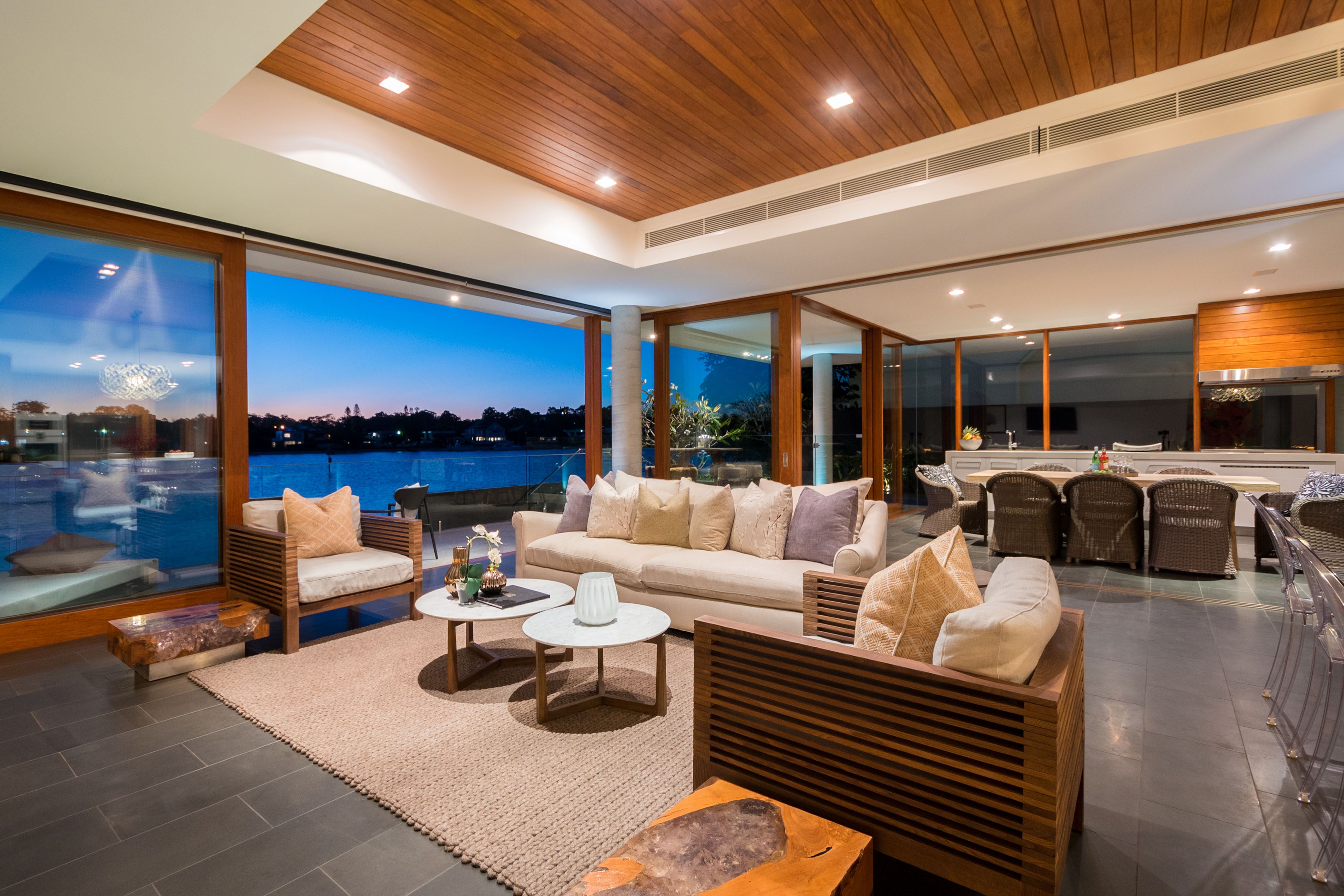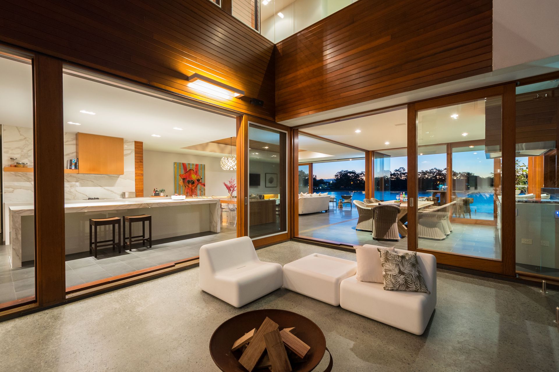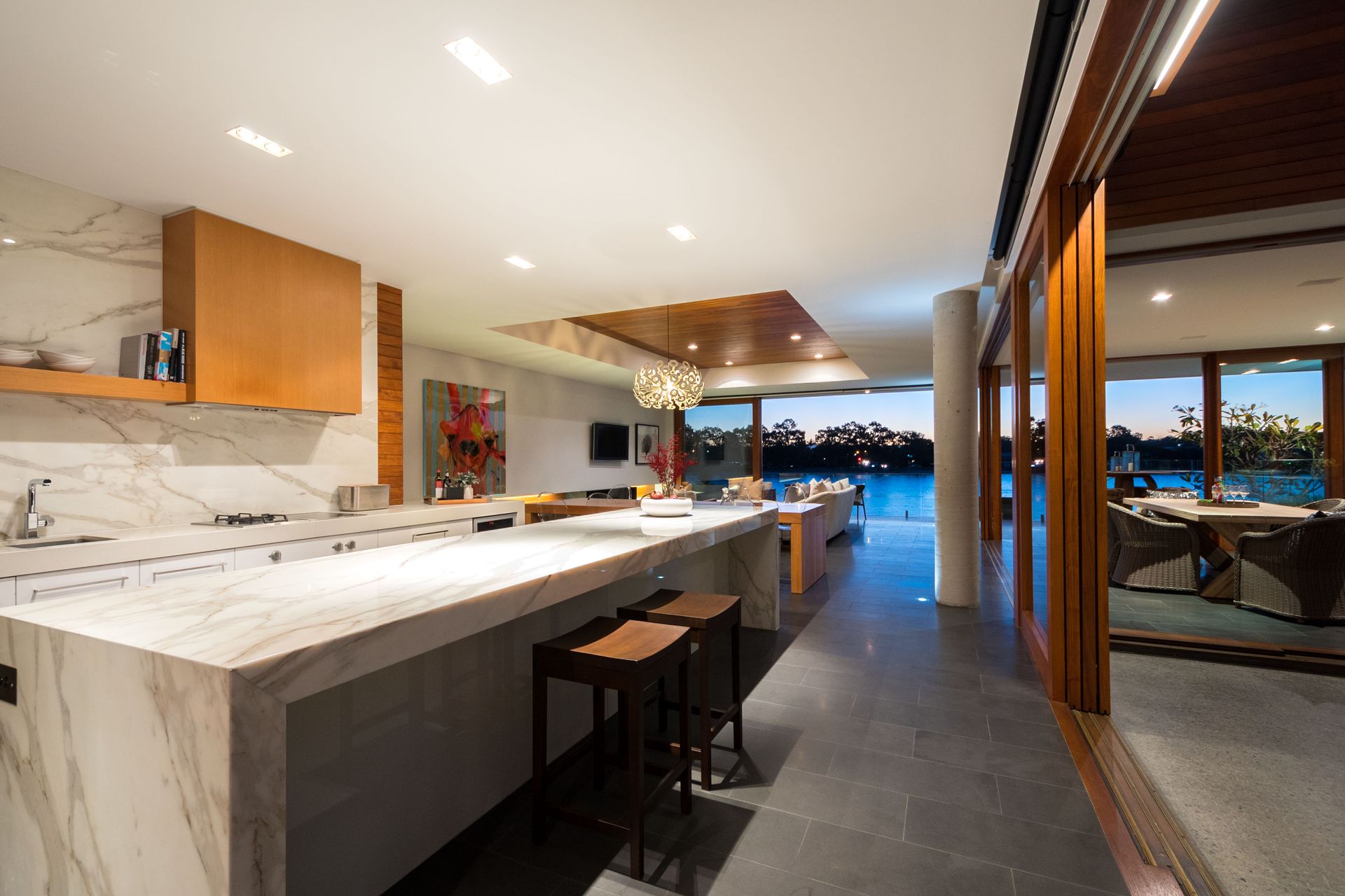 Expect to be the envy of everyone when you entertain in your deluxe kitchen, with its vast marble island bench and splashback and stainless steel appliances including the acclaimed Gaggenau oven plus steam oven and wine fridge. There is also a large butler's pantry with a dual sink and a vast space for appliances. You'll then be spoilt for choice whether to host your guests in the adjacent open plan dining and living, with its contemporary gas fireplace, leading to the deck with wide water views or perhaps the covered alfresco entertaining area, with its superior outdoor kitchen, nestled next to the inviting 17m lap pool.